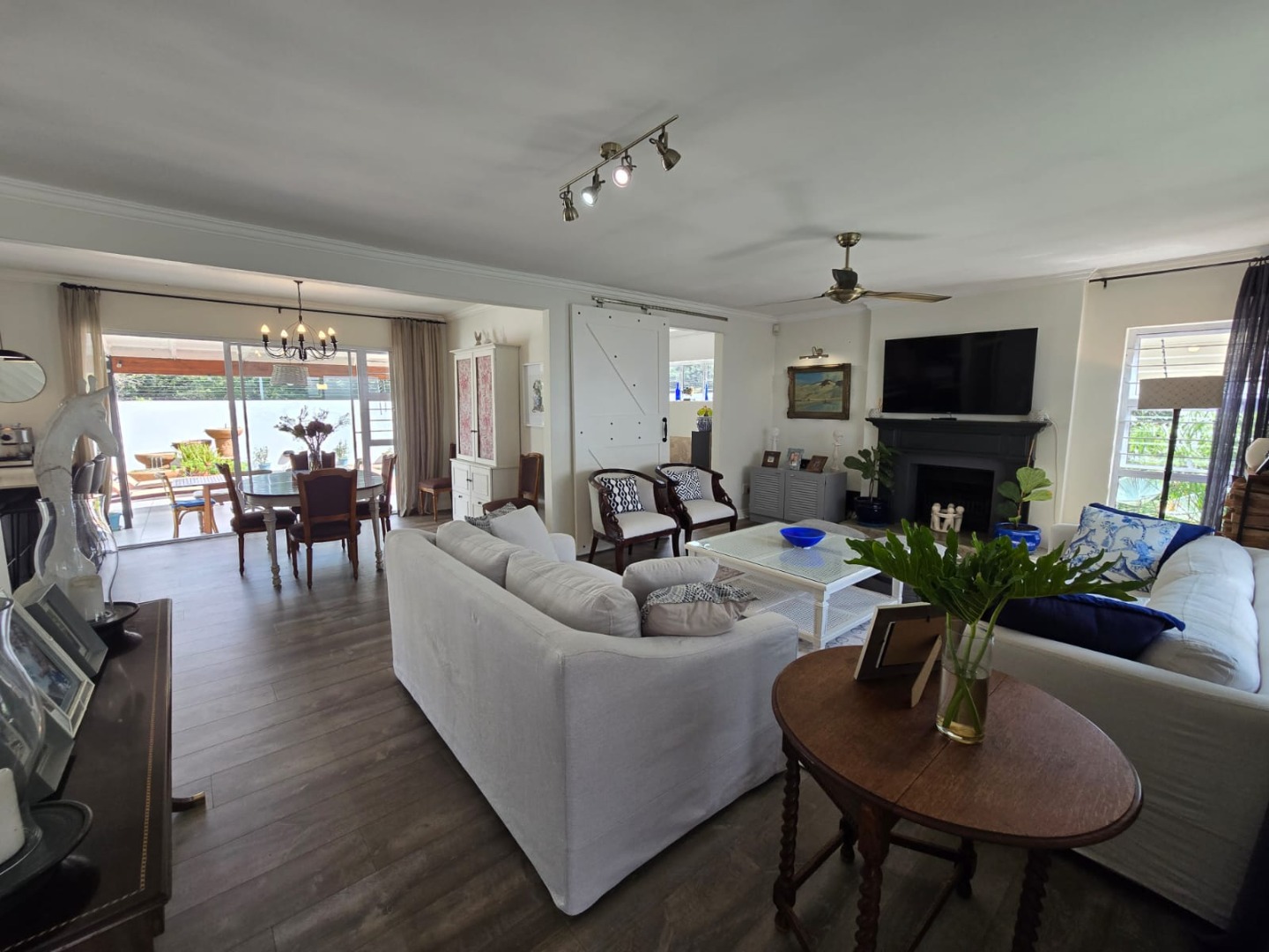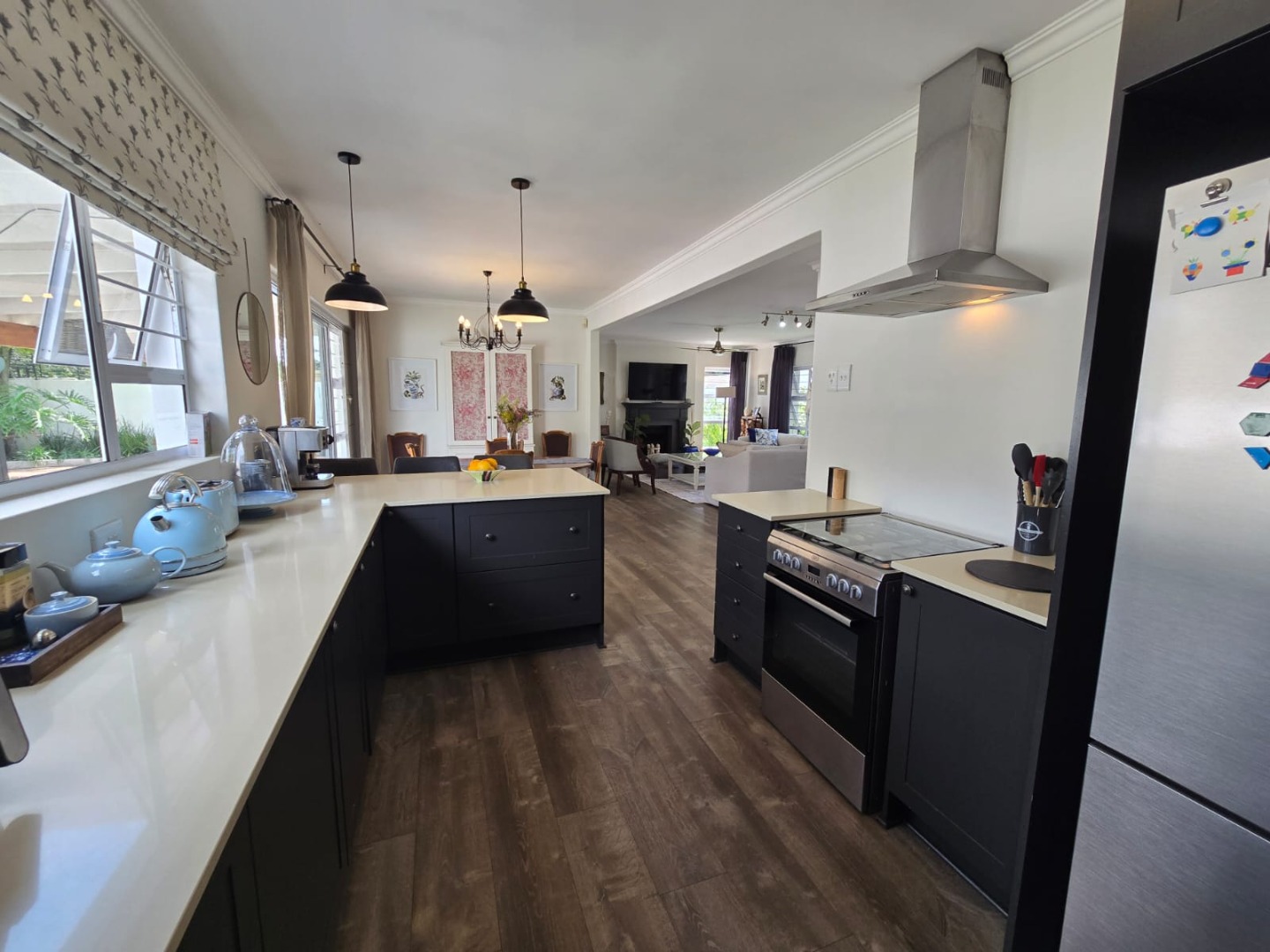 Step inside and you'll find a bright and airy open-plan living, dining, and kitchen area, perfect for everyday life and entertaining. The modern vinyl flooring flows beautifully throughout, and there's a wood fireplace for those cooler evenings. The kitchen is a real highlight with its sleek dark cabinetry, light countertops, and a handy breakfast bar. Plus, it comes with integrated appliances like a washing machine and dishwasher, and even has a pantry for extra storage. You'll also find a dedicated office or study space, which even has direct access to the pool area – talk about a great work-from-home setup!