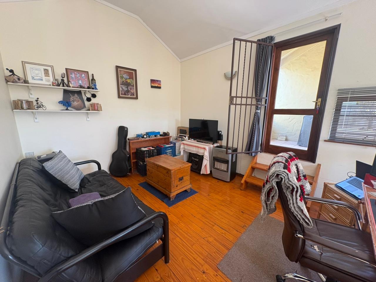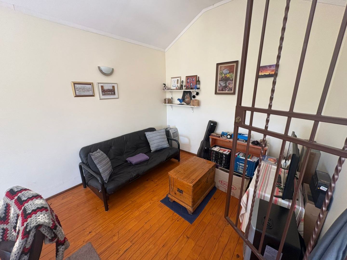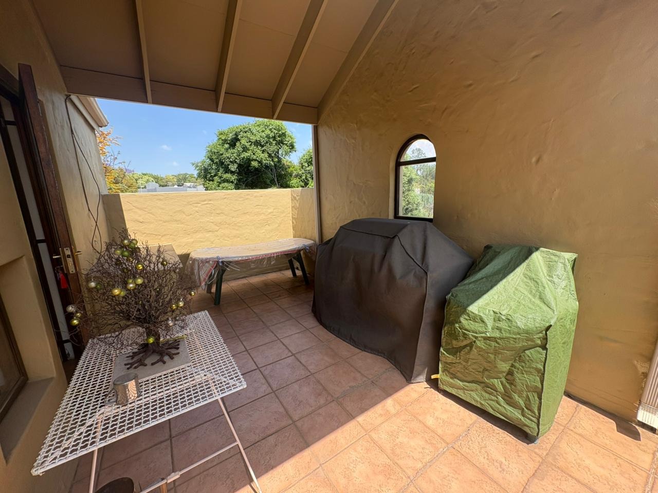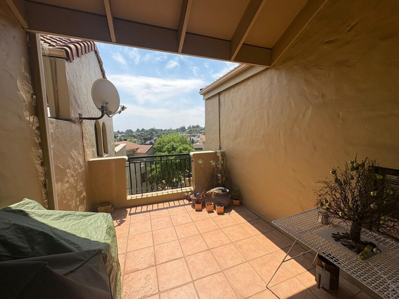 This inviting 1.5-bedroom, 1-bathroom (Shower and Bath Tub) apartment in River Club, Sandton, offers a comfortable and functional living space. The open-plan design seamlessly connects the lounge and dining areas, enhanced by high ceilings featuring exposed beams that add character and a sense of spaciousness. Tiled flooring throughout ensures easy maintenance. Natural light floods the interior through a large arched window and glass sliding doors, which open directly onto a private balcony, perfect for relaxation or entertaining with its built-in braai. A well-appointed kitchen serves the living space, and a wooden staircase leads to the upper level, suggesting a versatile half-bedroom or study area.