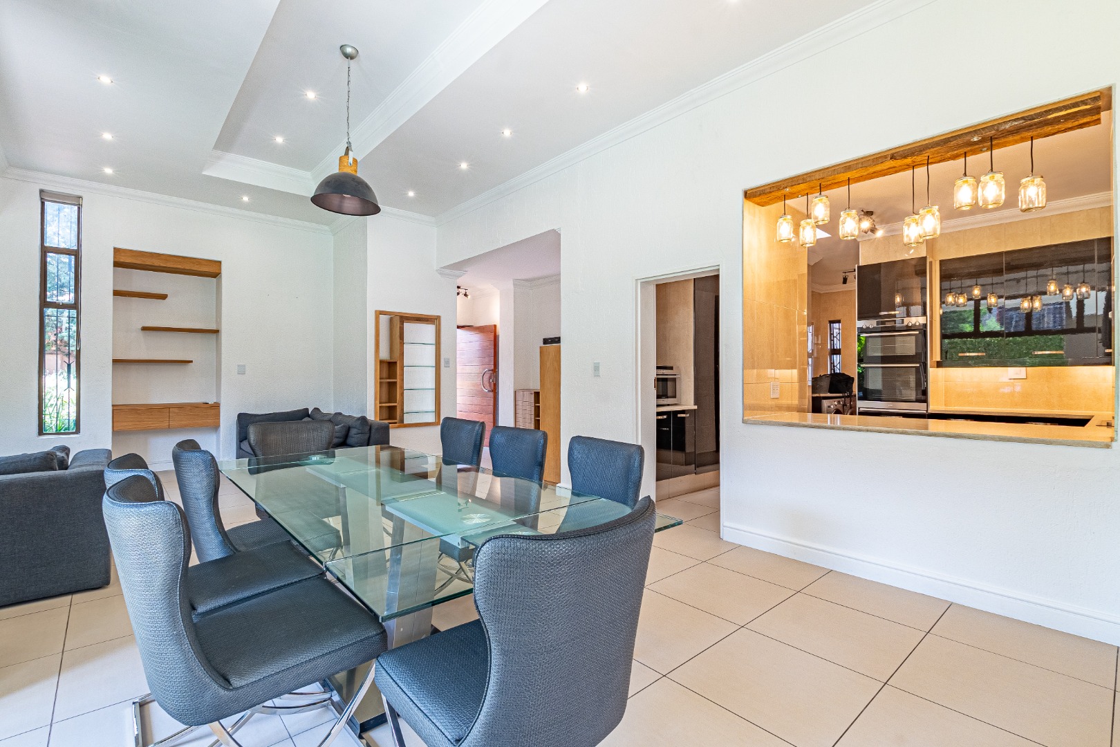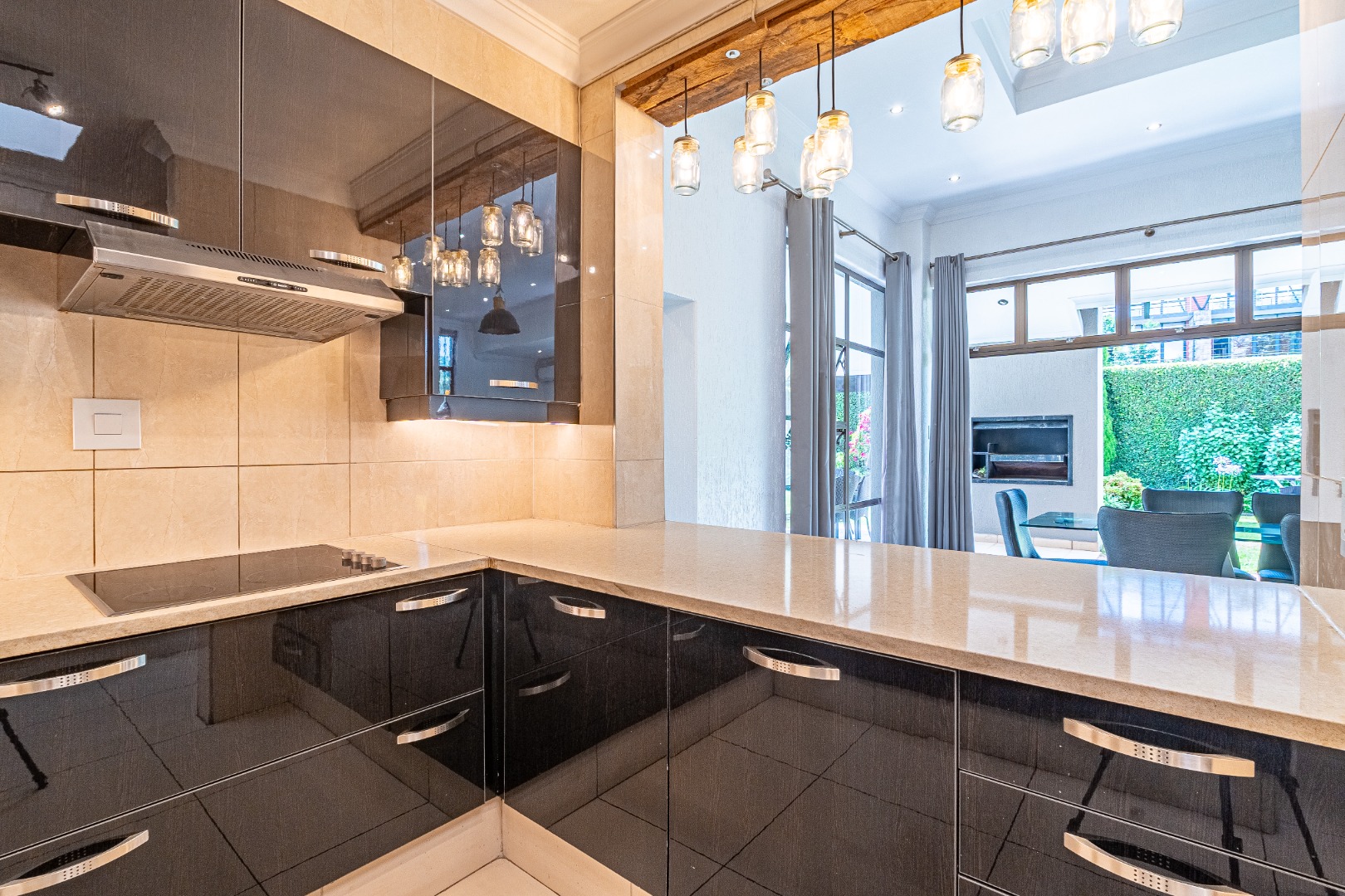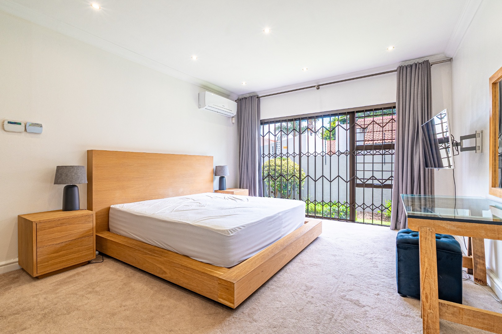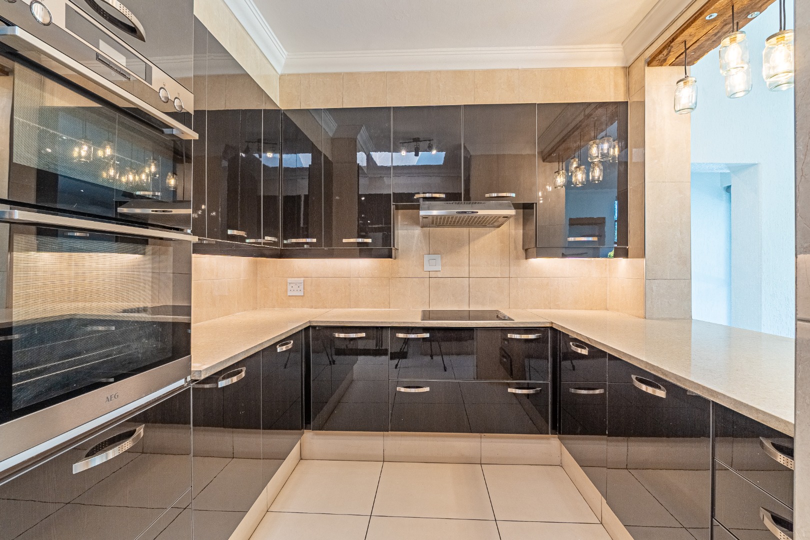 This modern, furnished 3-bedroom, 2.5-bathroom residence in Sandown offers an exceptional rental opportunity. Spanning 276 sqm, the home features a contemporary open-plan layout, seamlessly connecting the lounge, dining room, and a state-of-the-art kitchen. The kitchen boasts sleek glossy black cabinetry, integrated double ovens, a hob, and ample U-shaped countertop space with under-cabinet lighting. Throughout, elegant tiled flooring, a neutral colour palette, create a bright and inviting atmosphere. A dedicated study provides a quiet space for work.