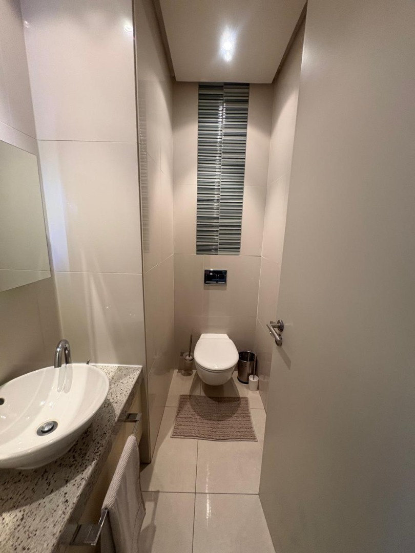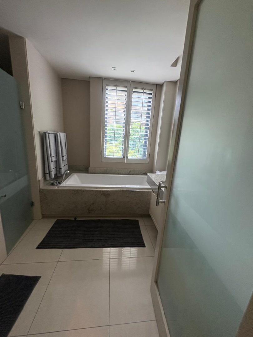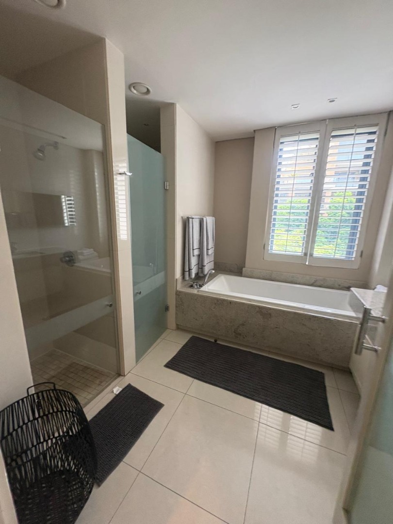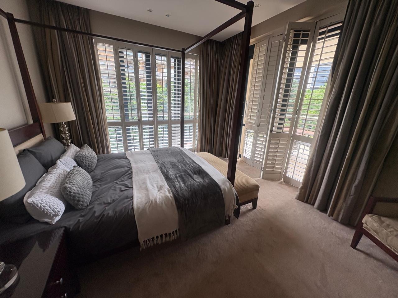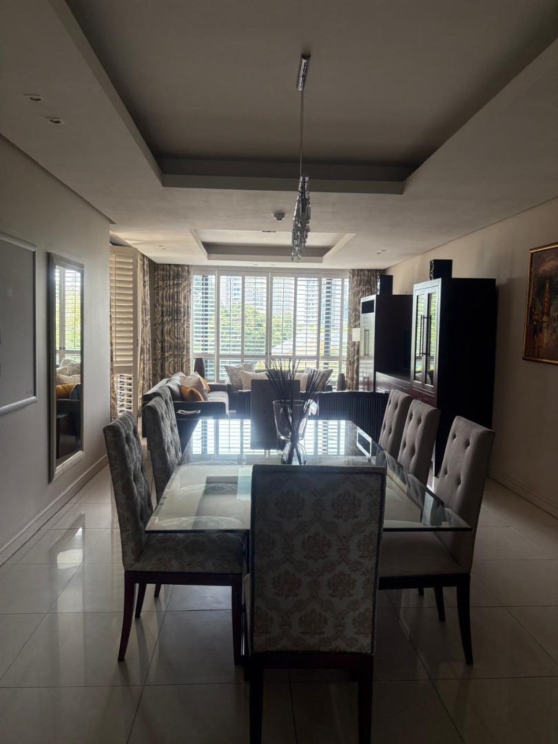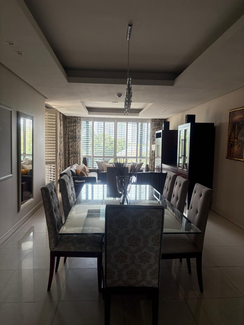 Discover sophisticated living in this spacious 2-bedroom, 2-bathroom apartment, ideally situated in the heart of Sandton Central. Spanning 140 square metres, this fully furnished residence offers a seamless blend of comfort and convenience, perfect for professionals. The open-plan living and dining areas are designed for modern living, featuring elegant tiled flooring, recessed lighting, and large windows adorned with stylish plantation shutters that invite ample natural light.