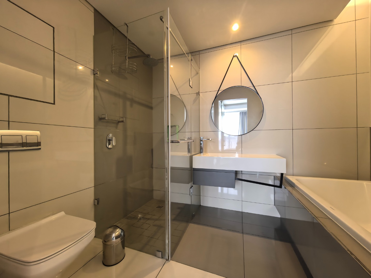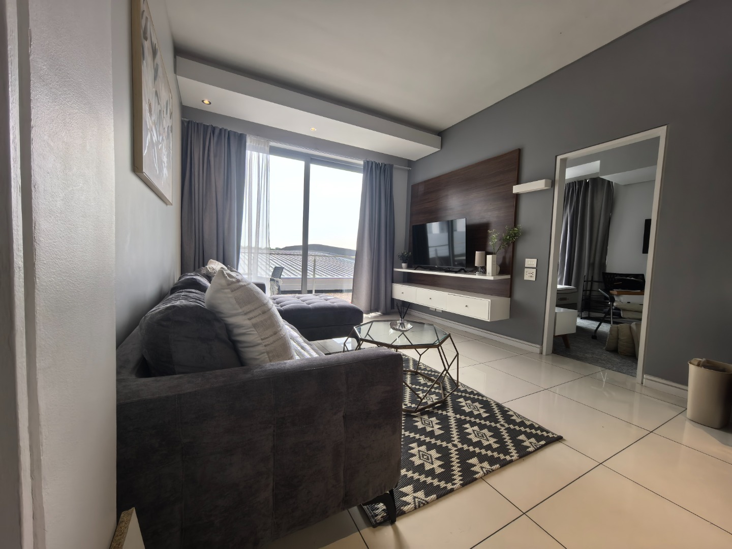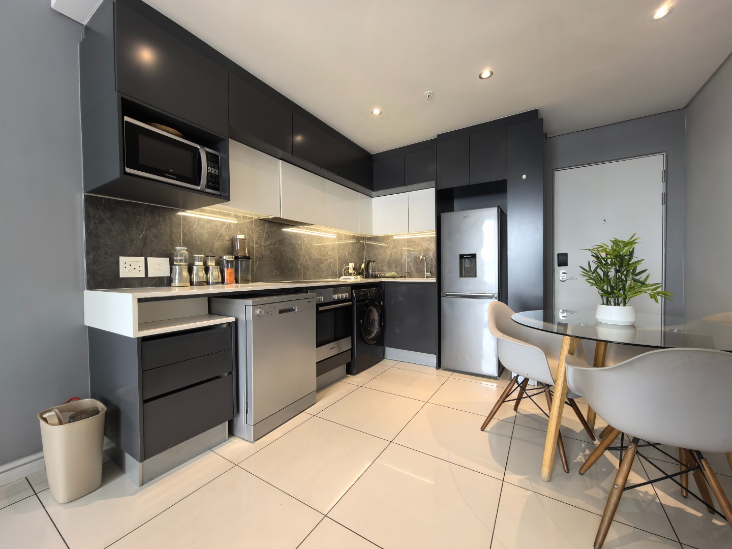 Discover modern urban living in this fully furnished 2-bedroom, 2-bathroom apartment located in the vibrant Sandton Central. Spanning 79 square metres, this contemporary residence offers an open-plan layout designed for comfort and style. The living area is bathed in natural light, featuring sleek finishes, a wall-mounted TV unit, and seamless access to a private balcony, perfect for enjoying distant views. The well-appointed kitchen boasts dark grey and white cabinetry, a stylish marble-look backsplash, and integrated under-cabinet lighting. It comes fully equipped with modern stainless steel appliances, including a large fridge, microwave, oven, dishwasher, and washing machine, catering to all your culinary needs. A compact dining area provides a convenient space for meals. Both bedrooms are designed with a modern aesthetic, featuring large windows that invite ample natural light, comfortable sleeping arrangements, and built-in storage solutions. Each bedroom benefits from its own en-suite bathroom, complete with contemporary fixtures, glass-enclosed showers, floating vanities, and one offering a relaxing bathtub. The apartment also includes air conditioning for year-round comfort. Residents of this property enjoy access to exceptional communal amenities, including a luxurious infinity-edge swimming pool, a relaxing hot tub, and a well-equipped gym. With 24-hour security and a dedicated security post, peace of mind is assured. The unit also provides two dedicated parking bays and is fibre-ready, ensuring seamless connectivity. Sandton Central is a premier metropolitan hub in South Africa, renowned for its bustling business district, upscale shopping centres, fine dining establishments, and vibrant nightlife. Its central location offers unparalleled convenience and a dynamic lifestyle for professionals and urban dwellers. Key Features: * Fully furnished 2-bedroom, 2-bathroom apartment * 79 sqm floor size with open-plan living * Modern kitchen with integrated appliances * Private balcony with distant views * Air conditioning and fibre-ready connectivity * Access to infinity-edge pool, hot tub, and gym * 24-hour security and two parking bays * Wheelchair friendly access