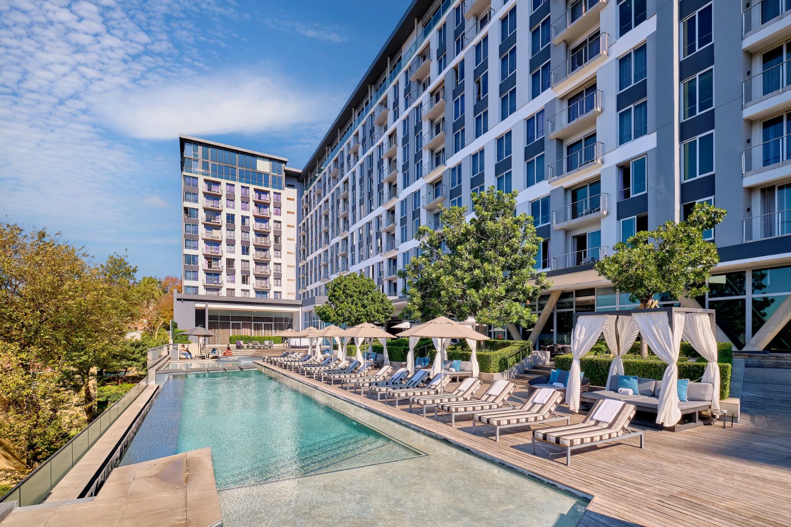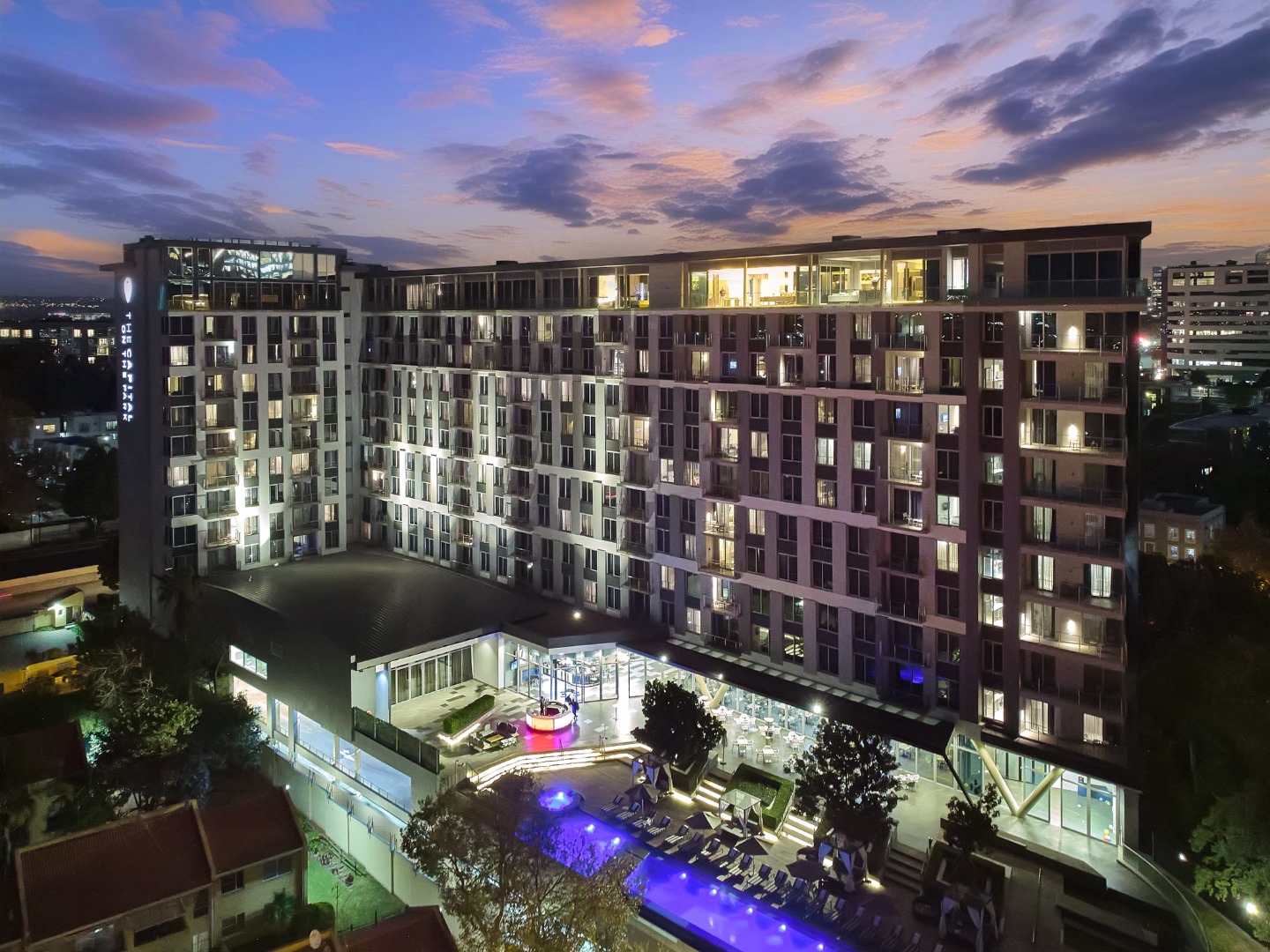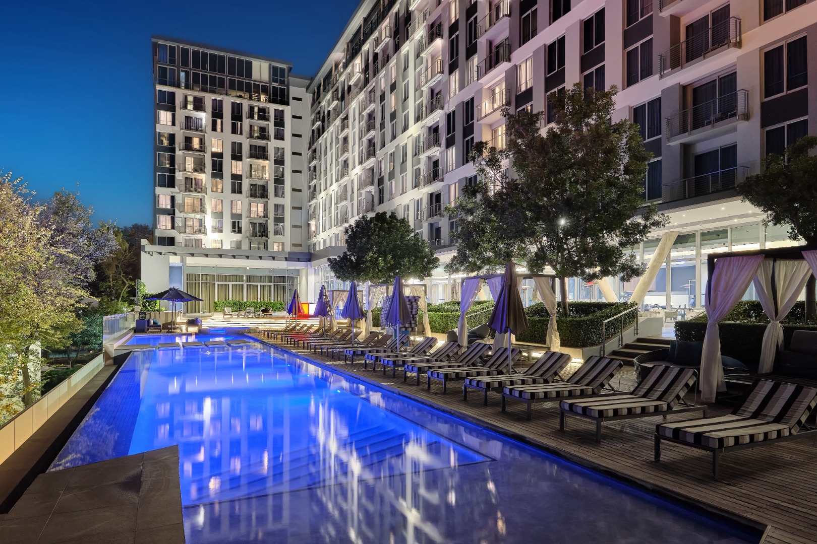 Discover modern urban living in this fully furnished 2-bedroom, 2-bathroom apartment located in the vibrant Sandton Central. Spanning 79 square metres, this contemporary residence offers an open-plan layout designed for comfort and style. The living area is bathed in natural light, featuring sleek finishes, a wall-mounted TV unit, and seamless access to a private balcony, perfect for enjoying distant views. The well-appointed kitchen boasts dark grey and white cabinetry, a stylish marble-look backsplash, and integrated under-cabinet lighting. It comes fully equipped with modern stainless steel appliances, including a large fridge, microwave, oven, dishwasher, and washing machine, catering to all your culinary needs. A compact dining area provides a convenient space for meals. Both bedrooms are designed with a modern aesthetic, featuring large windows that invite ample natural light, comfortable sleeping arrangements, and built-in storage solutions. Each bedroom benefits from its own en-suite bathroom, complete with contemporary fixtures, glass-enclosed showers, floating vanities, and one offering a relaxing bathtub. The apartment also includes air conditioning for year-round comfort. Residents of this property enjoy access to exceptional communal amenities, including a luxurious infinity-edge swimming pool, a relaxing hot tub, and a well-equipped gym. With 24-hour security and a dedicated security post, peace of mind is assured. The unit also provides two dedicated parking bays and is fibre-ready, ensuring seamless connectivity. Sandton Central is a premier metropolitan hub in South Africa, renowned for its bustling business district, upscale shopping centres, fine dining establishments, and vibrant nightlife. Its central location offers unparalleled convenience and a dynamic lifestyle for professionals and urban dwellers. Key Features: * Fully furnished 2-bedroom, 2-bathroom apartment * 79 sqm floor size with open-plan living * Modern kitchen with integrated appliances * Private balcony with distant views * Air conditioning and fibre-ready connectivity * Access to infinity-edge pool, hot tub, and gym * 24-hour security and two parking bays * Wheelchair friendly access