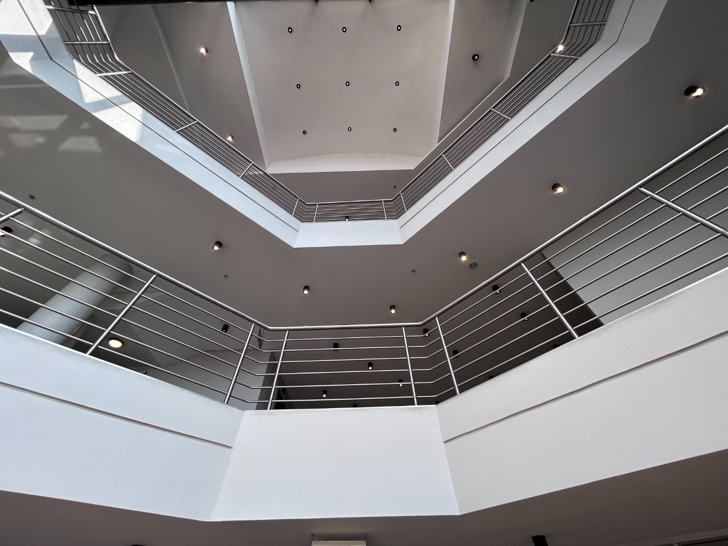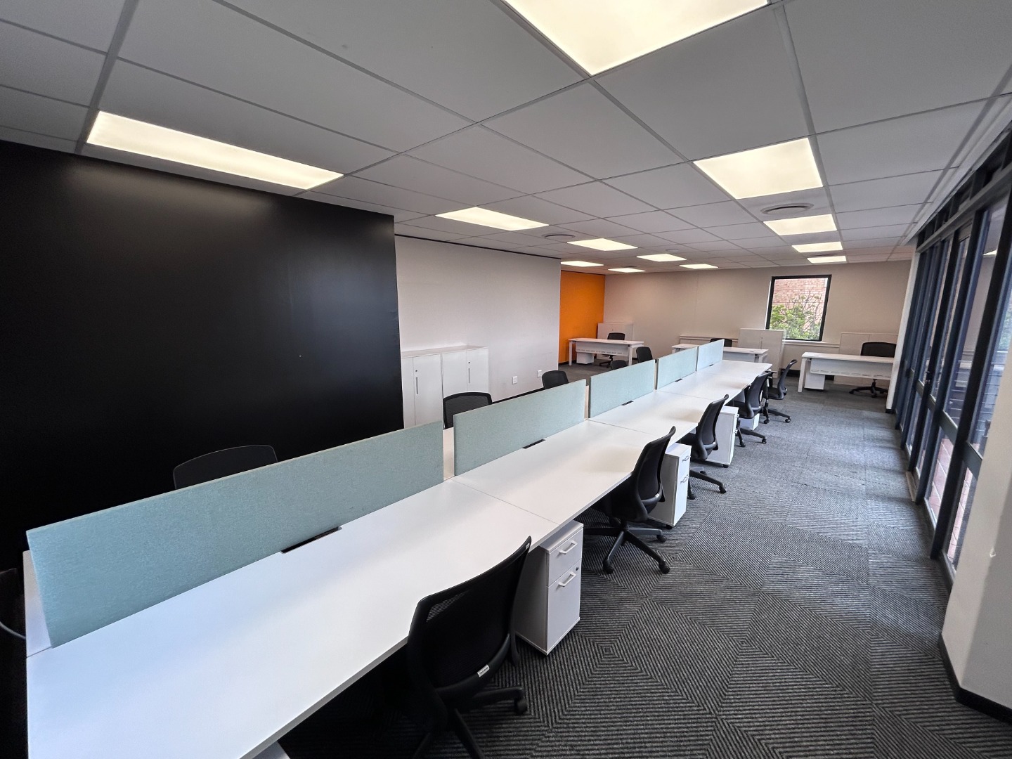 Layout: Reception, 8-seater boardroom, open-plan office, 13 desks, storage cabinets, and its own private balcony.