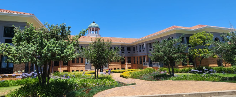 Landscaped gardens with tranquil green spaces and mature trees