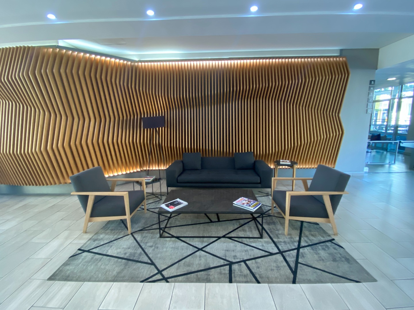 Modern reception with various glass-fronted meeting rooms/offices.