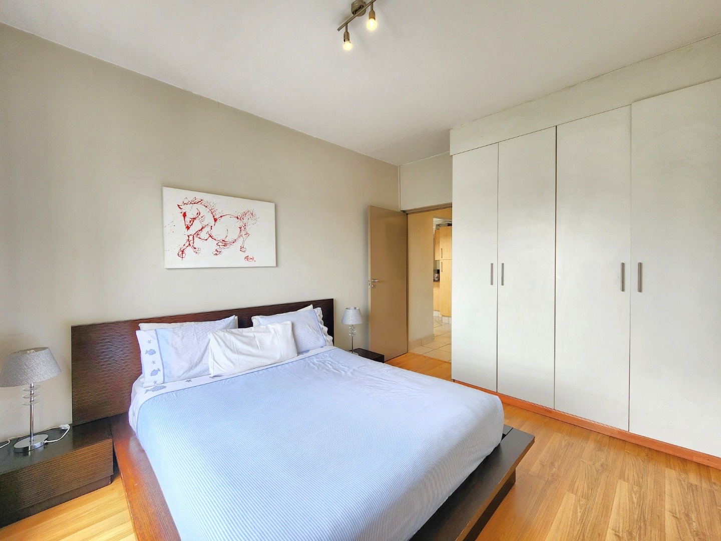 The unit offers two generously sized bedrooms, both fitted with built-in cupboards and wooden flooring, with natural light flowing throughout. A modern, well-appointed bathroom completes the interior.