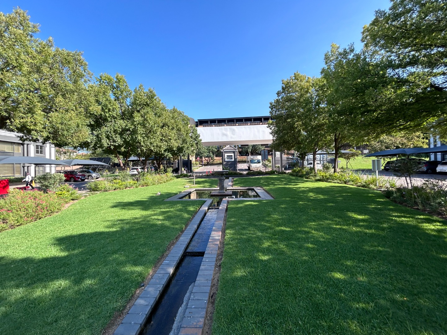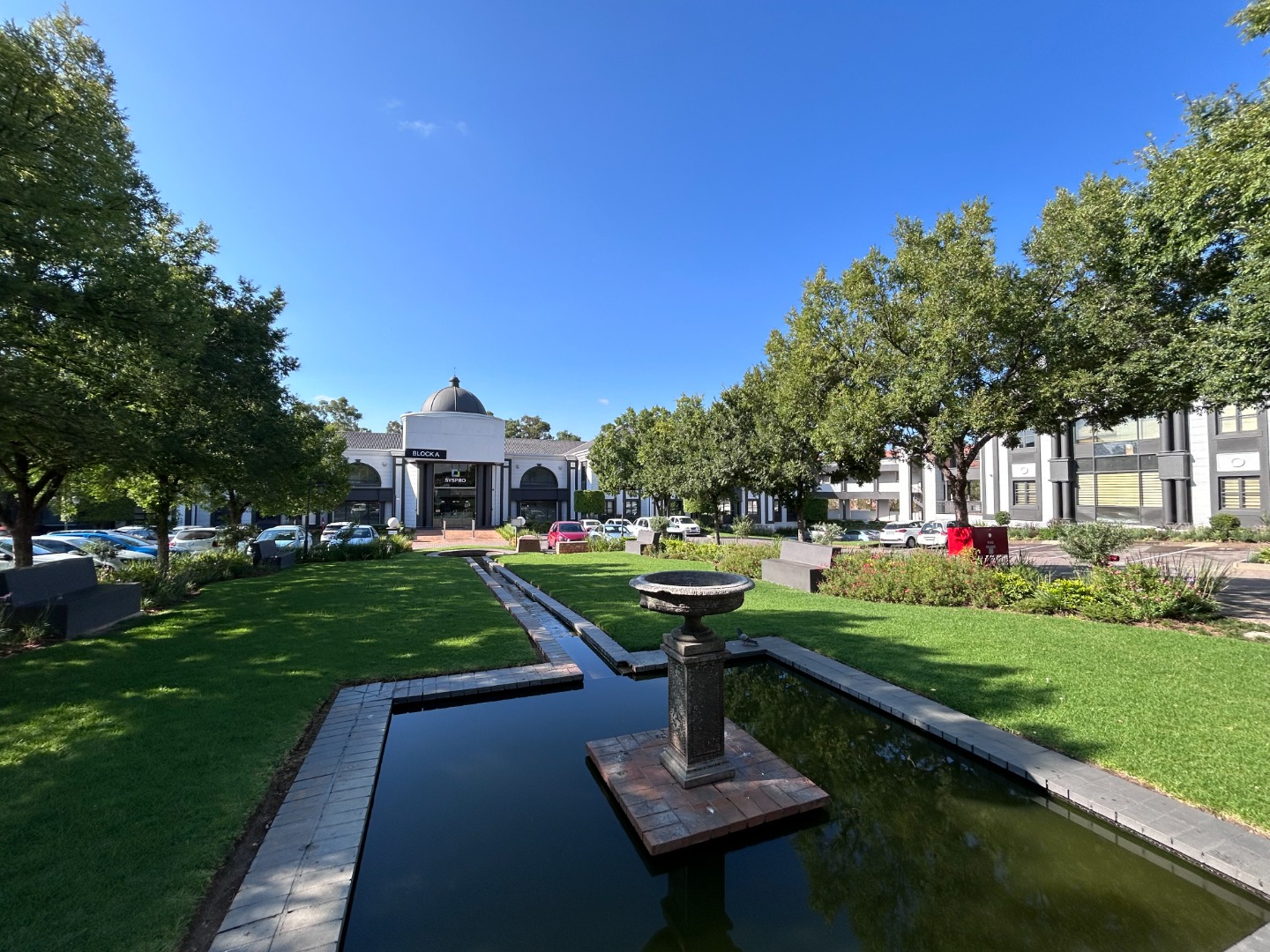 * Central manicured gardens and water features