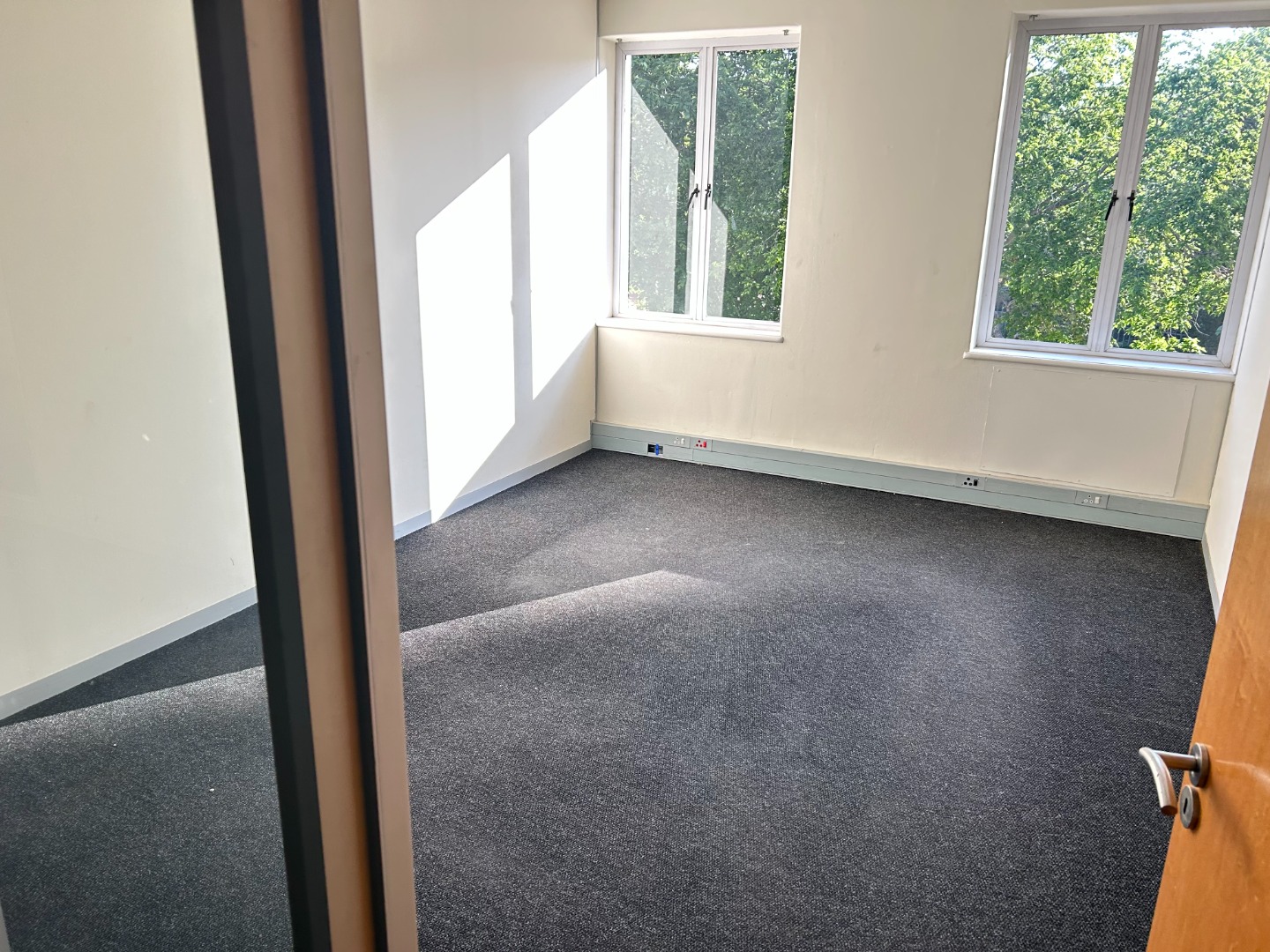 Surrounded by mature trees and well-maintained landscaping, the exterior offers a professional and appealing environment for any business.
