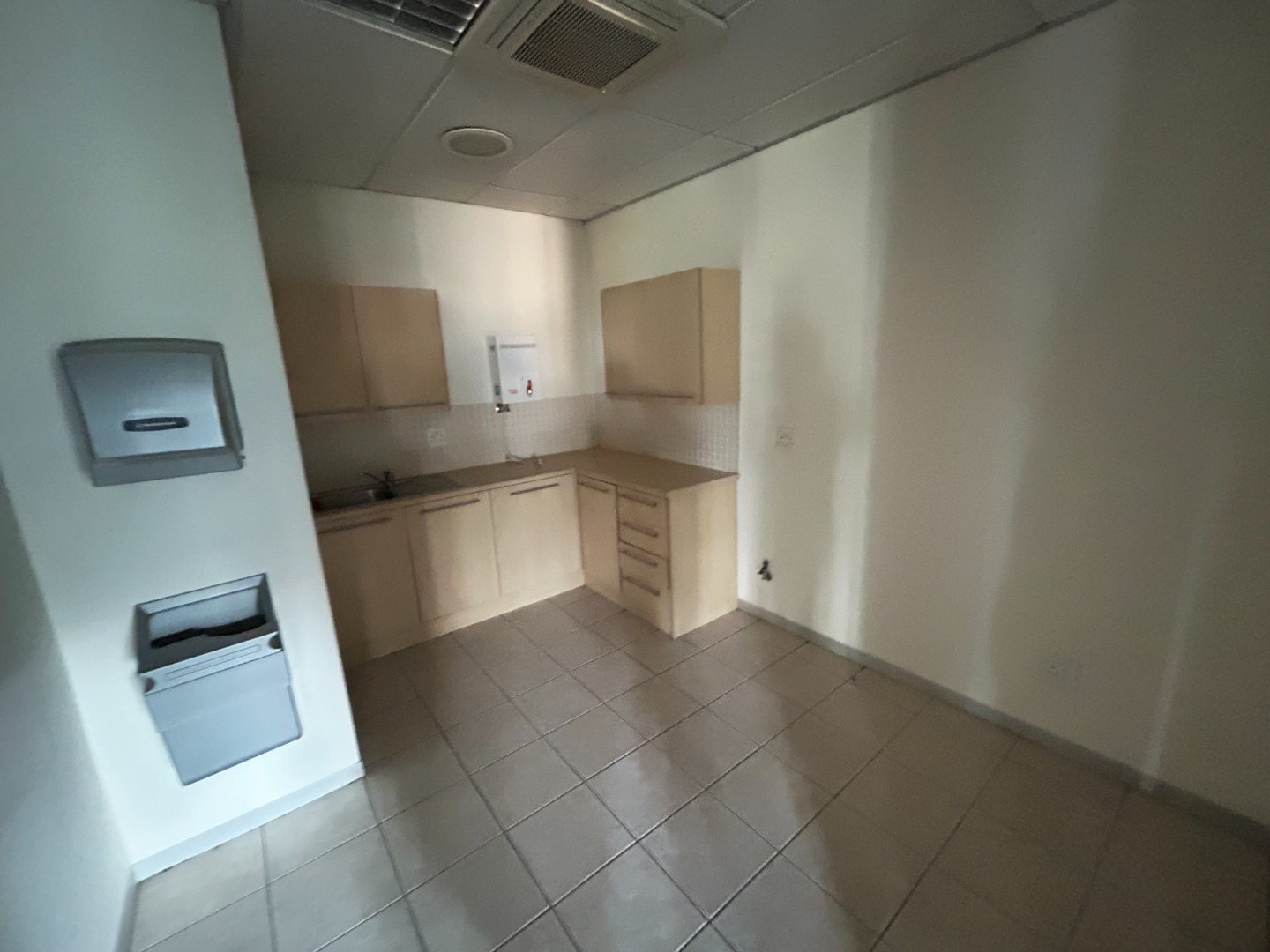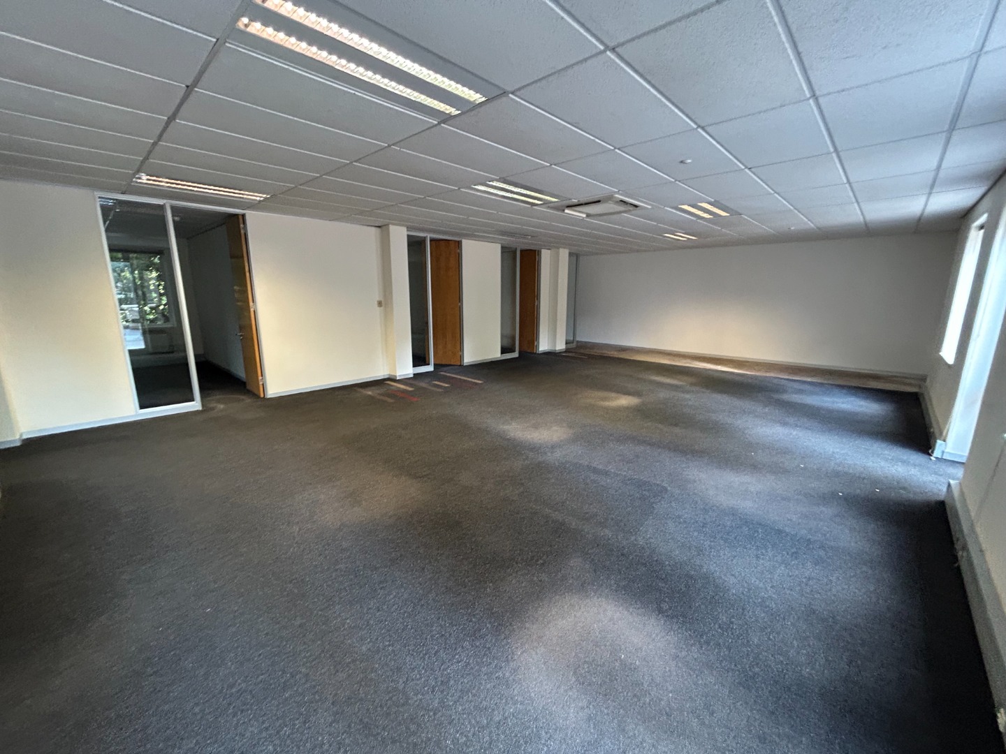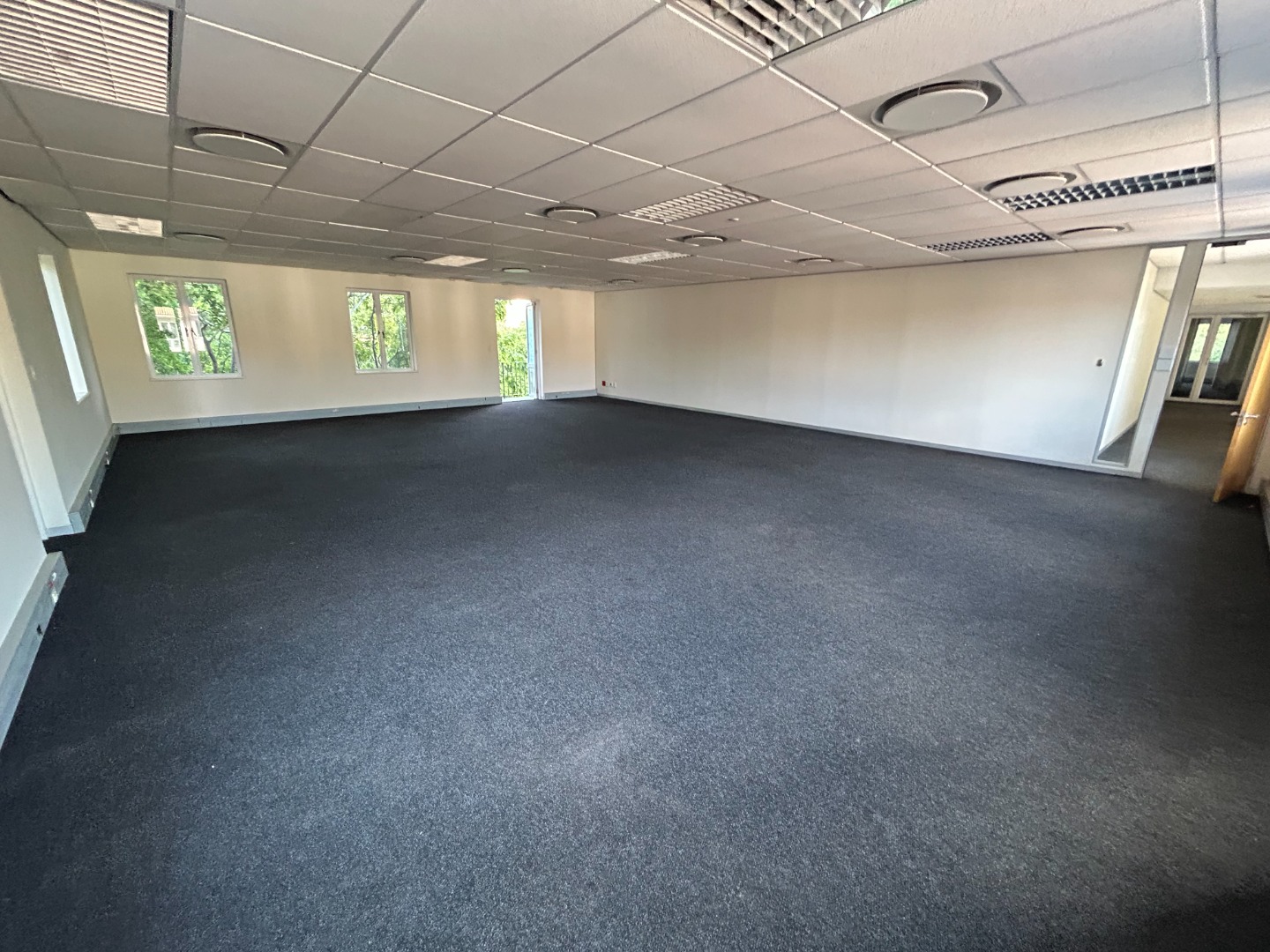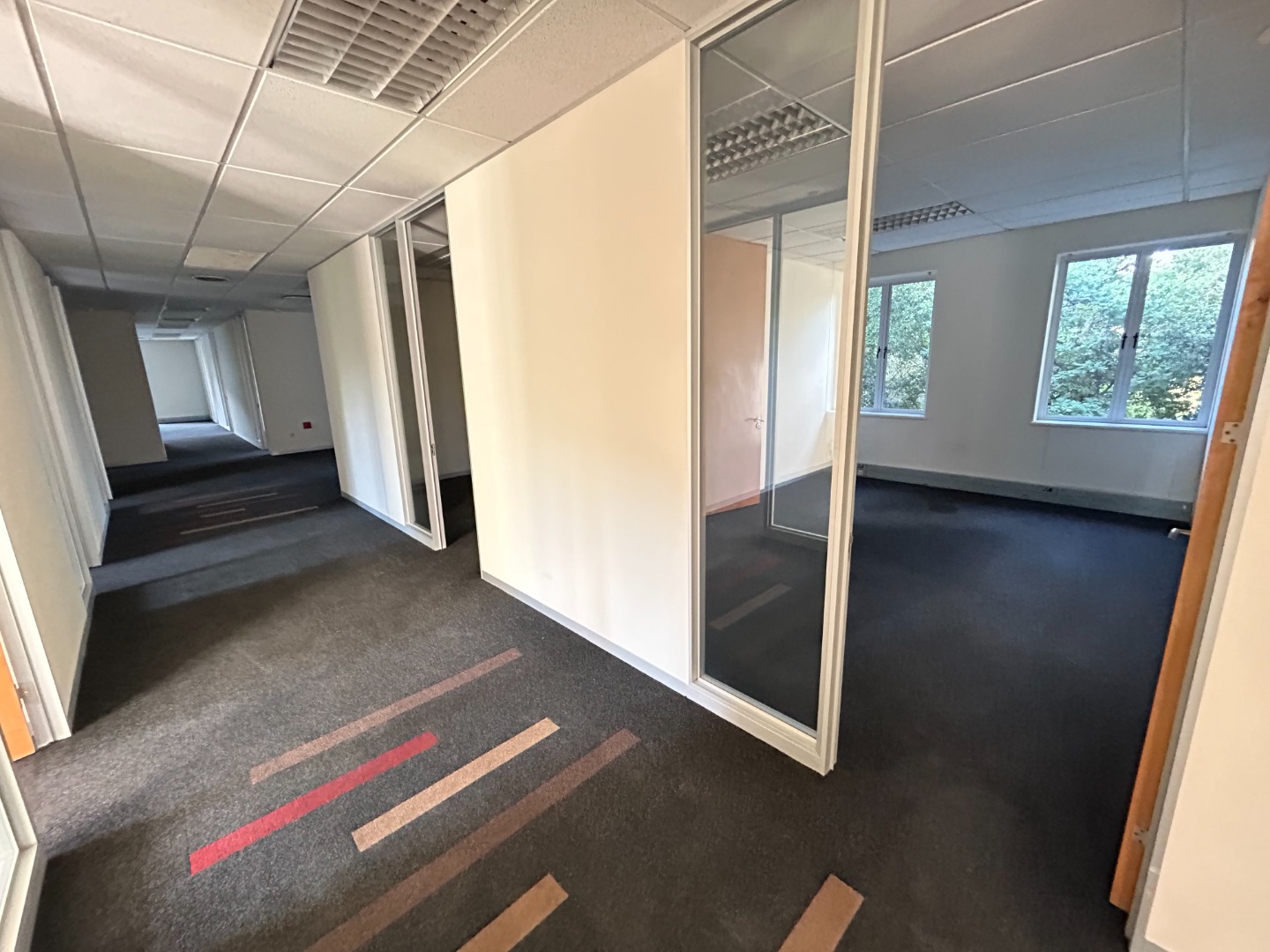 The space currently features a mix of large open-plan areas and several private, partitioned offices. Standard office infrastructure, including drop ceilings with integrated lighting and ventilation, is in place.