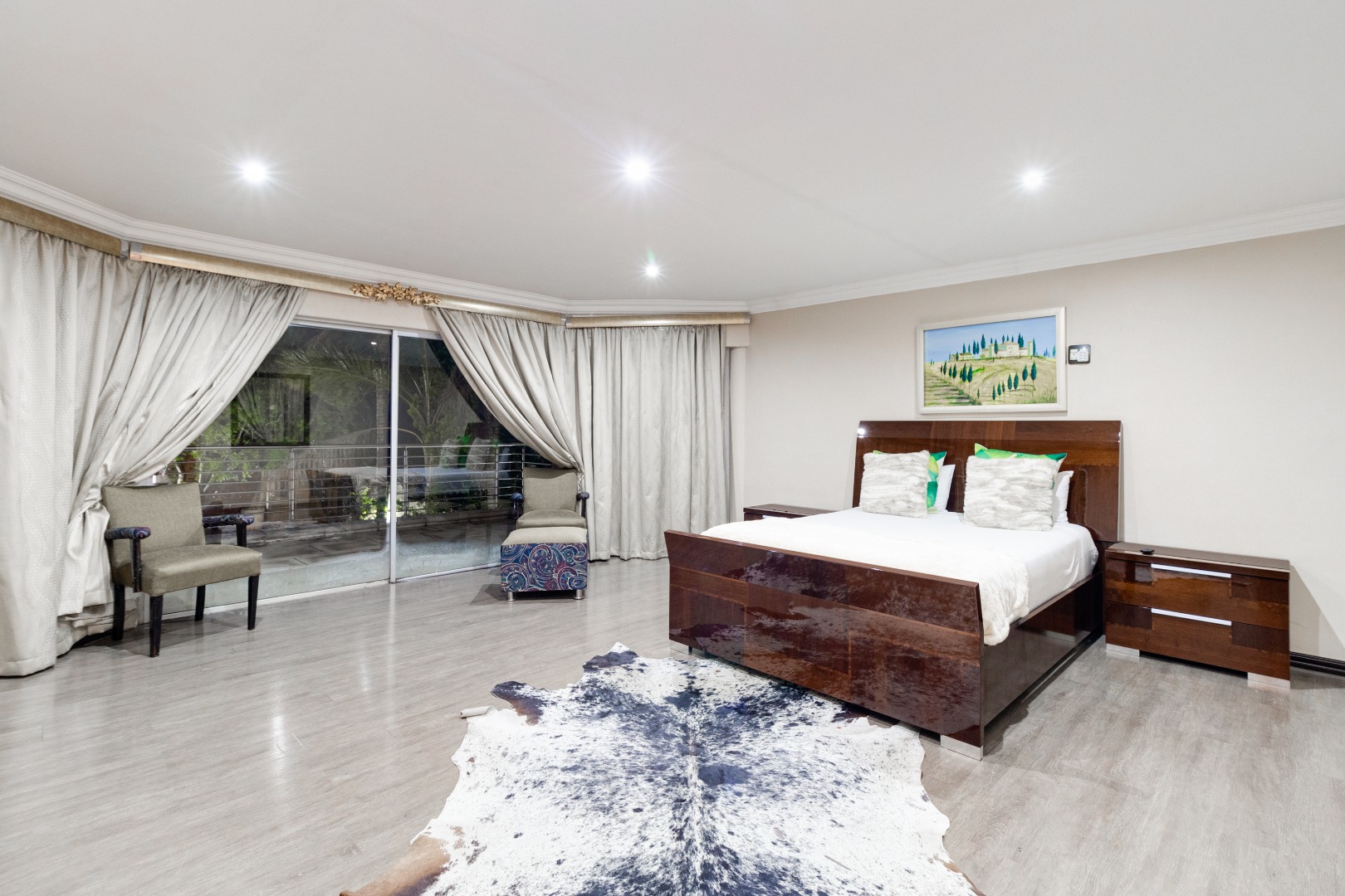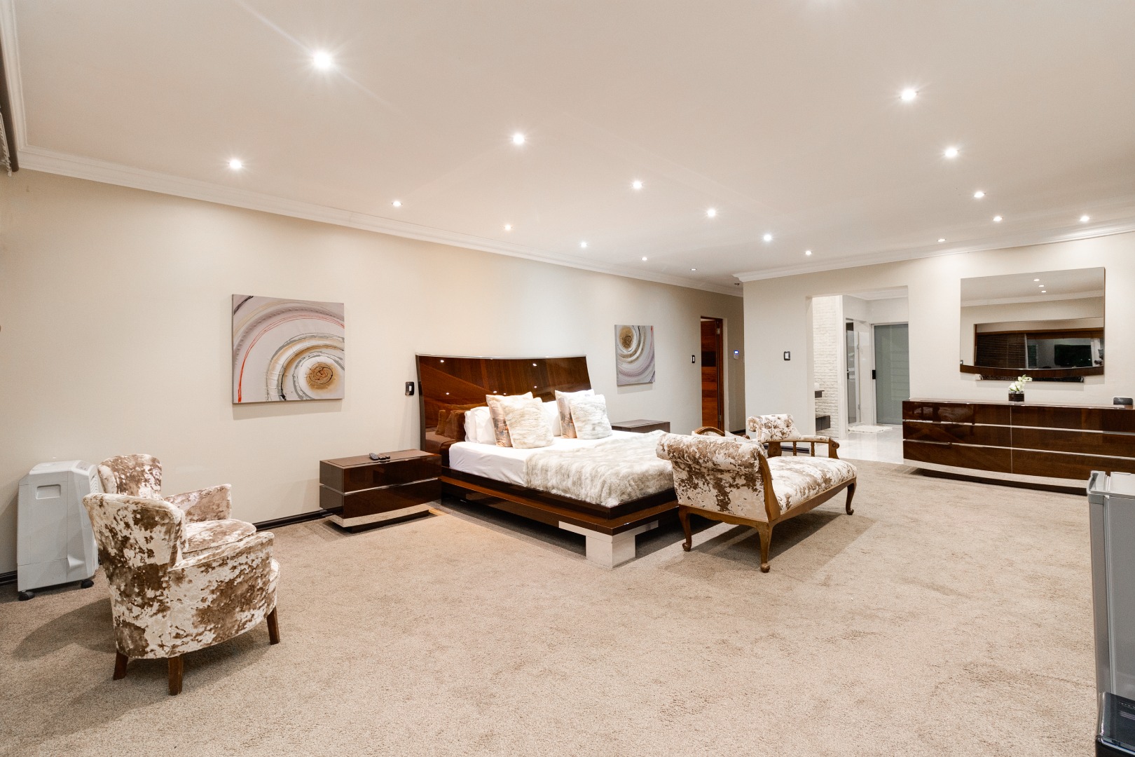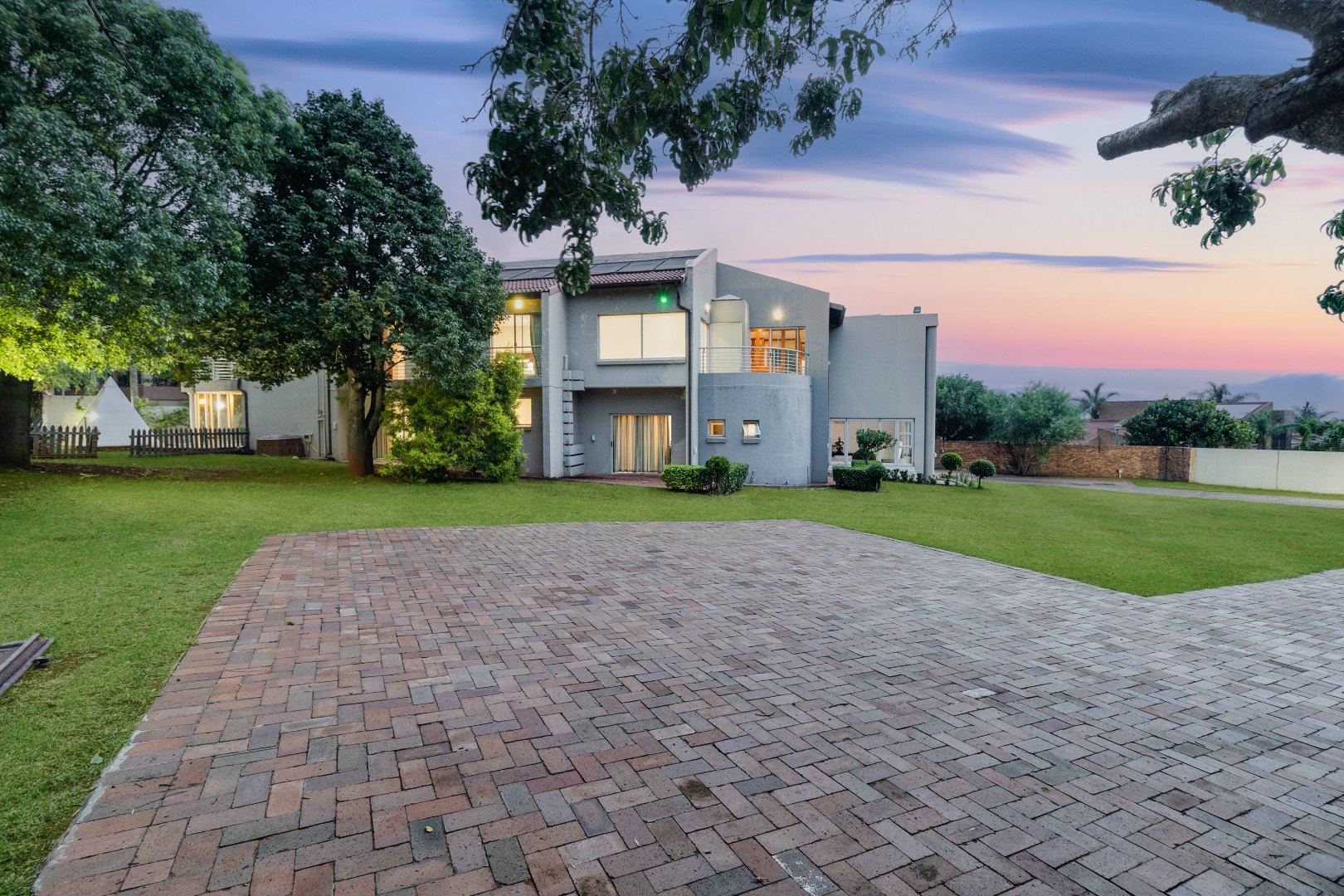 The outdoor areas of this mansion are designed for lavish entertaining and al fresco dining. A spacious patio with stylish furnishings and a BRAAI area provides the perfect backdrop for DRINKS under the stars, while meticulously manicured gardens add a touch of natural beauty to the home.