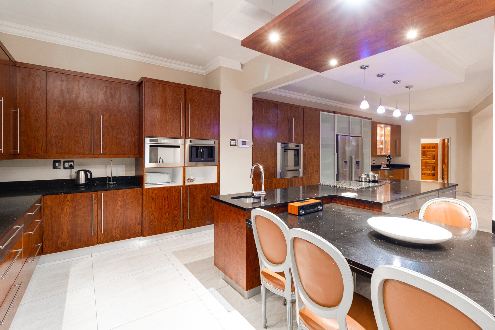 The state-of-the-art kitchen is a culinary haven, equipped with top-of-the-line appliances, custom cabinetry, and premium finishes. Whether preparing gourmet meals for intimate gatherings or hosting lavish events, this culinary masterpiece caters to the most discerning tastes.
