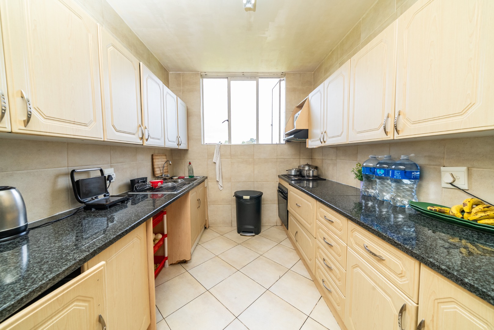 The functional galley-style kitchen offers ample light cabinetry, dark granite countertops, a stove/hob, and an extractor fan, providing everything you need for effortless everyday cooking. The apartment includes two comfortable, sunlit bedrooms with easy-to-maintain tiled floors, along with a neatly appointed bathroom for added convenience.