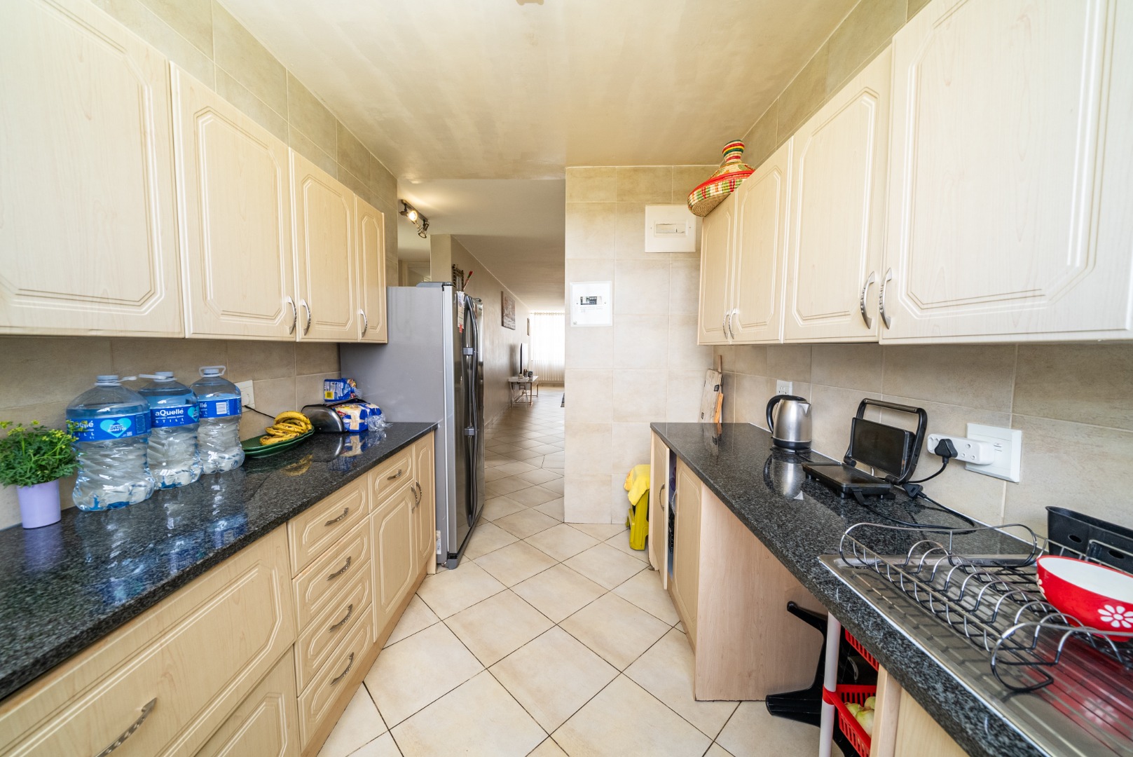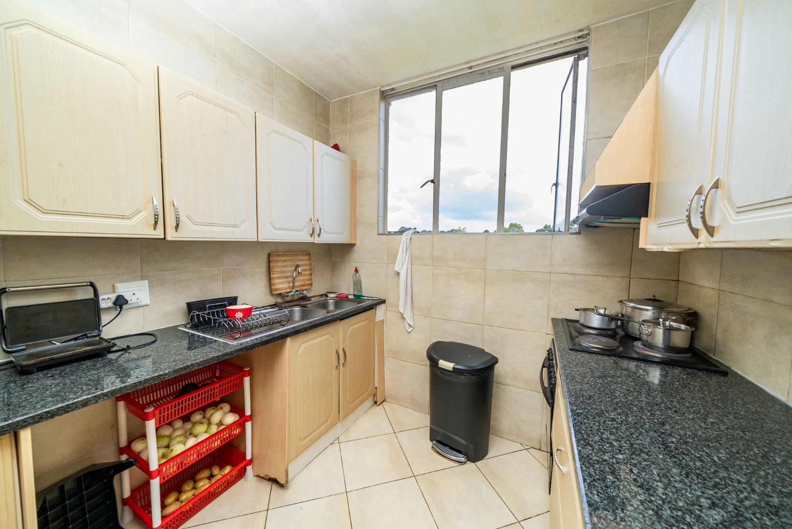The functional galley-style kitchen offers ample light cabinetry, dark granite countertops, a stove/hob, and an extractor fan, providing everything you need for effortless everyday cooking. The apartment includes two comfortable, sunlit bedrooms with easy-to-maintain tiled floors, along with a neatly appointed bathroom for added convenience.
