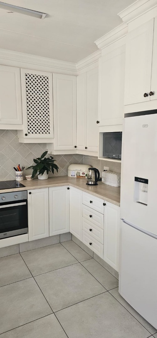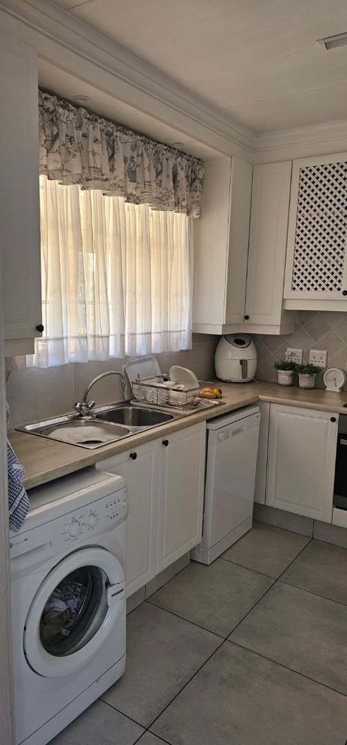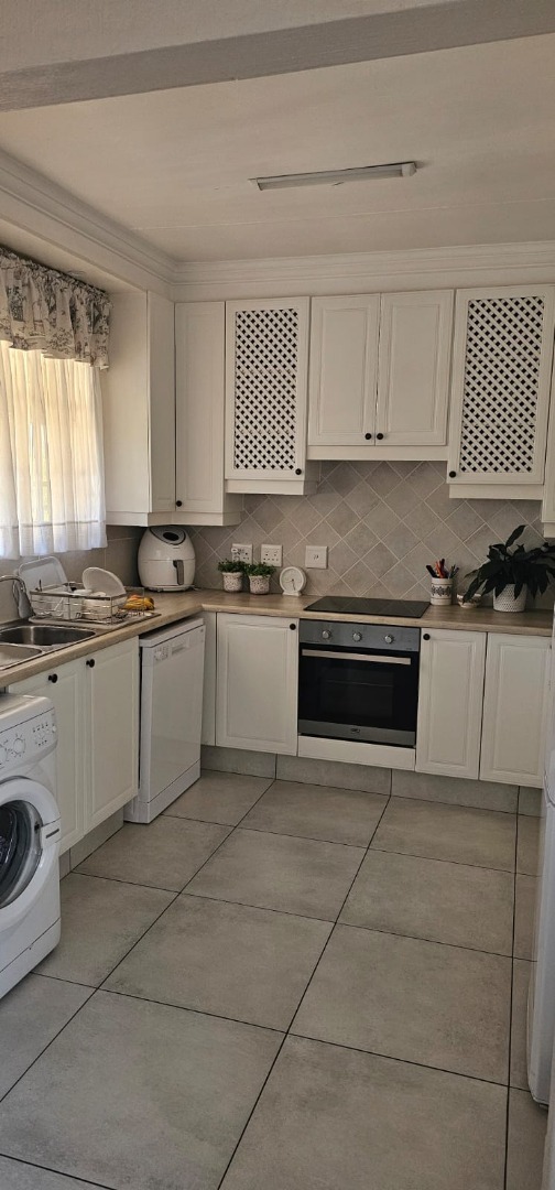 Bright, recently renovated kitchen with white cupboard fittings and super formica counter tops. Fully tiled floors and walls to ceiling. Under-counter oven with glass top hob. Plumbed for dishwasher and washing machine and double sink.