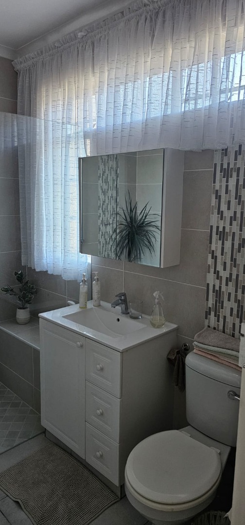The attractive bathroom, totally revamped recently, sports a large shower, plus toilet and basin with a vanity'. The geyser is housed in an additional nook allowing for an added appliance or storage area for linen etc.