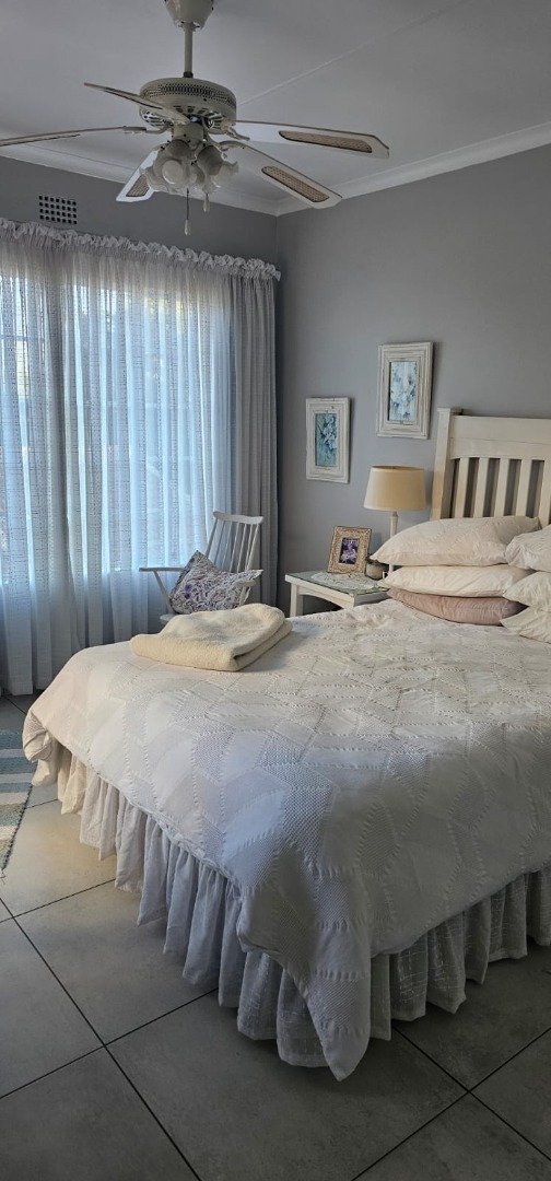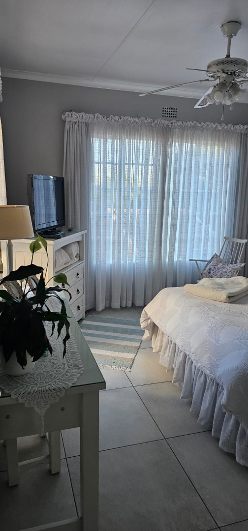 The gracious bedroom with built in cupboards provide ample space. The room easily accommodates a queen size bed with pedestals also allowing for a seating area.
