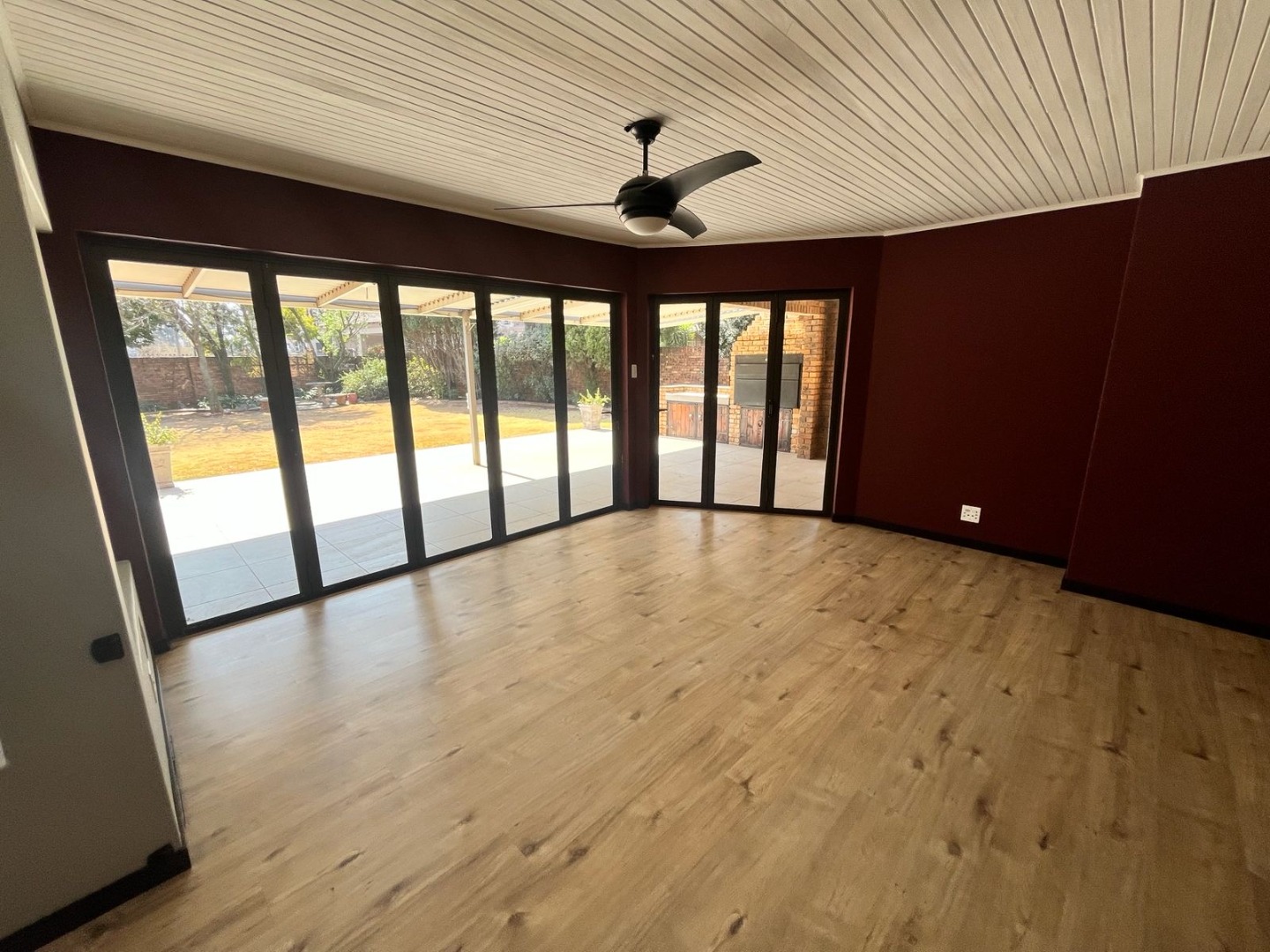 - Entertainment Ready, shutter doors open to a covered patio with a gas braai, louvre awning, and a lush garden with sprinkler system and brick shed.