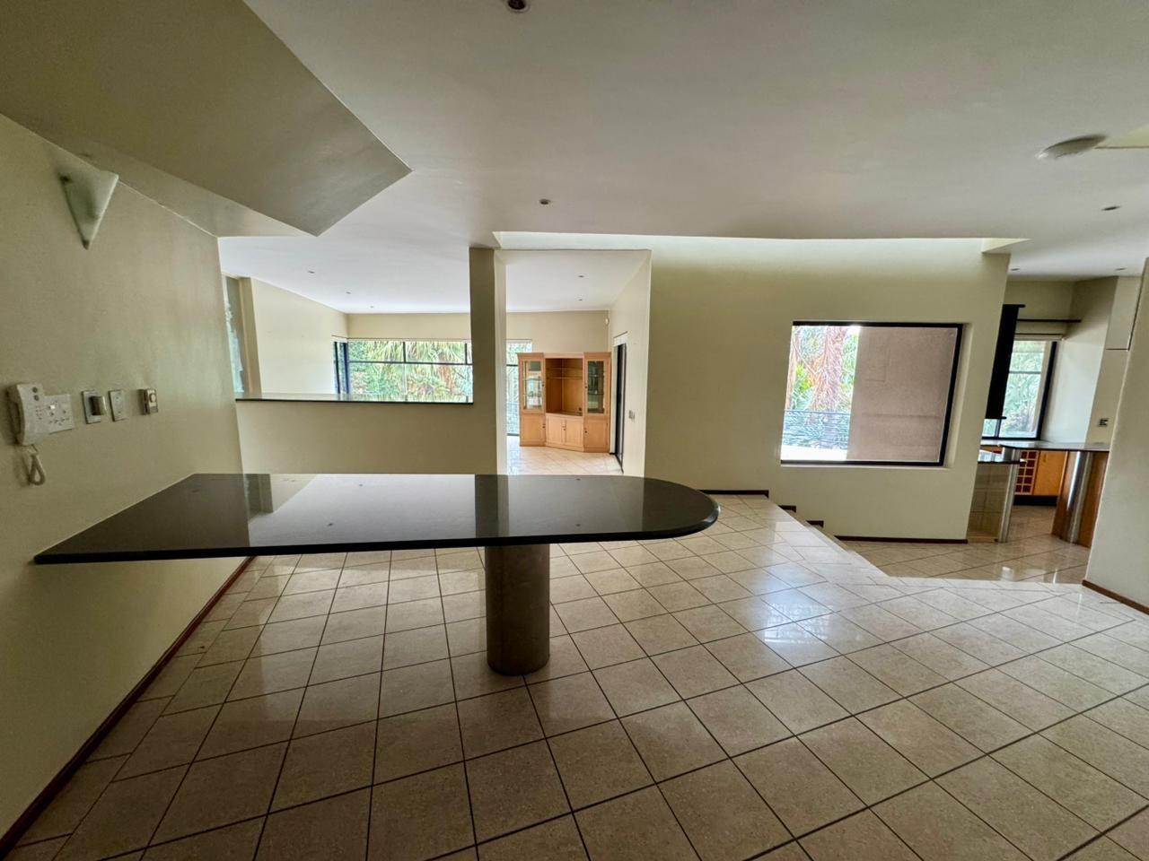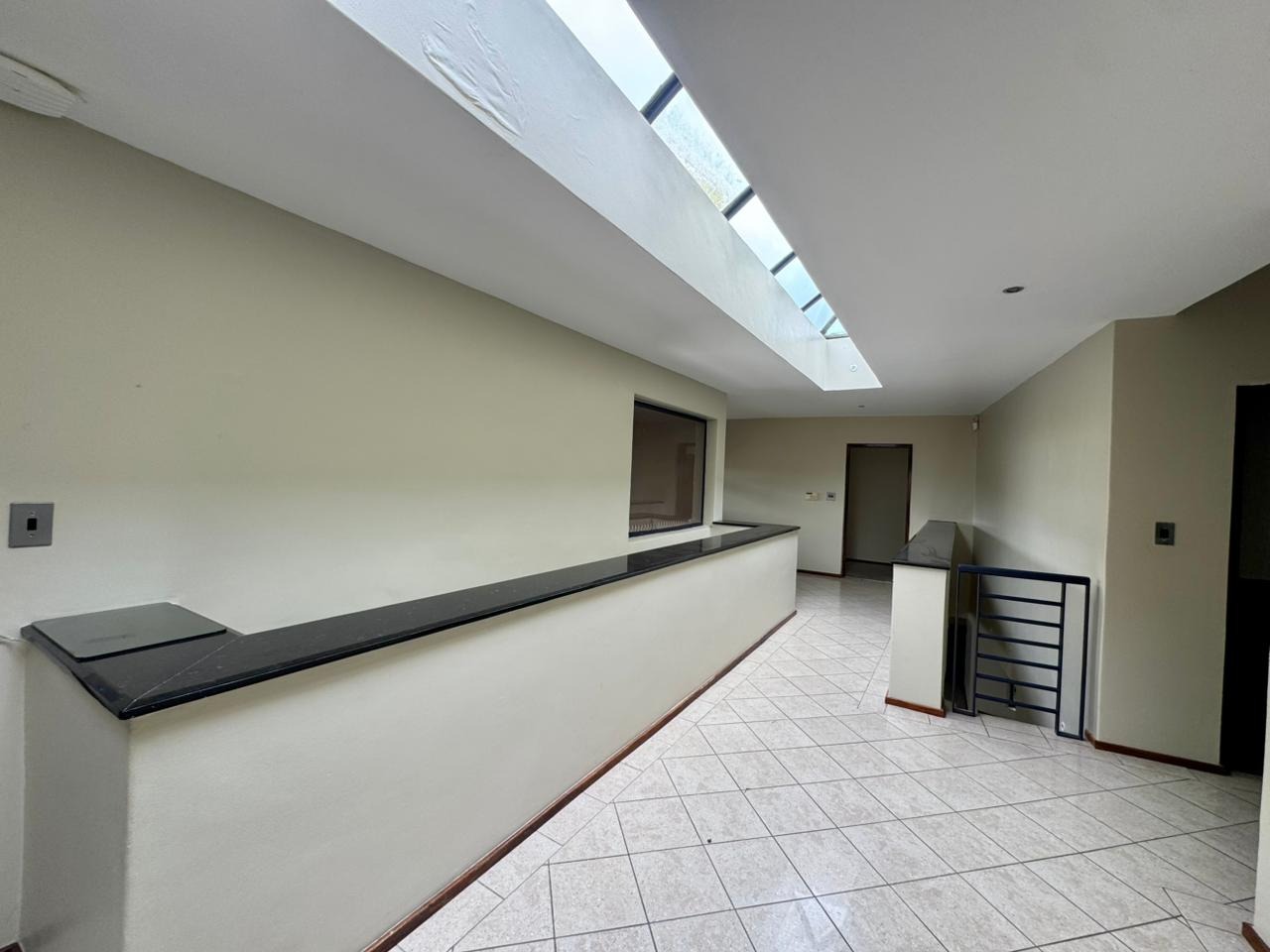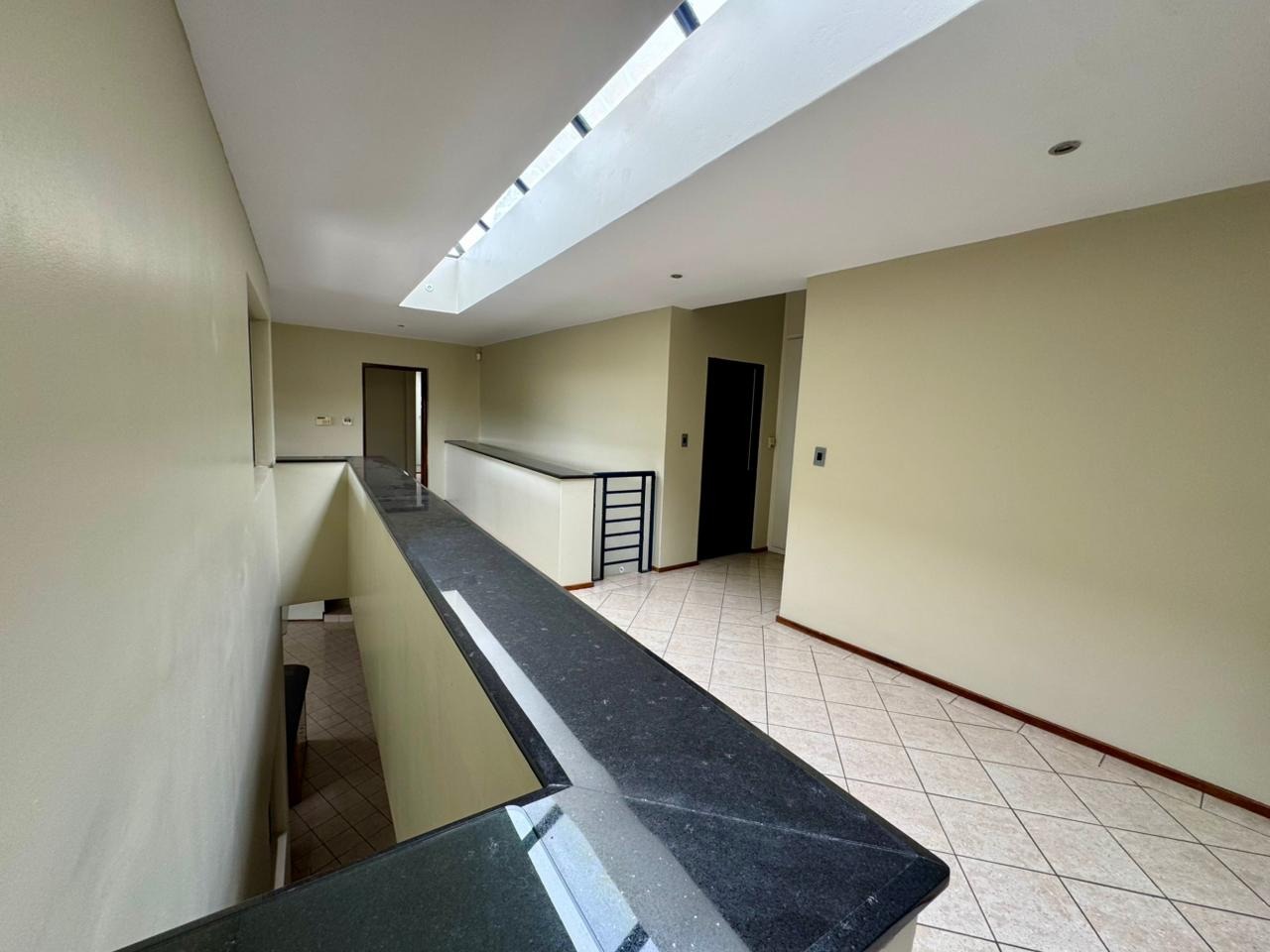 The interior unfolds into expansive living spaces that seamlessly blend form and comfort. Two generous reception lounges and a separate dining area are anchored by a stylish modern kitchen fitted with light-toned cabinetry, black granite work surfaces, and a walk-in pantry. The split-level layout—enhanced by a dramatic granite staircase and overhead skylight—creates architectural interest while framing views from virtually every room.
