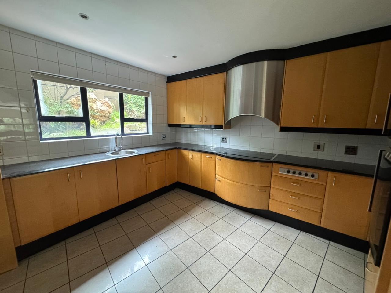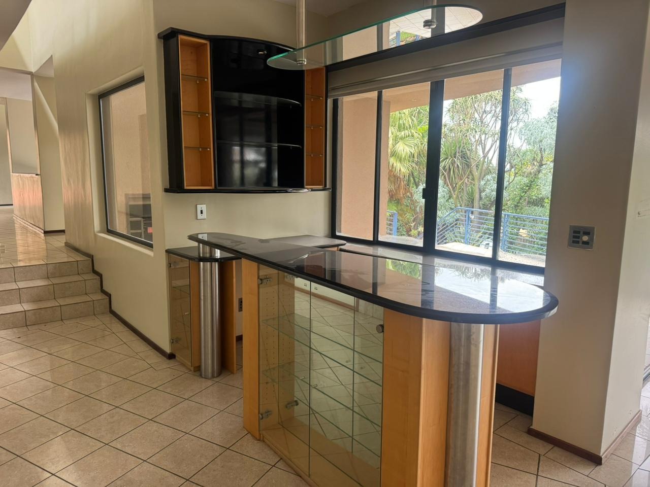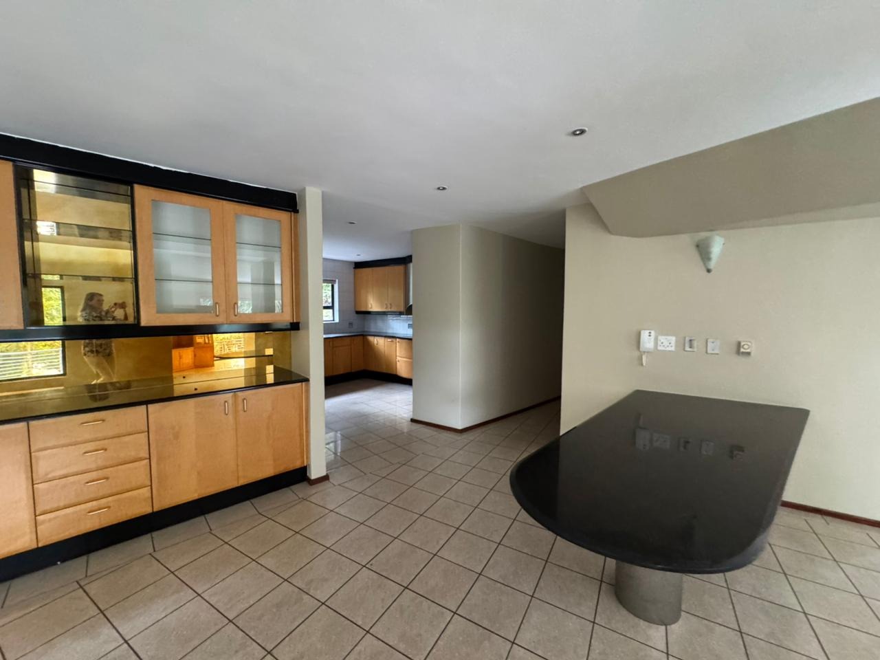 The interior unfolds into expansive living spaces that seamlessly blend form and comfort. Two generous reception lounges and a separate dining area are anchored by a stylish modern kitchen fitted with light-toned cabinetry, black granite work surfaces, and a walk-in pantry. The split-level layout—enhanced by a dramatic granite staircase and overhead skylight—creates architectural interest while framing views from virtually every room.