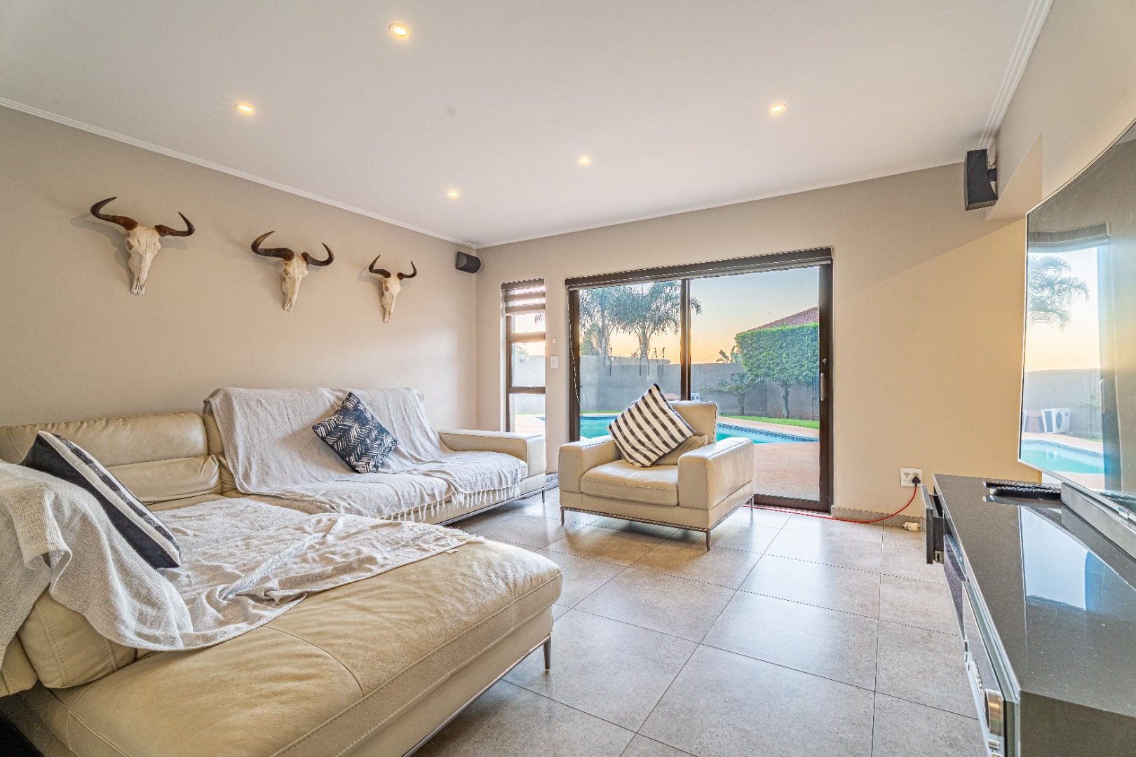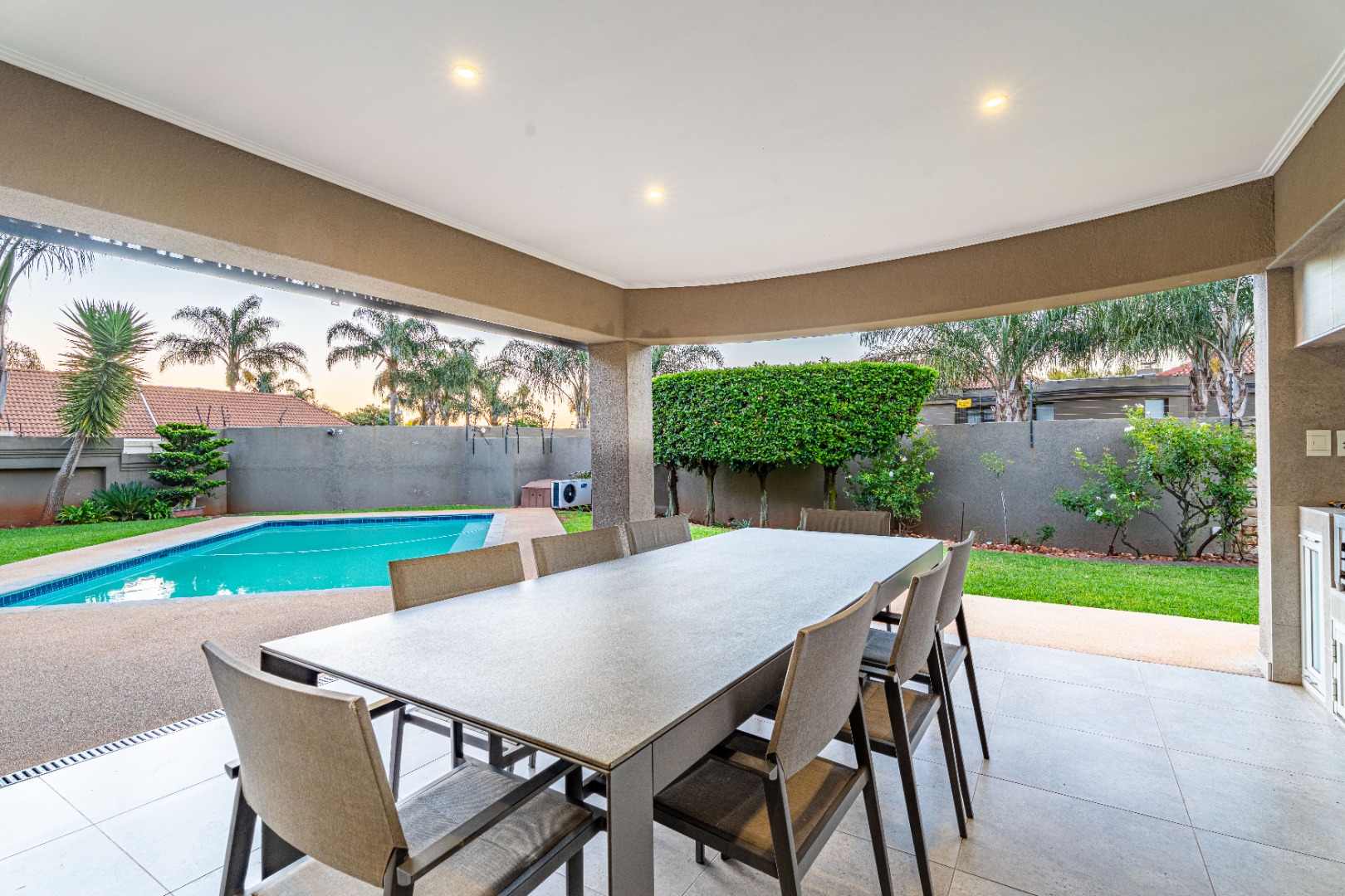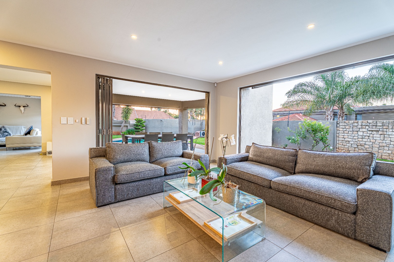 Designed for effortless entertaining and comfortable family living, the home showcases expansive open-plan spaces. A gourmet kitchen with a gas hob, sleek modern cabinetry, and a separate scullery and laundry anchors the living areas. The kitchen flows seamlessly into a casual dining space and family room, where sliding stacking doors open onto a sun-drenched patio. A second covered patio with a built-in braai overlooks the sparkling pool — the perfect setting for relaxed weekend gatherings.