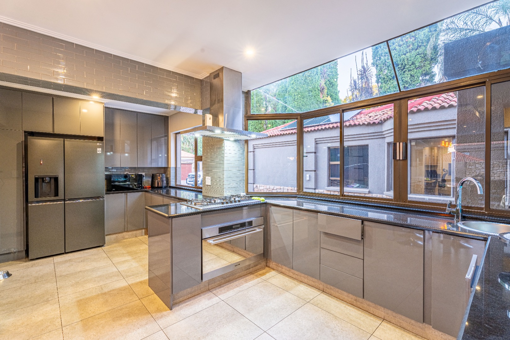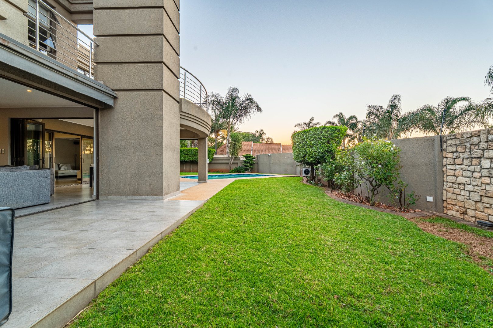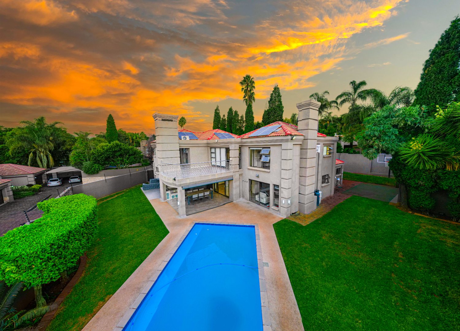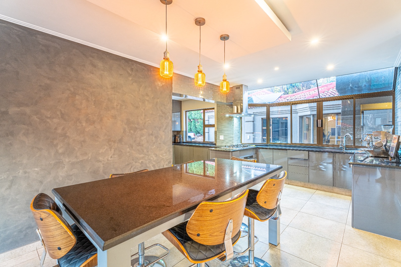 Designed for effortless entertaining and comfortable family living, the home showcases expansive open-plan spaces. A gourmet kitchen with a gas hob, sleek modern cabinetry, and a separate scullery and laundry anchors the living areas. The kitchen flows seamlessly into a casual dining space and family room, where sliding stacking doors open onto a sun-drenched patio. A second covered patio with a built-in braai overlooks the sparkling pool — the perfect setting for relaxed weekend gatherings.