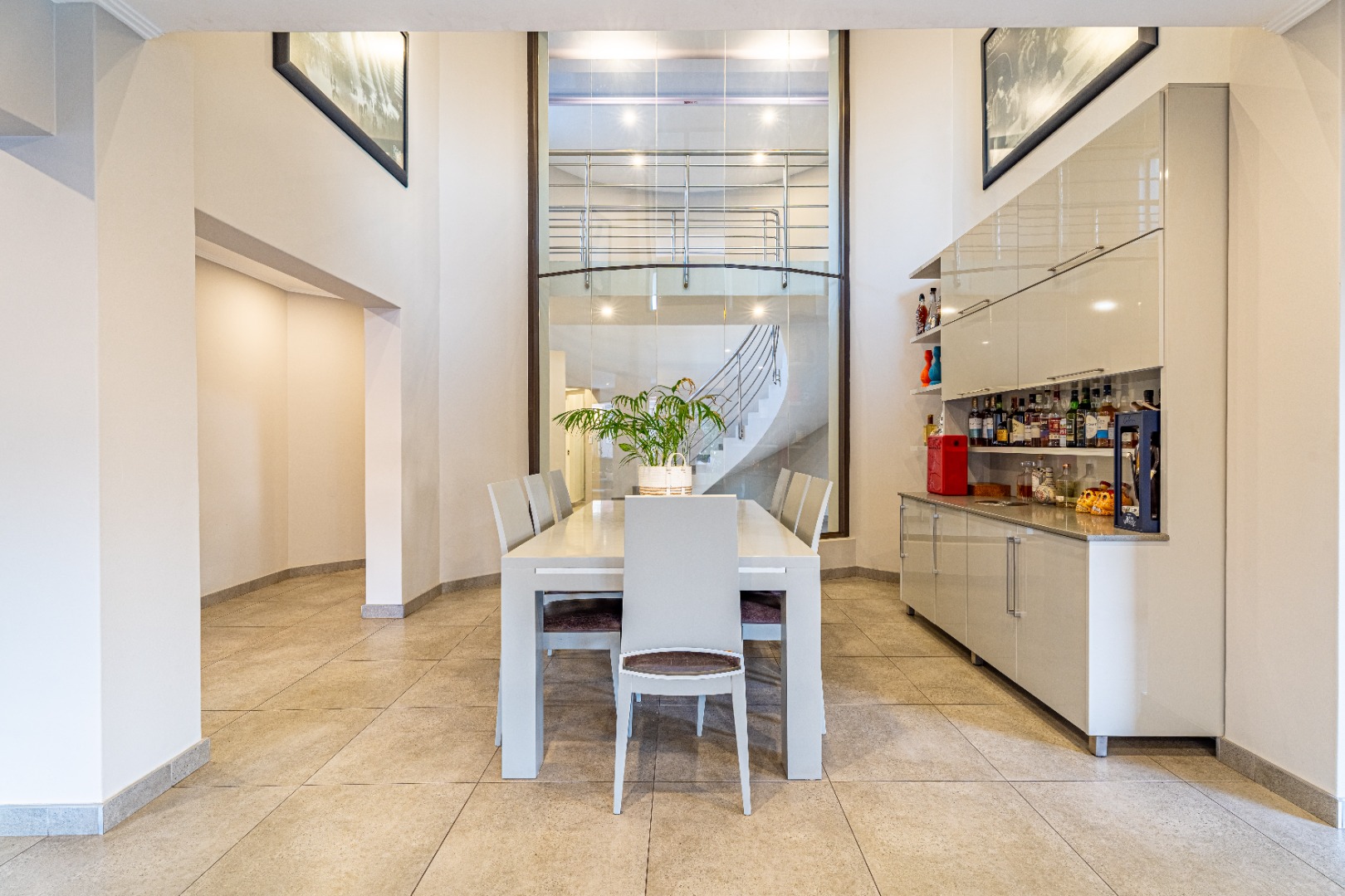 The striking double-volume dining room creates an impressive setting for elegant dinner functions and connects beautifully to the formal lounge, framed by dramatic window scapes that flood the space with natural light.