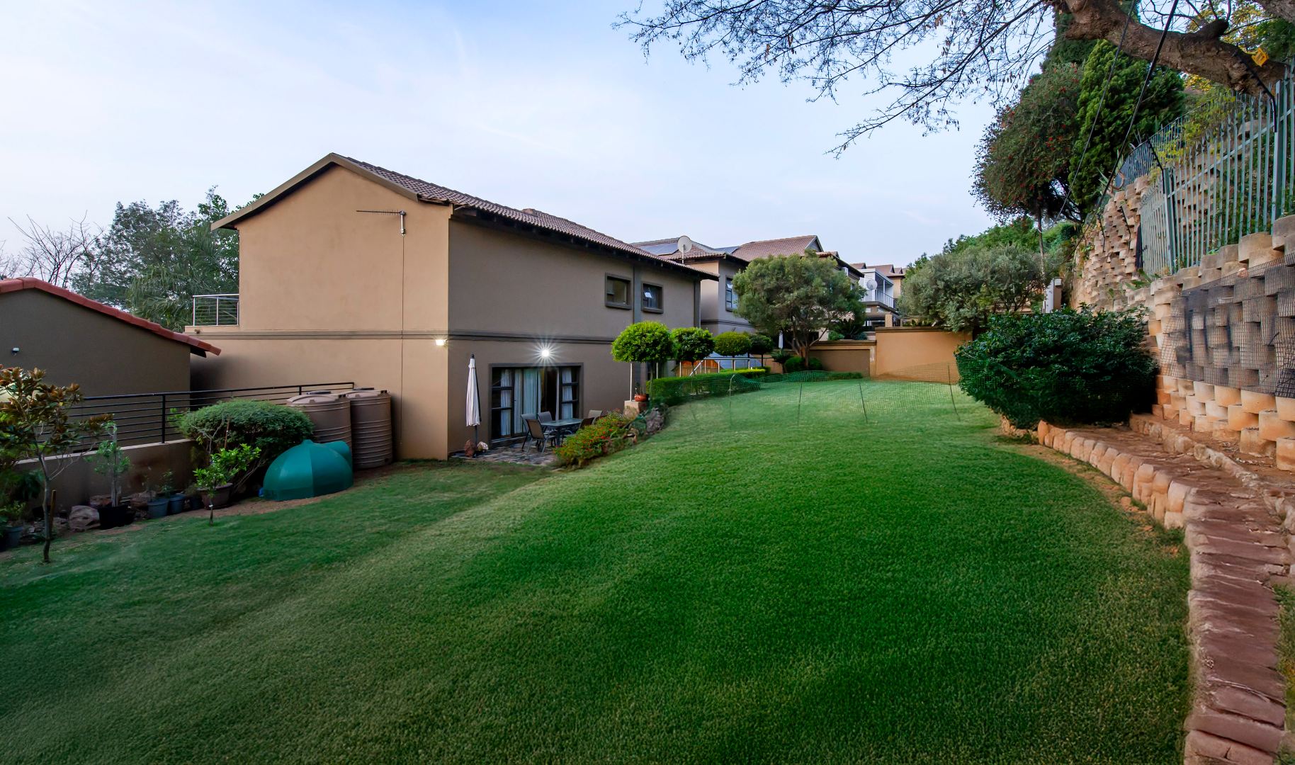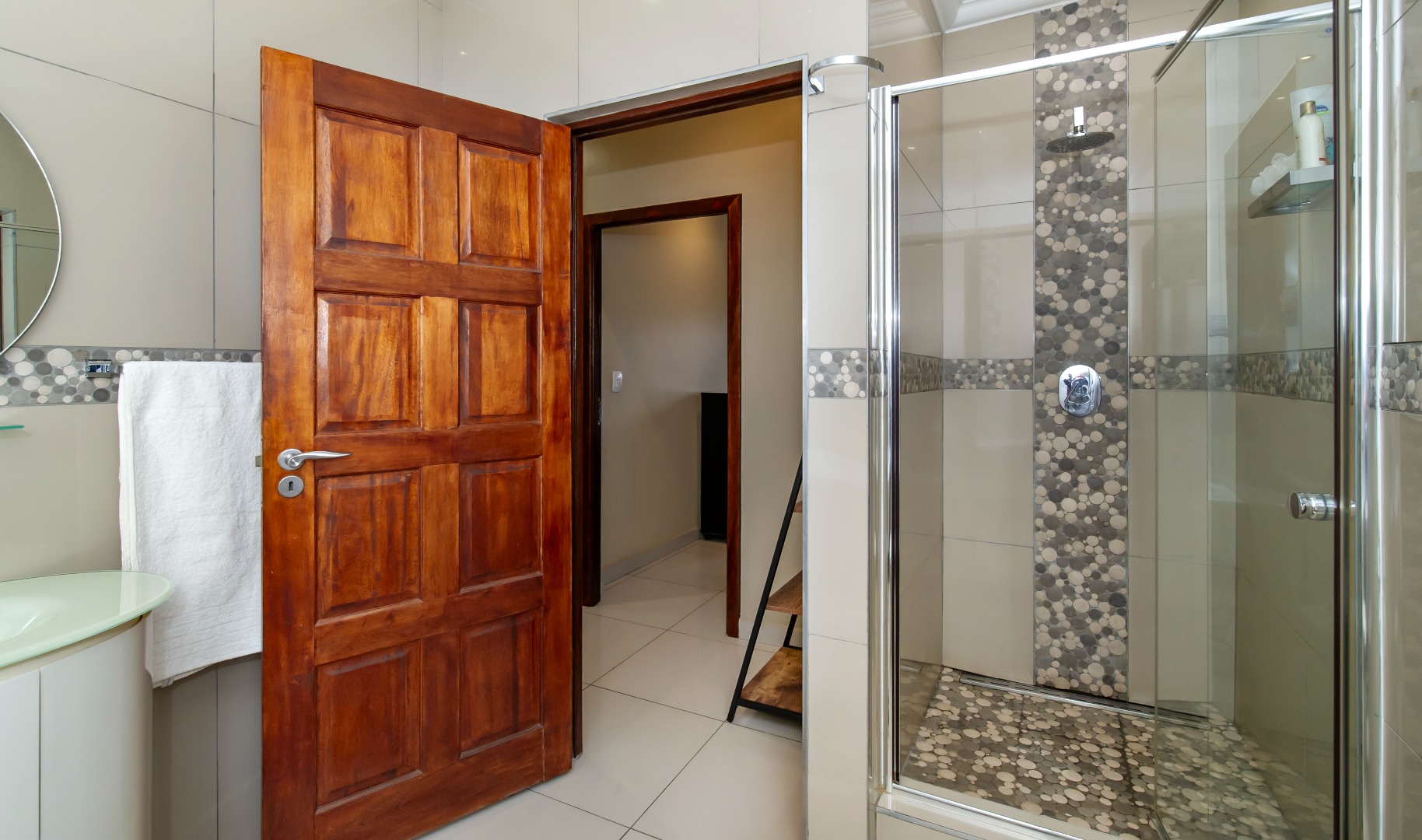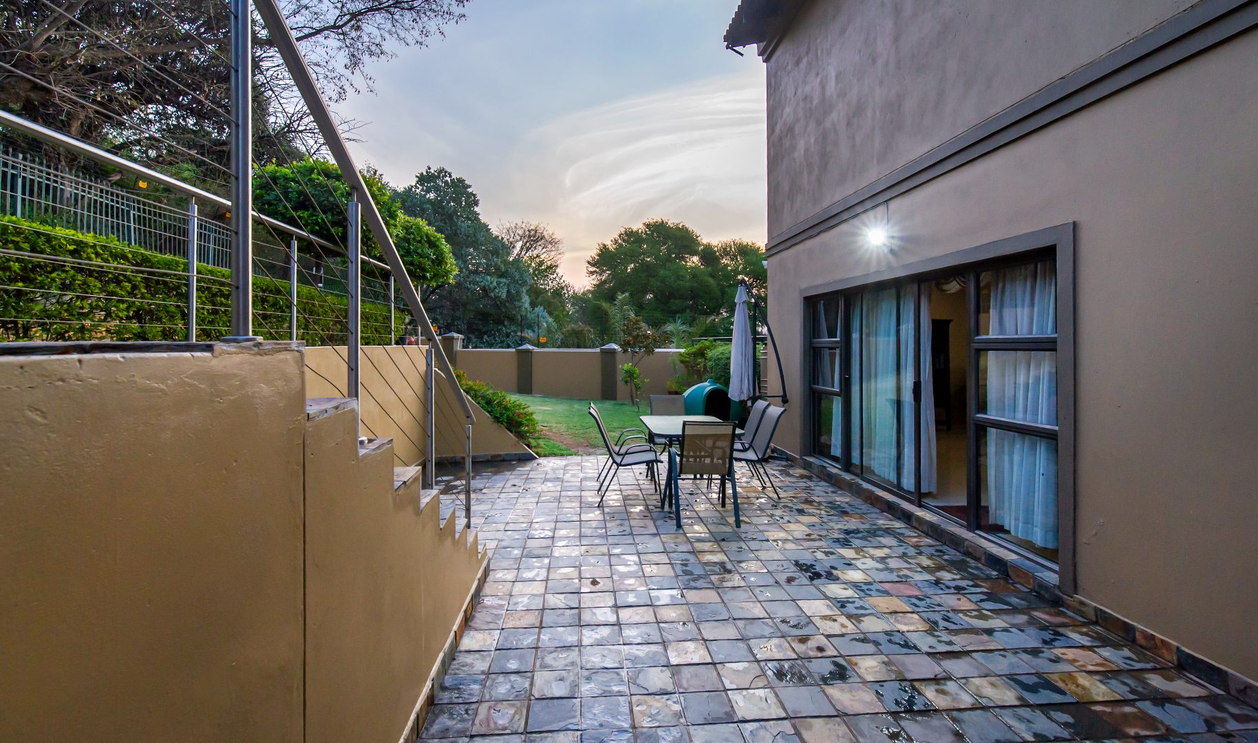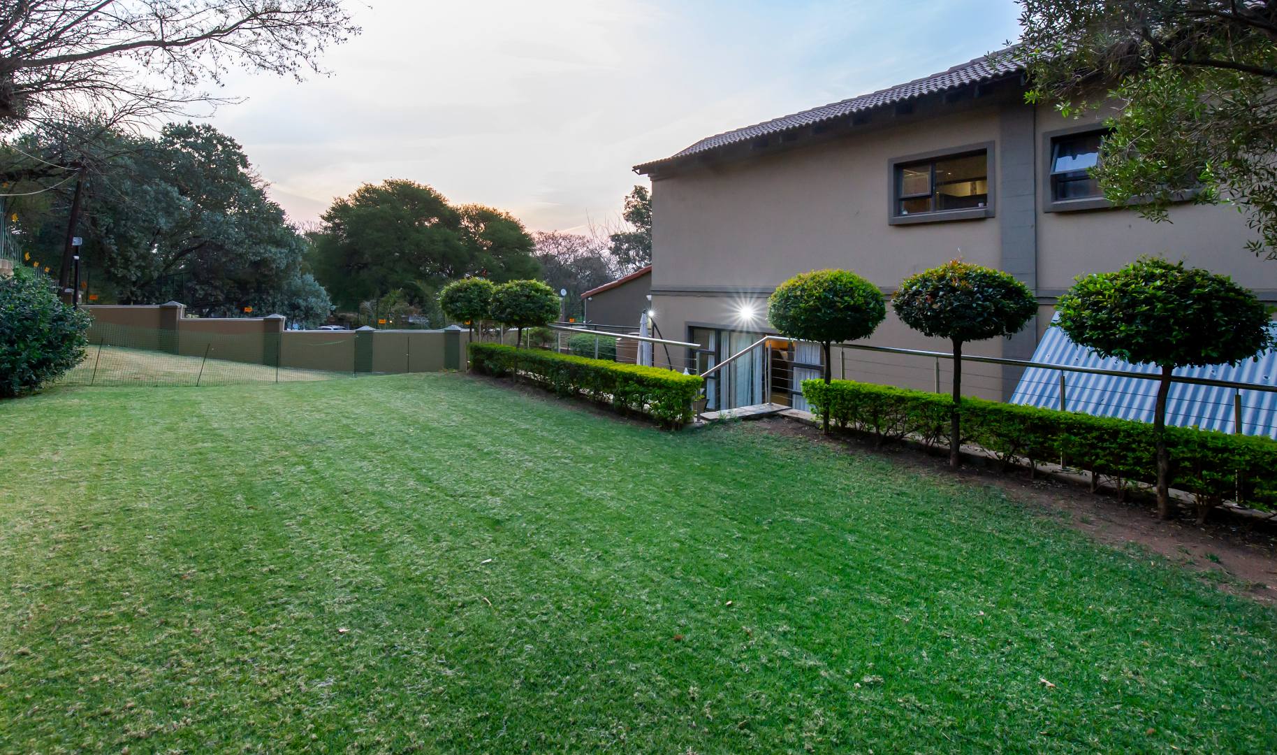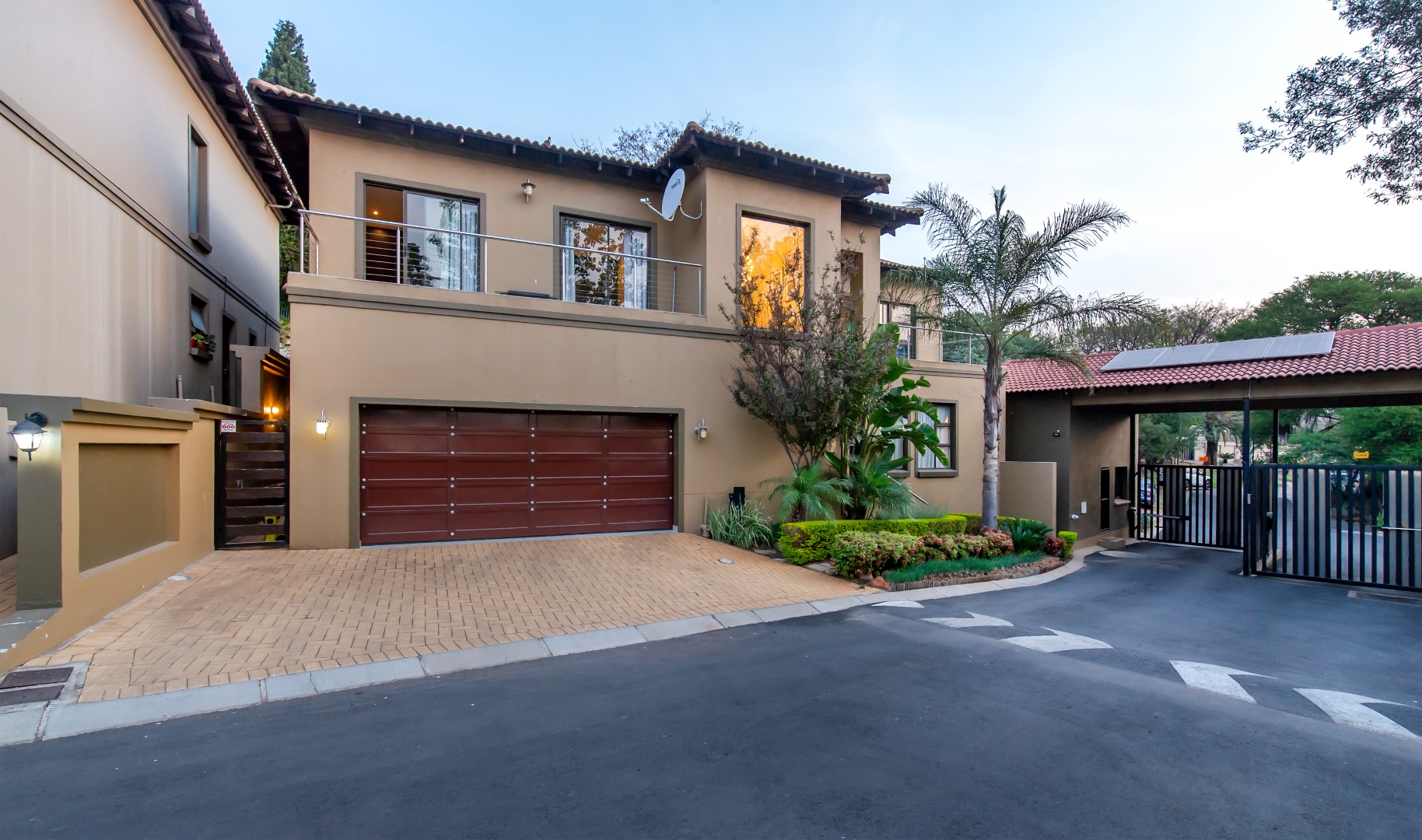 The ground floor boasts beautiful open-plan receptions, with a dining room and lounge flowing effortlessly into a stunning granite-top fitted kitchen. Complete with a separate scullery and laundry, this kitchen is as practical as it is stylish. For convenience, a guest bathroom is also located on the ground floor Sliding doors open onto a sun-drenched patio, overlooking the largest garden in the complex—a rare feature with ample space to add a swimming pool on the terraced space . A versatile storage Zozo facility outdoors could easily serve as overnight staff accommodation.