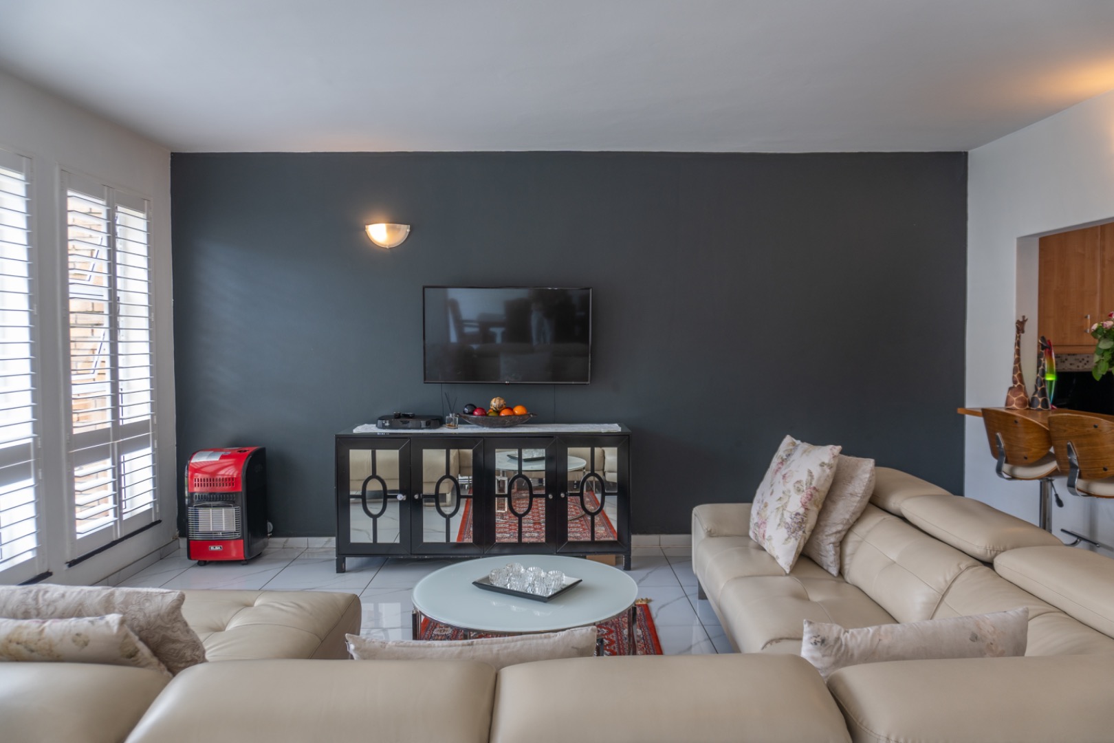 This inviting 3-bedroom, 2.5-bathroom townhouse in Morning Hill, Bedfordview, presents a distinctive facade with modern aluminum windows and elegant louvered shutters, blending classic Tudor-style elements with a contemporary finish. Inside, the spacious 172 sqm floor plan features an open-plan layout, seamlessly connecting the living, dining, and kitchen areas. Abundant natural light streams through large glass doors, illuminating modern tiled flooring, a striking dark accent wall, and a contemporary staircase.