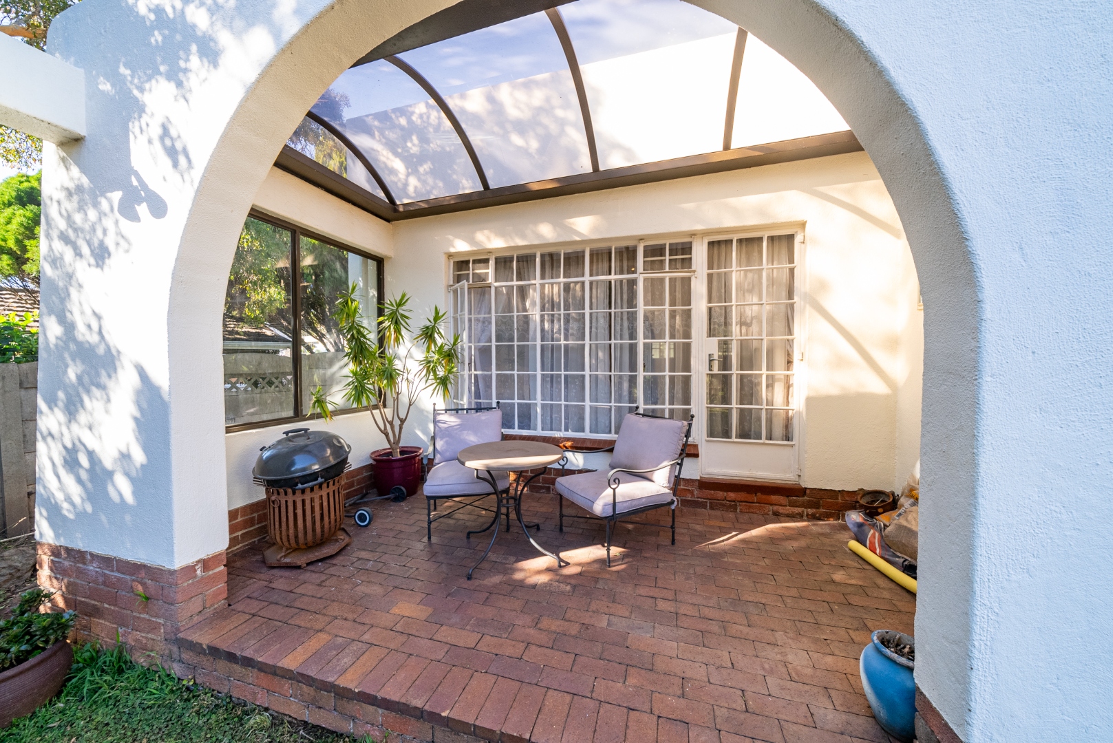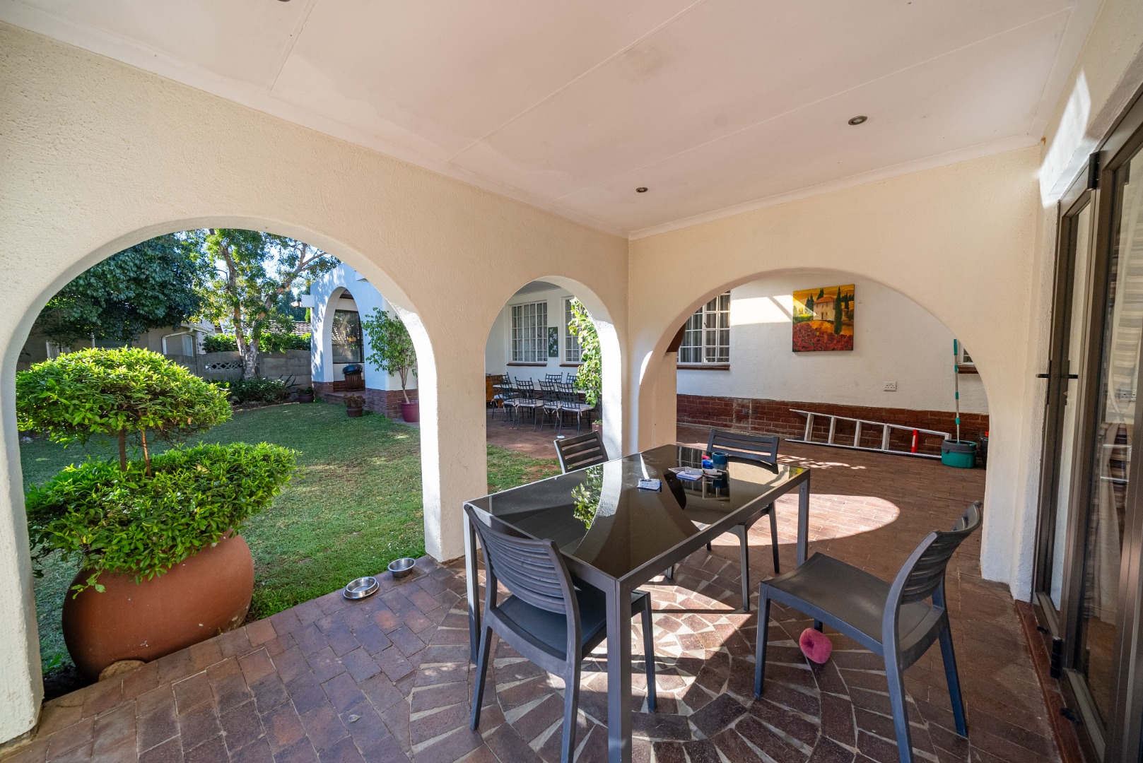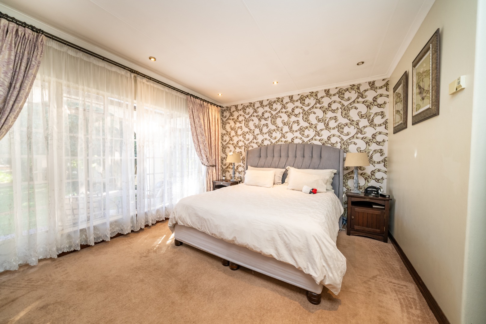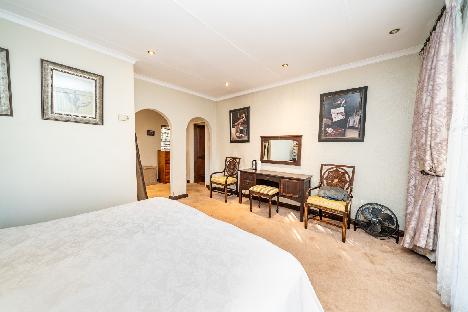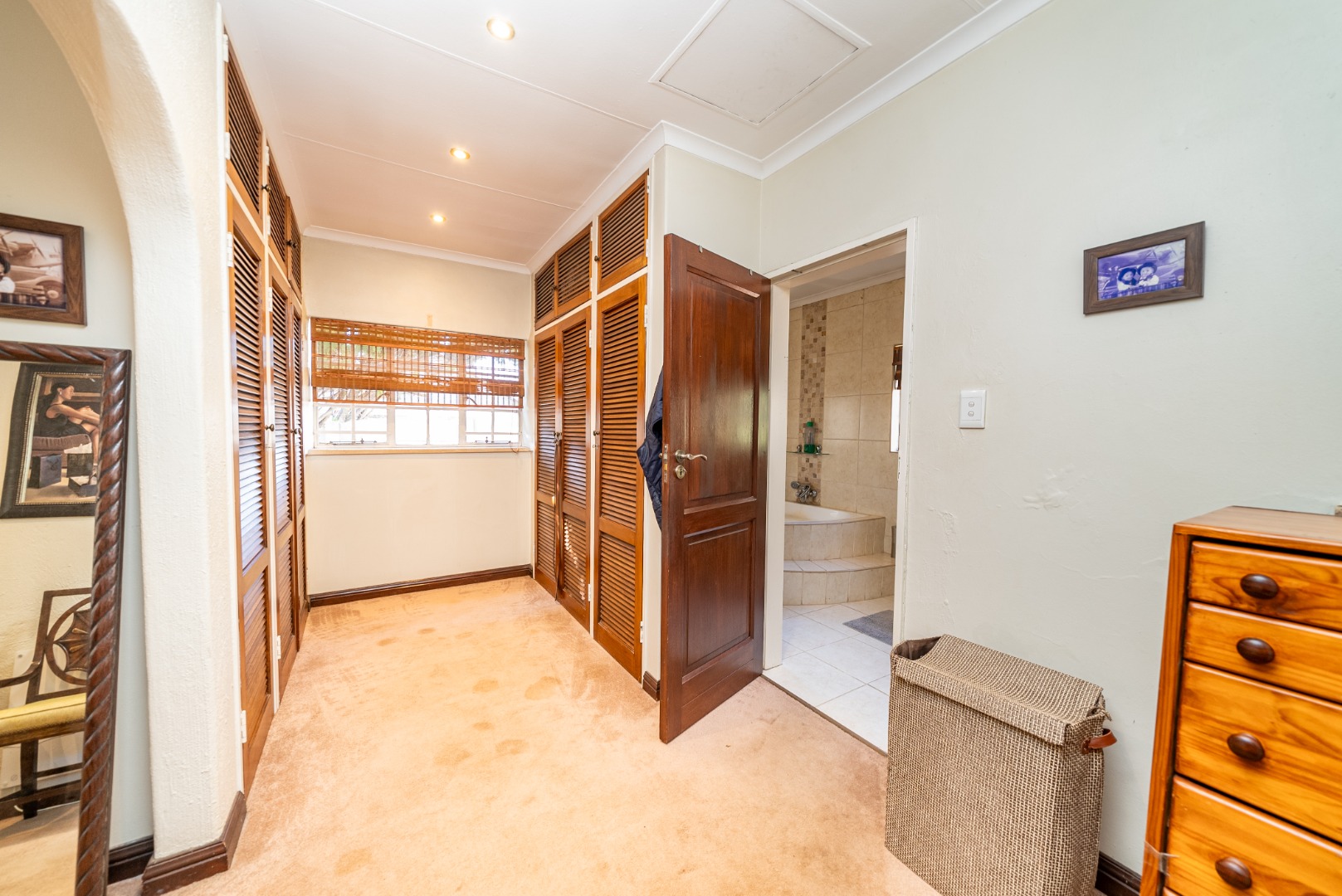 The private bedroom wing offers a quiet retreat from the living areas. Connected by a graceful corridor of archways, each of the four bedrooms is thoughtfully placed to provide privacy and comfort. The luxurious primary suite is a sanctuary unto itself, featuring a spacious ensuite, walk-in closet, and its own secluded patio with tranquil views of the garden—an ideal spot for morning coffee or sunset reflections.