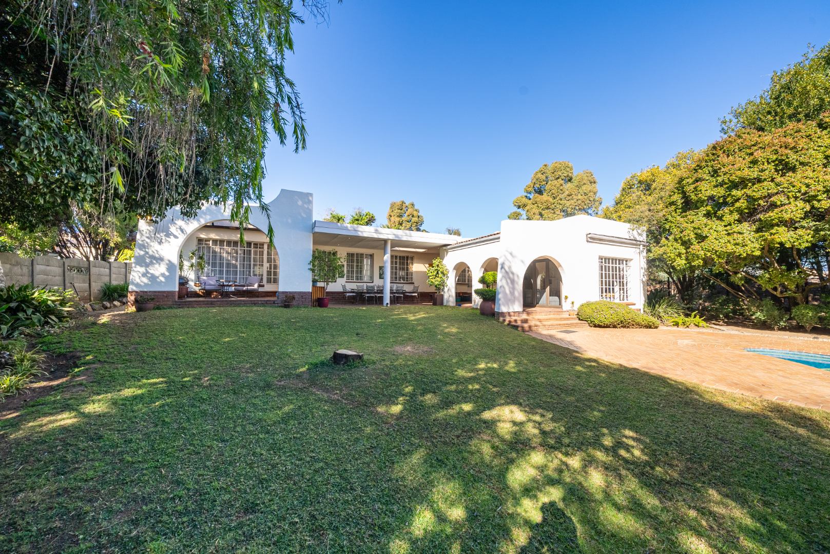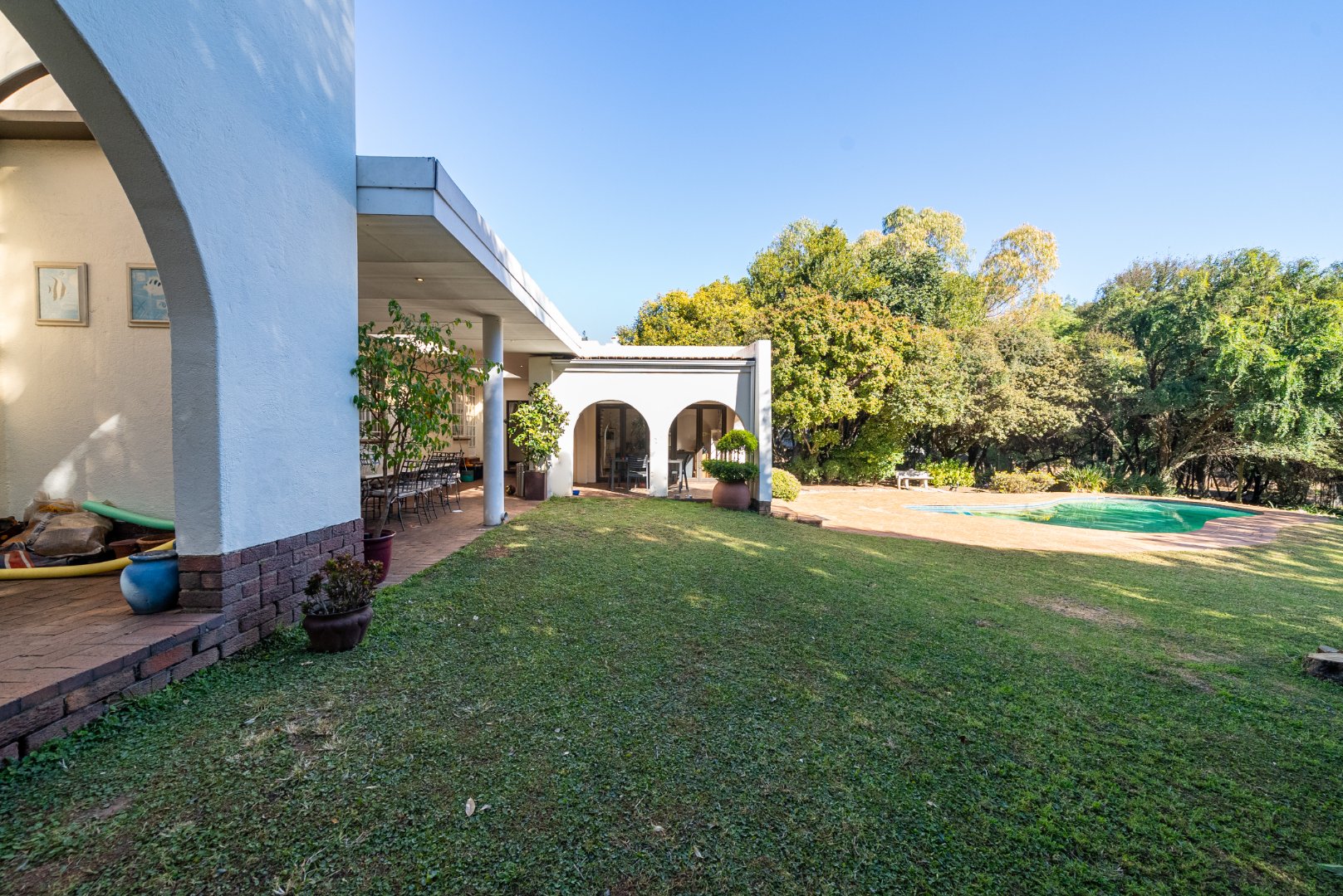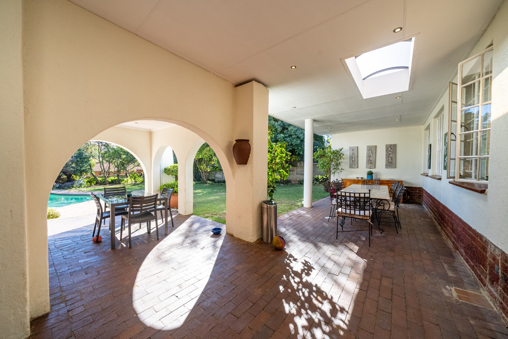 A second lounge, bright and airy, opens up through expansive stacking doors to a generous covered patio. Here, alfresco living takes center stage—overlooking a sparkling pool and lush garden that stretches beyond, this outdoor haven is a true entertainer’s dream.