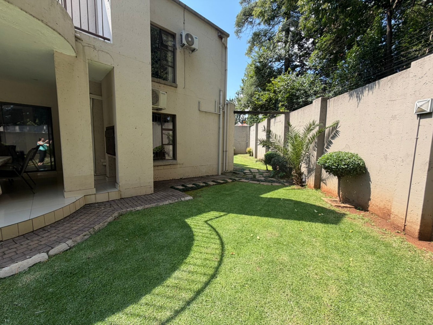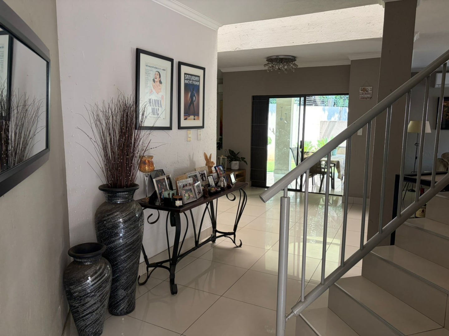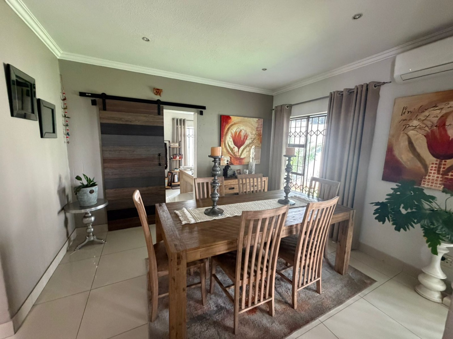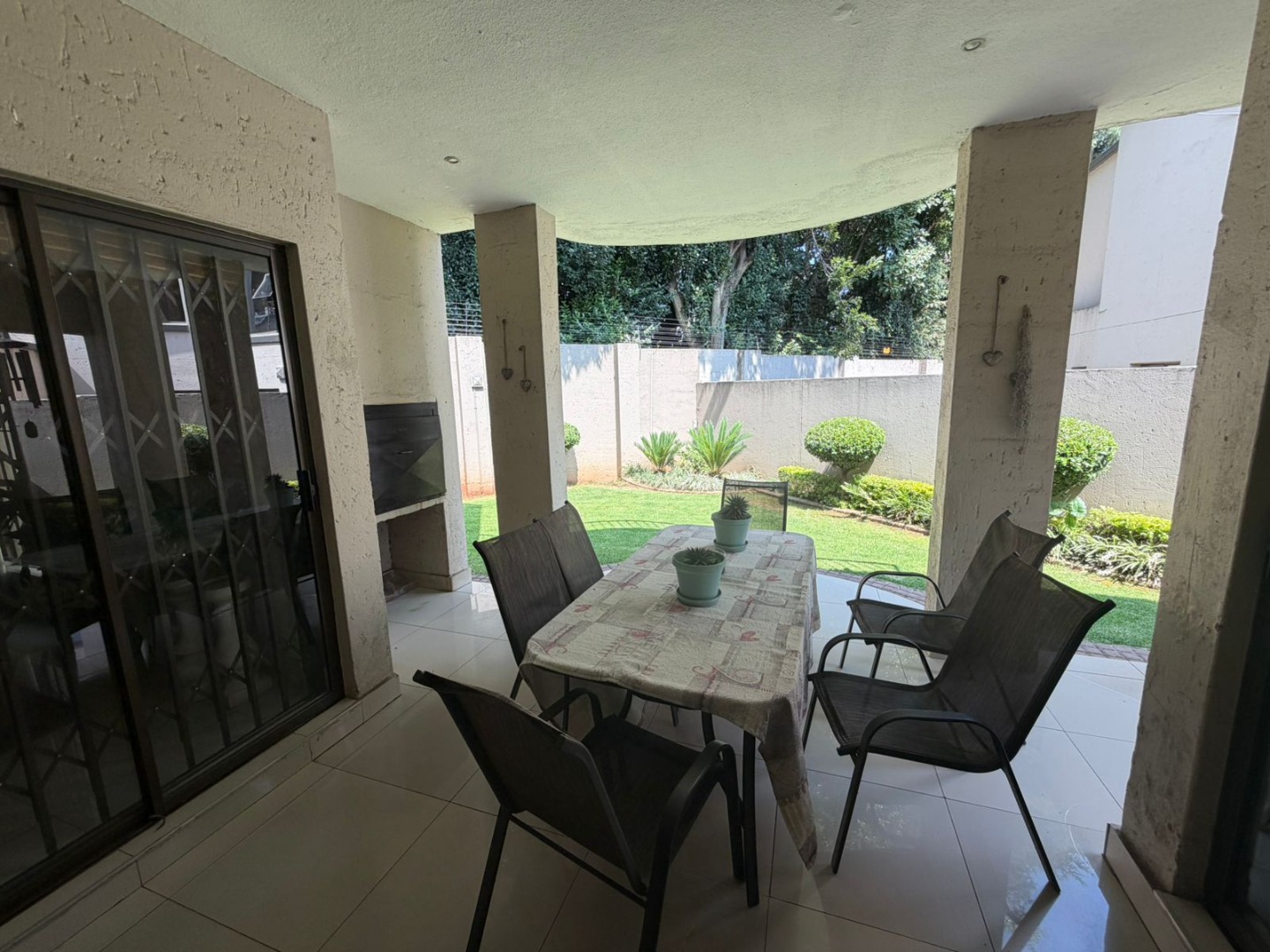 A welcoming entrance leads to light-filled open-plan living and dining areas, beautifully finished with porcelain tiling and enhanced by air conditioning for year-round comfort. The seamless flow extends outdoors to a covered patio with a built-in braai, overlooking a neat, low-maintenance garden—perfect for relaxed entertaining.