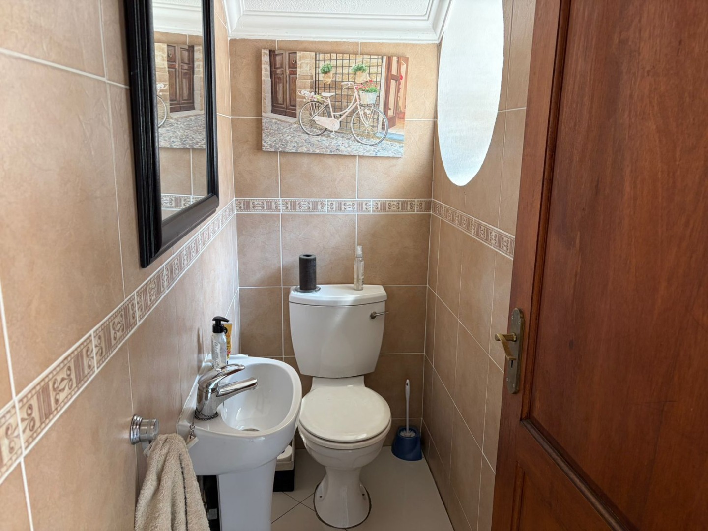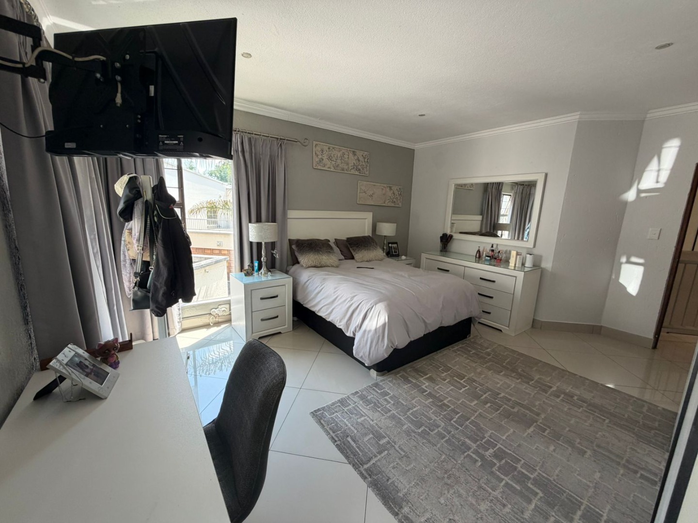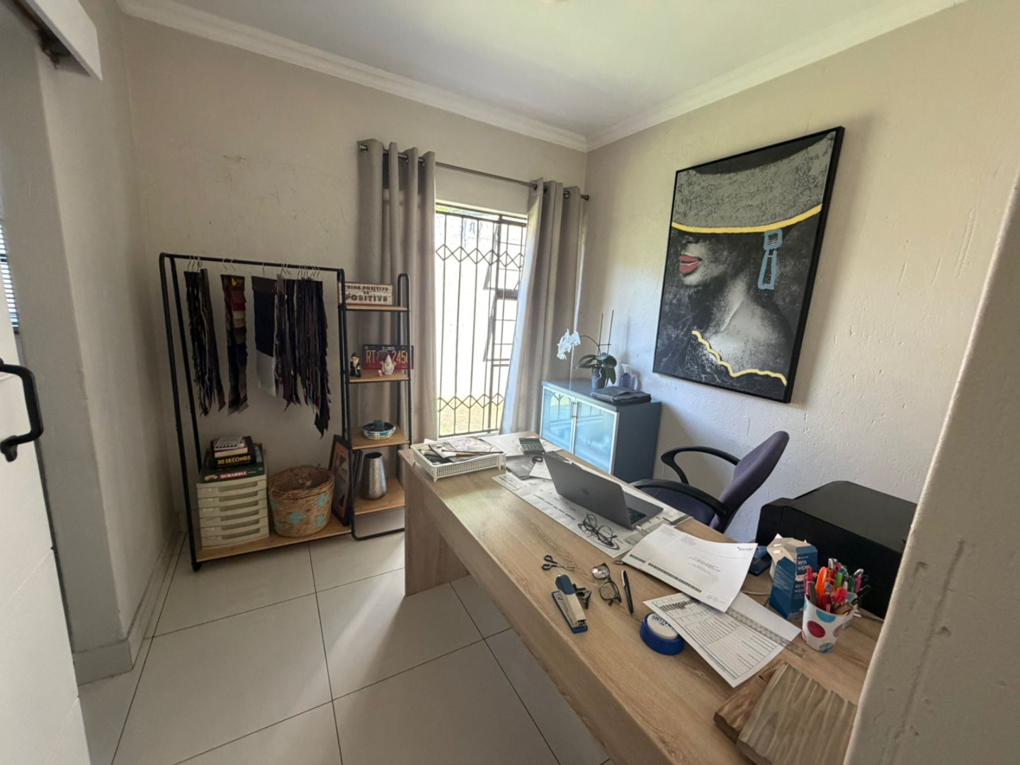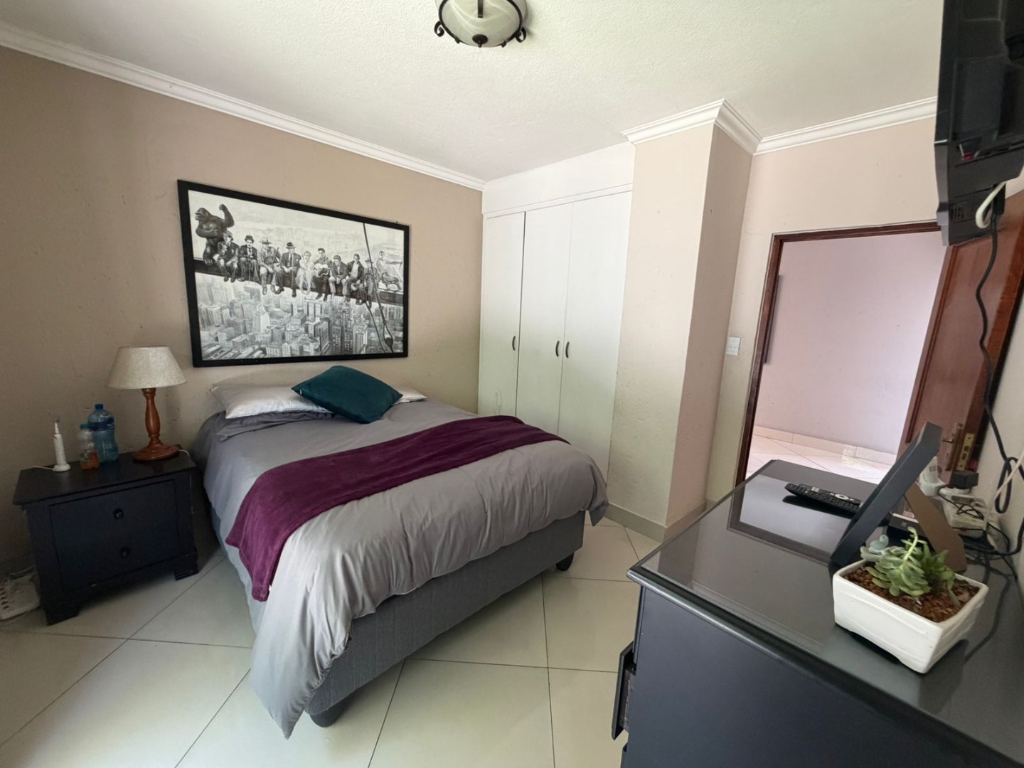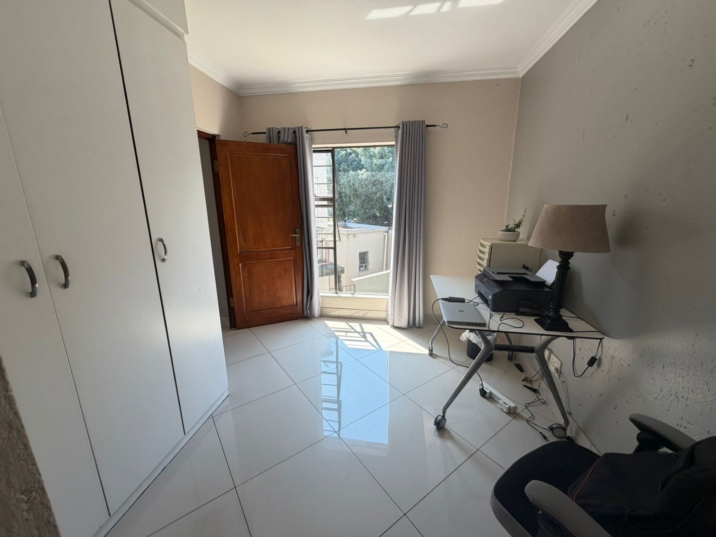 A welcoming entrance leads to light-filled open-plan living and dining areas, beautifully finished with porcelain tiling and enhanced by air conditioning for year-round comfort. The seamless flow extends outdoors to a covered patio with a built-in braai, overlooking a neat, low-maintenance garden—perfect for relaxed entertaining.
