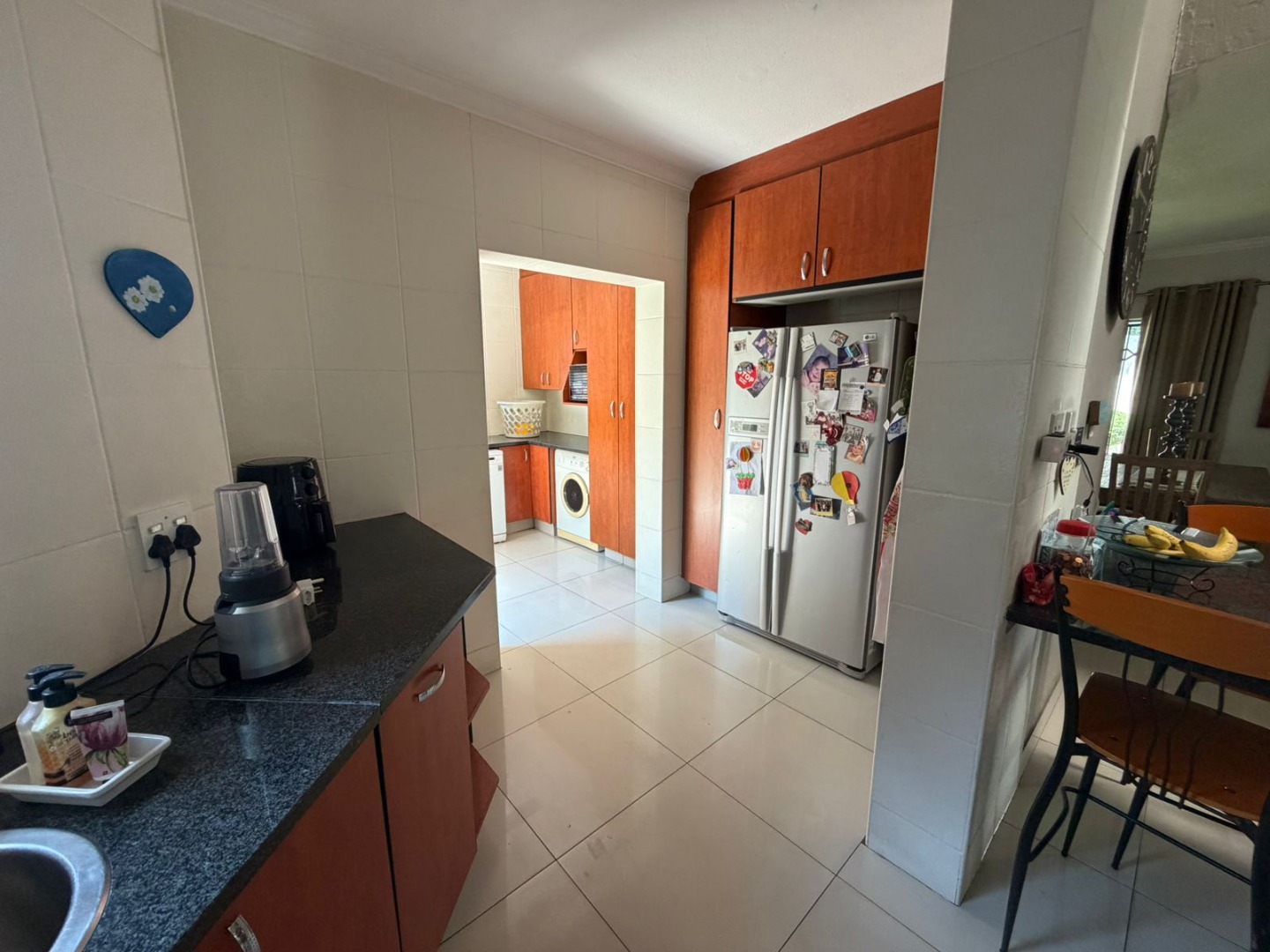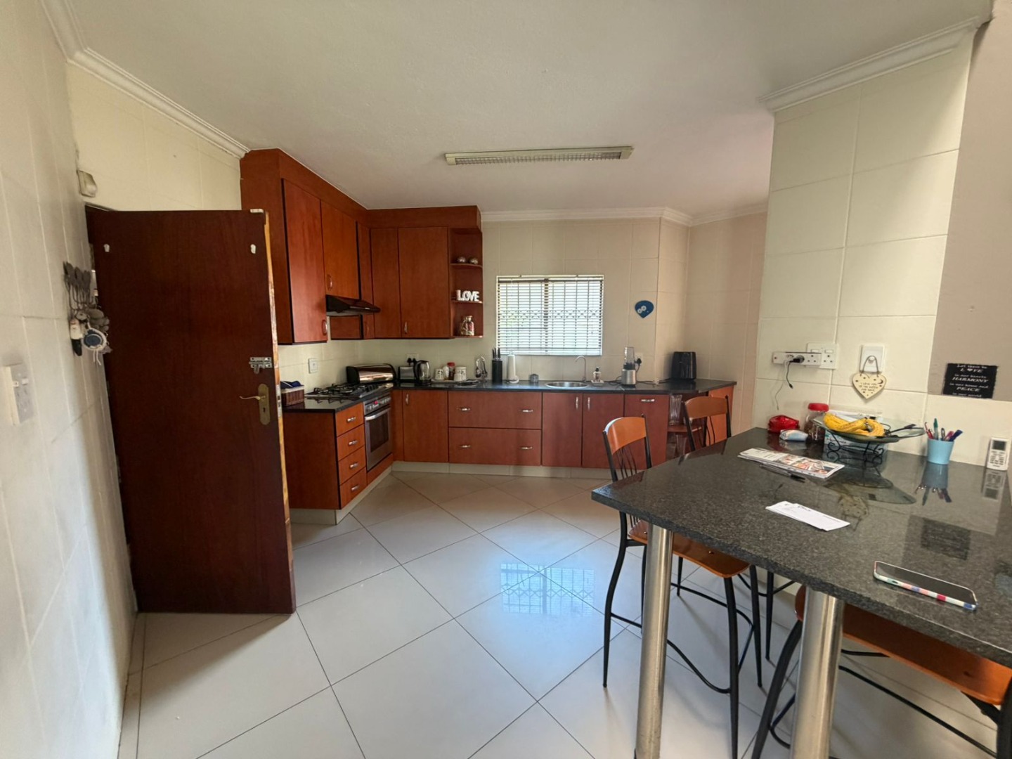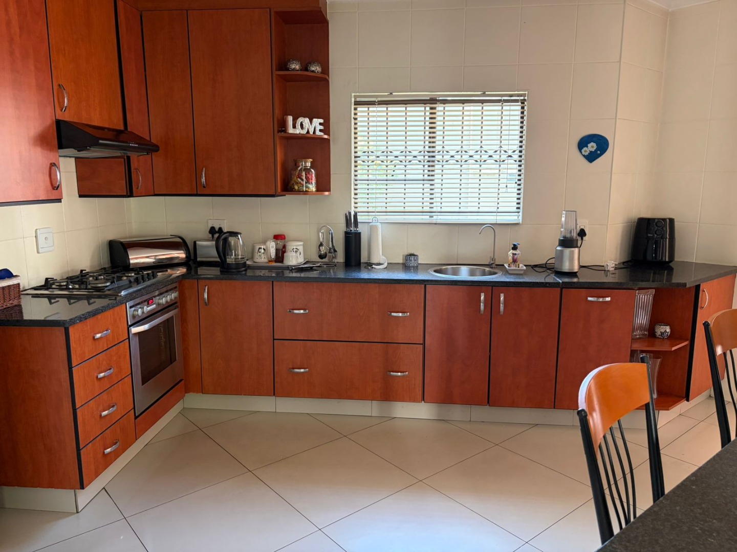 The contemporary kitchen is both stylish and practical, featuring a gas hob ideal for load-shedding, a breakfast nook for casual meals, granite tops, and a separate scullery to keep the main space clutter-free.