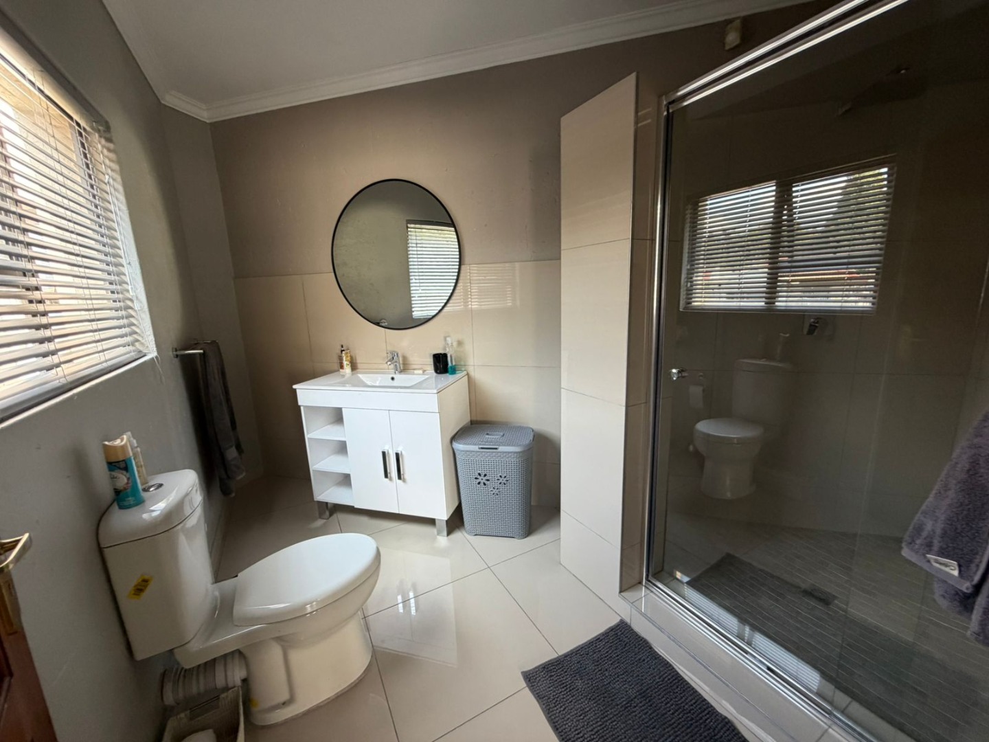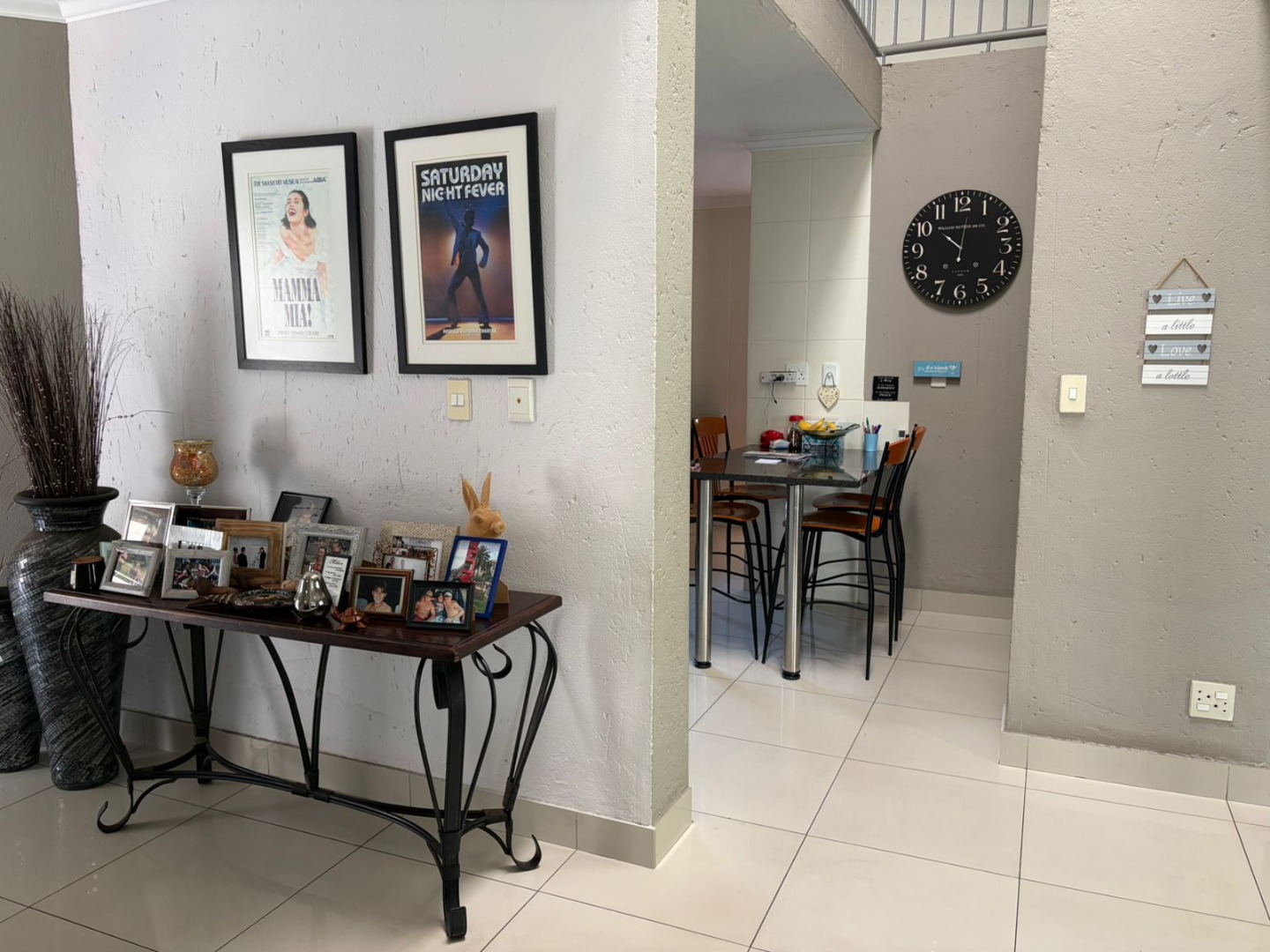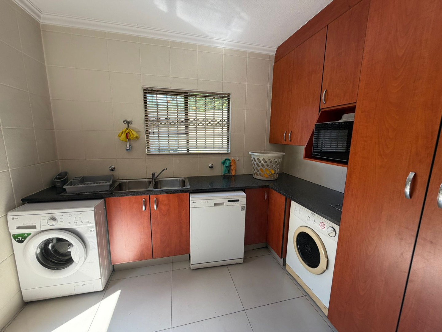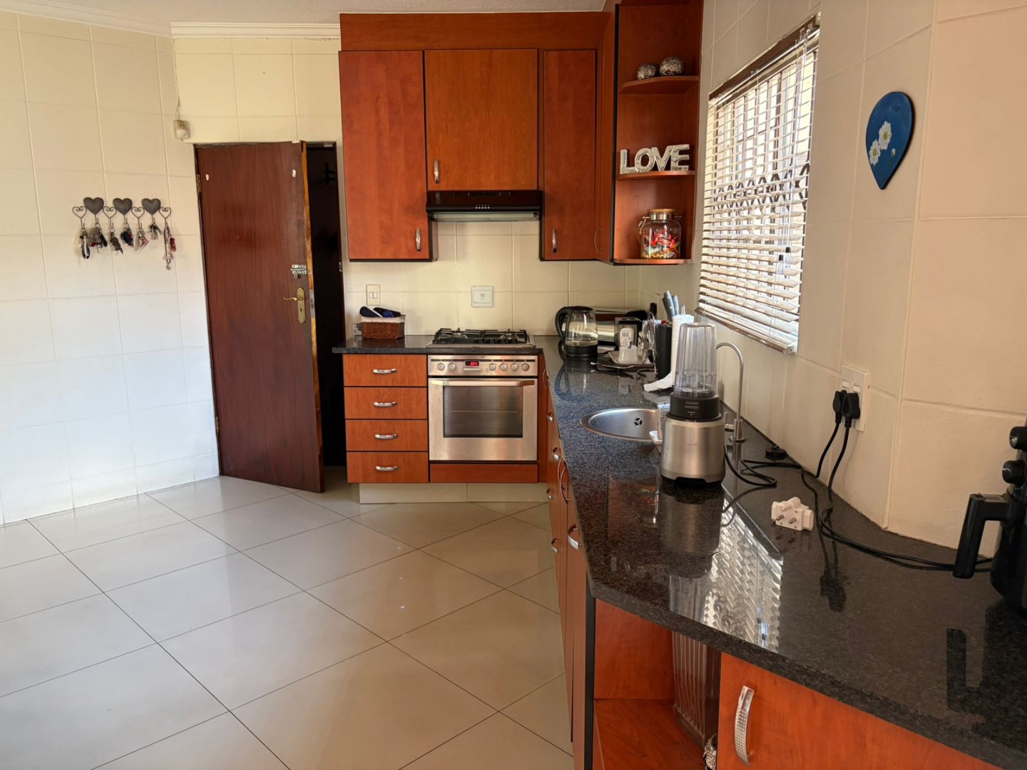 The contemporary kitchen is both stylish and practical, featuring a gas hob ideal for load-shedding, a breakfast nook for casual meals, granite tops, and a separate scullery to keep the main space clutter-free.