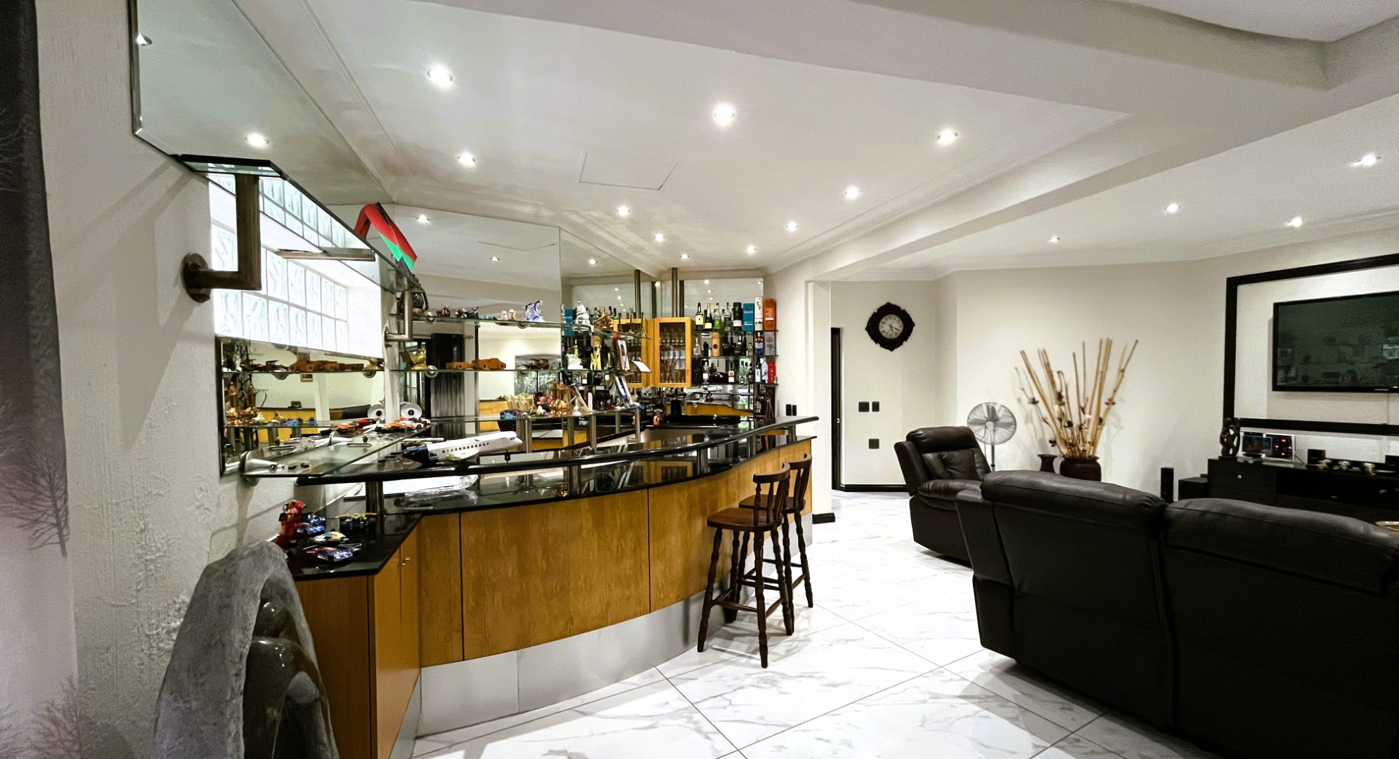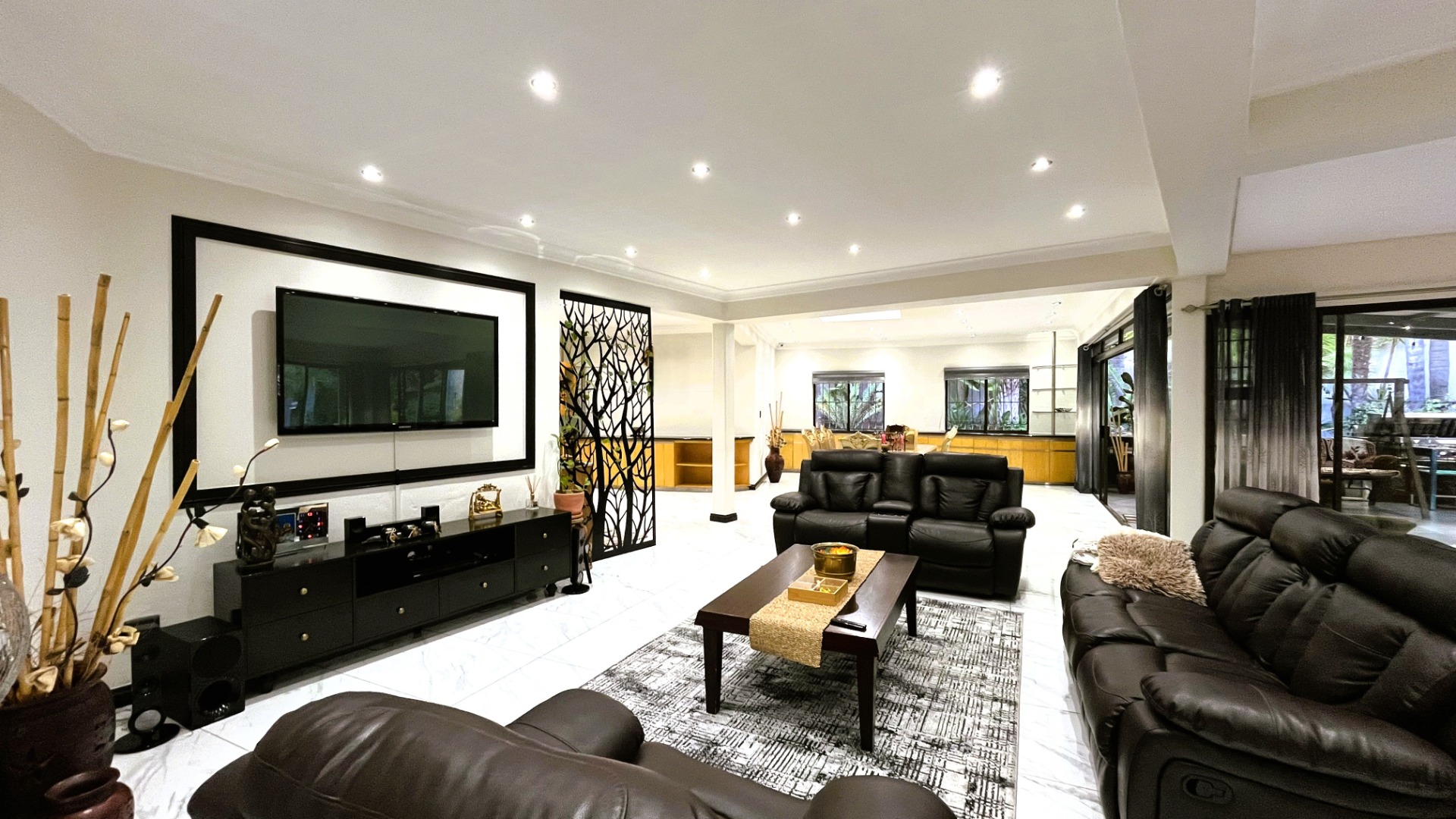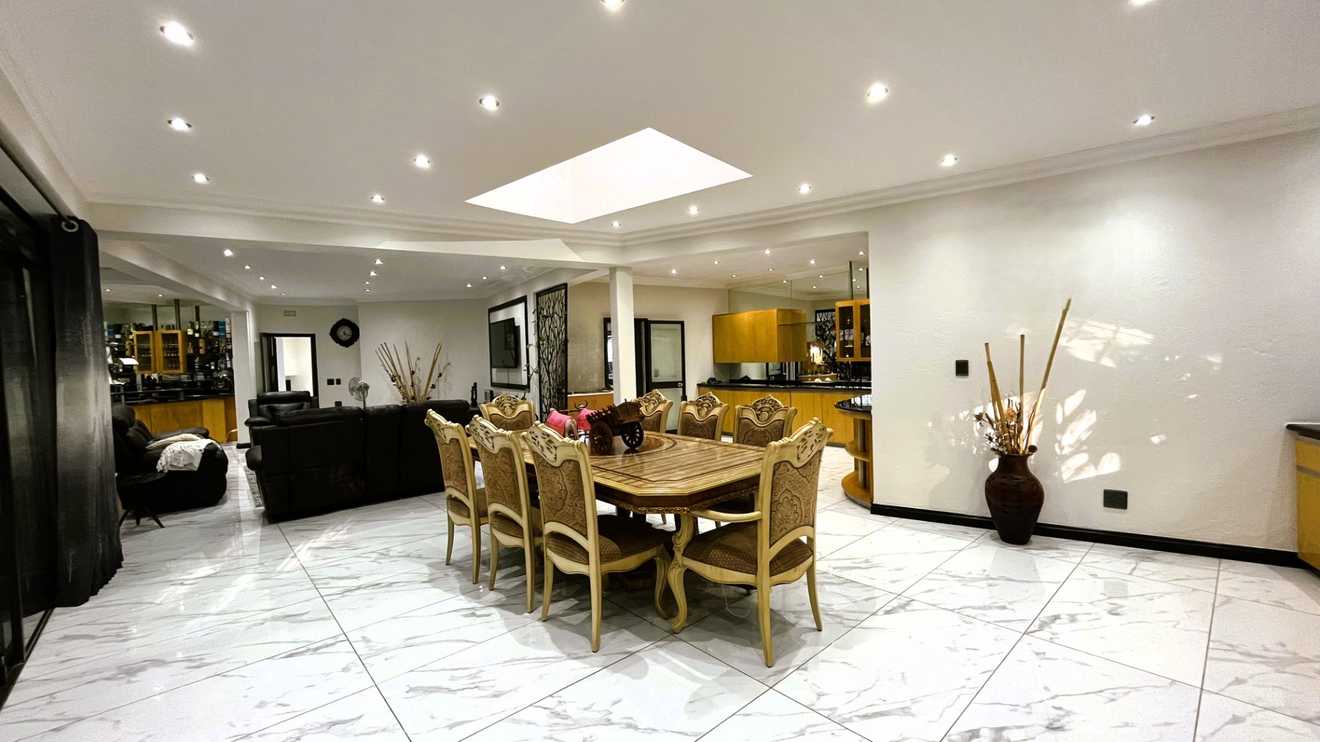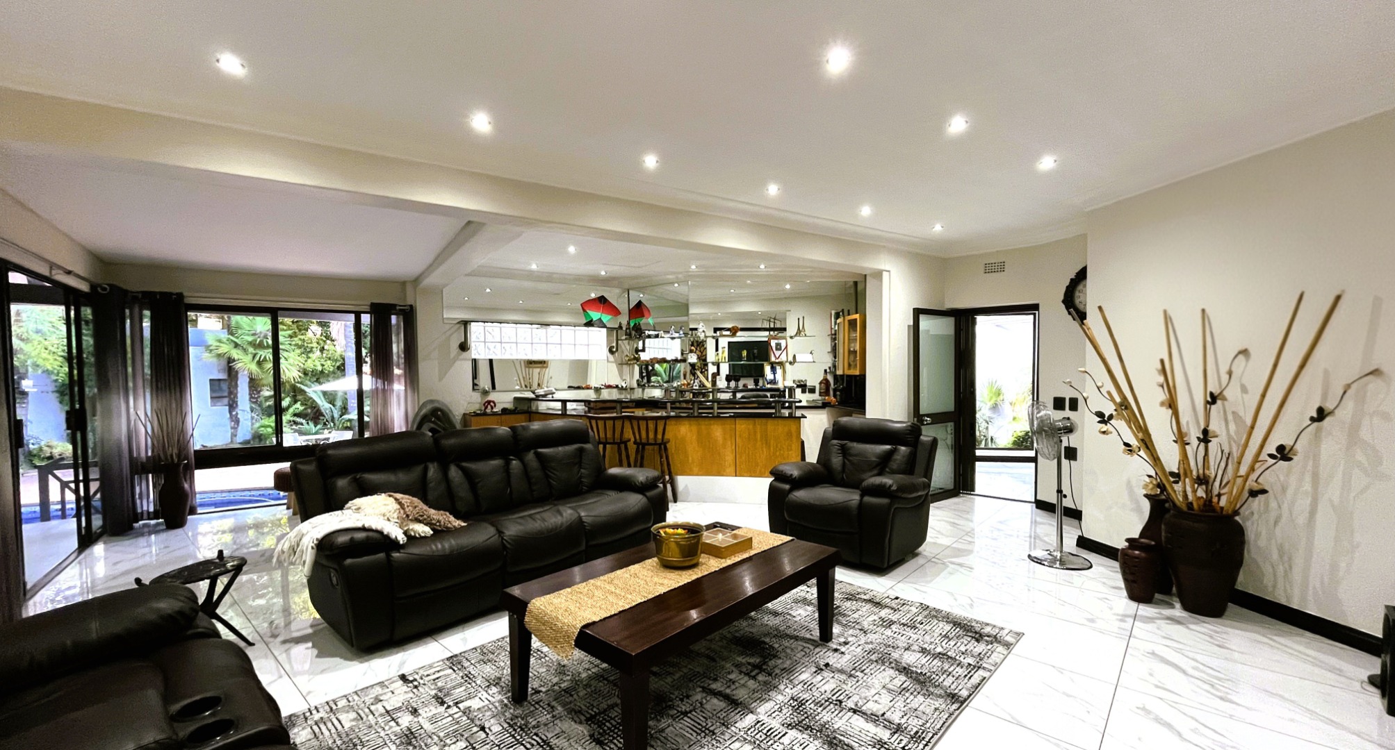 Designed with both relaxation and entertaining in mind, the home features expansive living areas and seamless indoor-outdoor flow. Upon entering, you are welcomed into a formal lounge that forms part of an open-plan layout, leading effortlessly to a built-in bar area and the dining room. The dining space opens through sliding doors to an enclosed patio, creating a versatile entertainment area ideal for year-round gatherings.