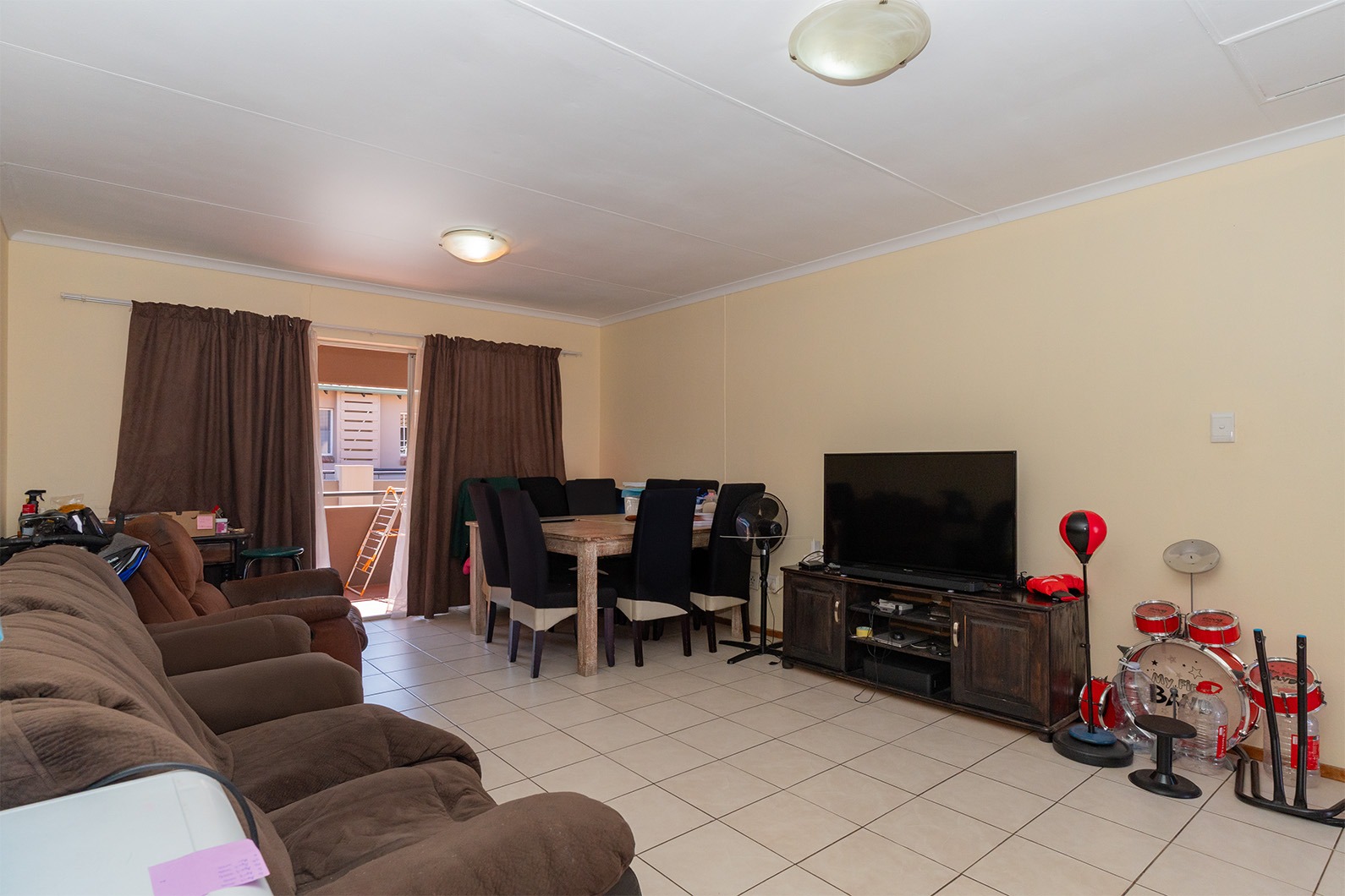 Open plan lounge, dining and kitchen area. Covered balcony off the lounge area. The kitchen offers space for 2 appliances and has ample cupboard space.