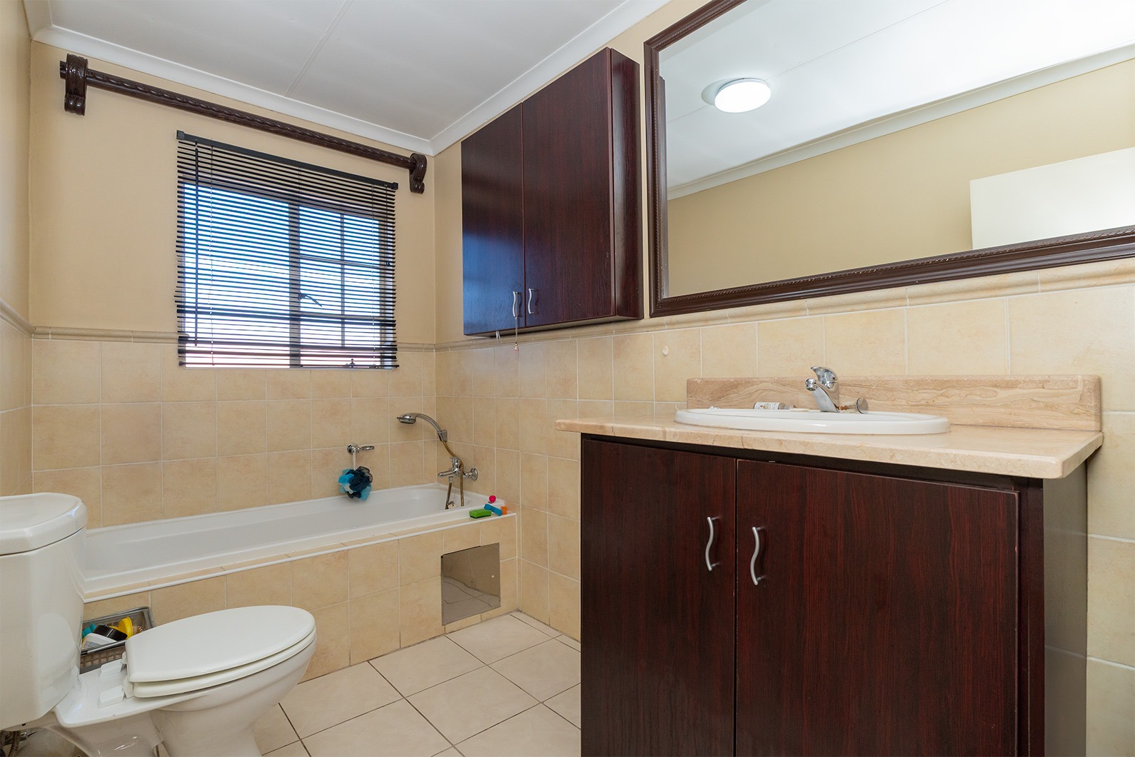 2 Well sized bedrooms and tiled throughout. Main bedroom has an en suite bathroom with a bath and 2nd bathroom has a shower.