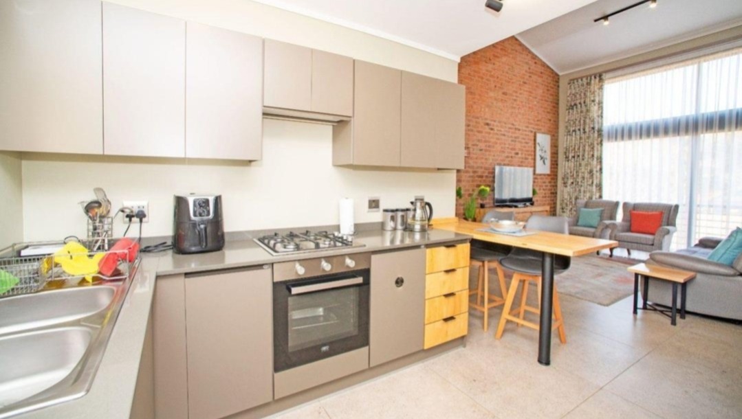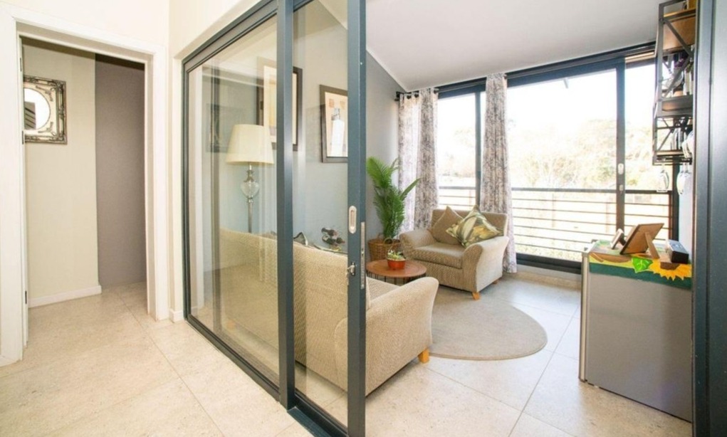 Step inside and you'll find a bright and airy open-plan living space. The kitchen is modern and flows beautifully into the lounge and dining area, complete with a cool exposed brick accent wall and high vaulted ceilings that really open things up. There's also a cozy sunroom or extra living space with floor-to-ceiling windows and glass sliding doors, perfect for enjoying some quiet time or a mini-bar setup.