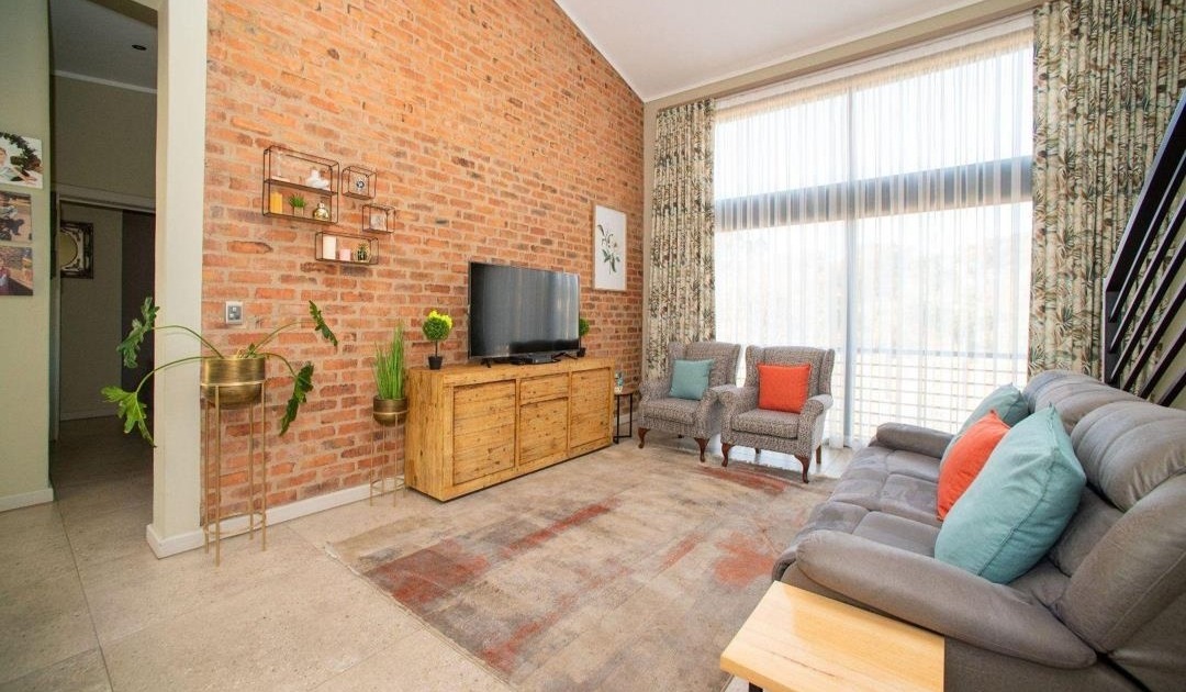 Step inside and you'll find a bright and airy open-plan living space. The kitchen is modern and flows beautifully into the lounge and dining area, complete with a cool exposed brick accent wall and high vaulted ceilings that really open things up. There's also a cozy sunroom or extra living space with floor-to-ceiling windows and glass sliding doors, perfect for enjoying some quiet time or a mini-bar setup.