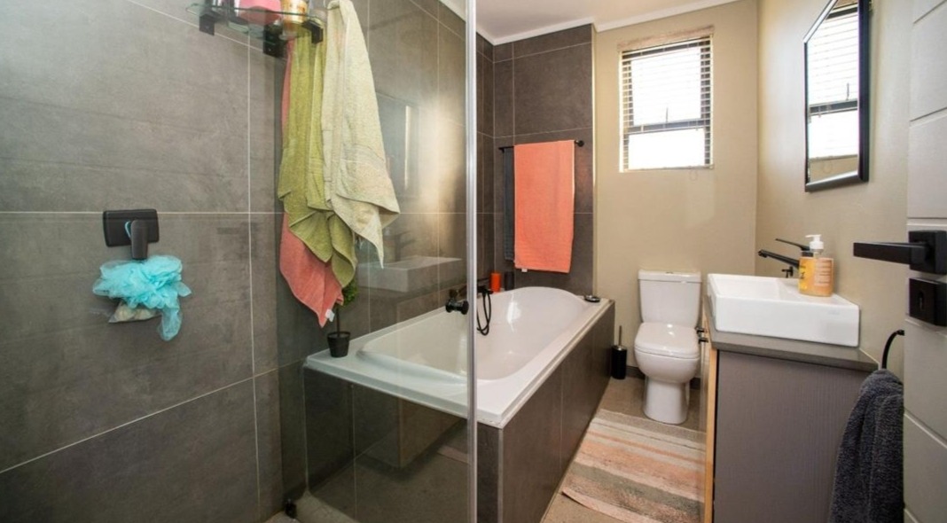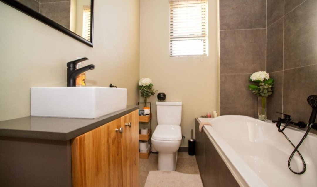 This home offers two comfy bedrooms and two bathrooms, including one en-suite, giving everyone their own space. The bedrooms are bright, with large windows and built-in wardrobes in some, making them practical and inviting. The bathrooms are modern too, with dark grey tiles and sleek black fixtures, like the shower-over-bath combo and a trendy vessel sink.