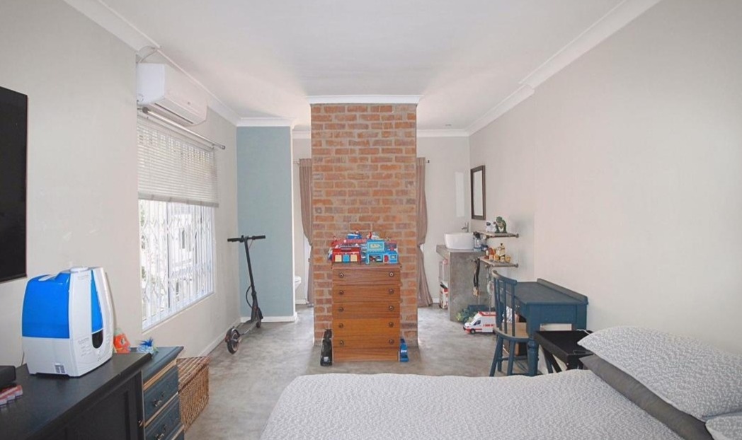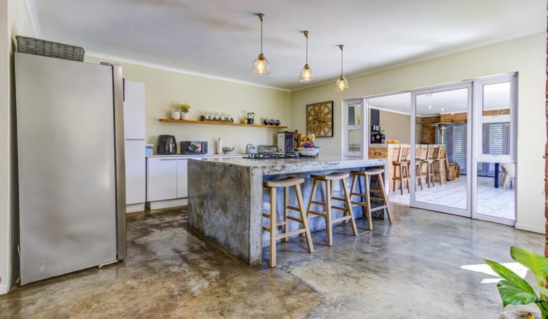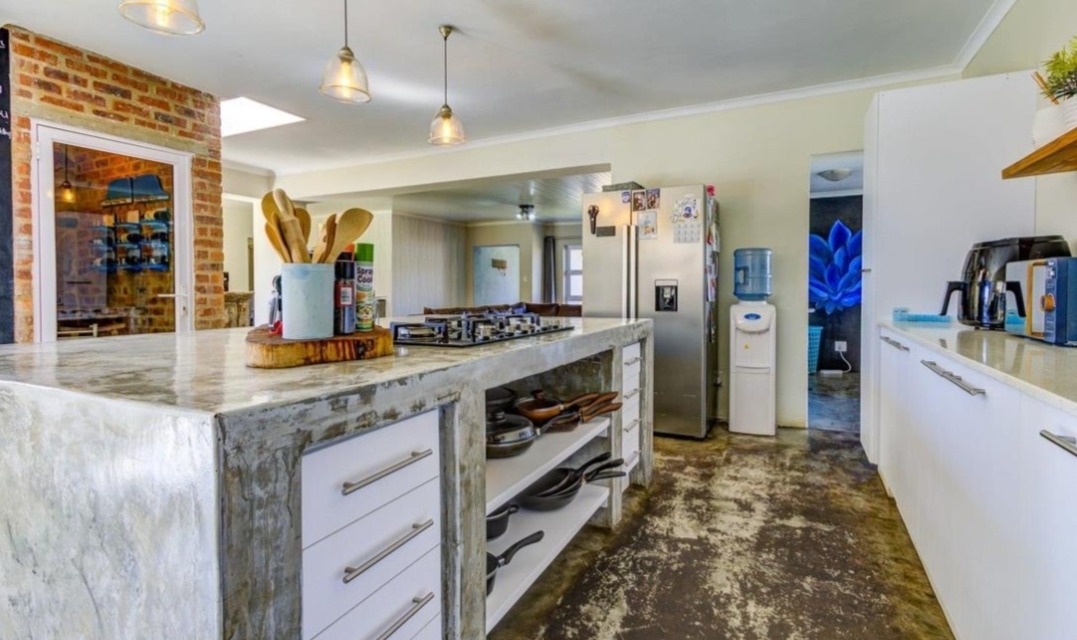 Get ready to discover this awesome home in Farrarmere, Benoni, designed for a relaxed and modern lifestyle. The heart of this place is definitely the super spacious, open-plan kitchen. It’s got a cool industrial vibe with a huge concrete-look island, perfect for whipping up meals or just hanging out. You’ll find sleek white cabinets, stainless steel appliances, an exposed brick accent wall, and even a fun chalkboard wall. Plus, a skylight and big sliding doors let in loads of sunshine, making it feel bright and airy.