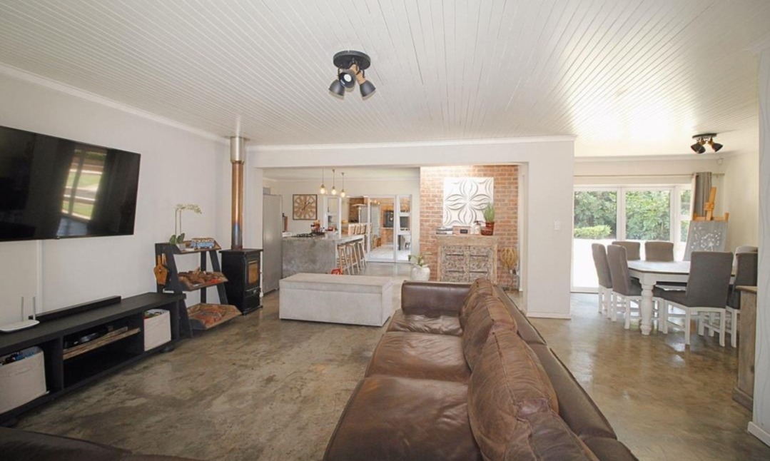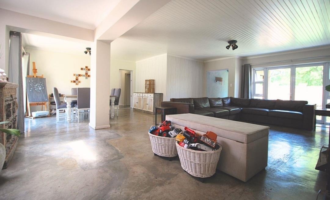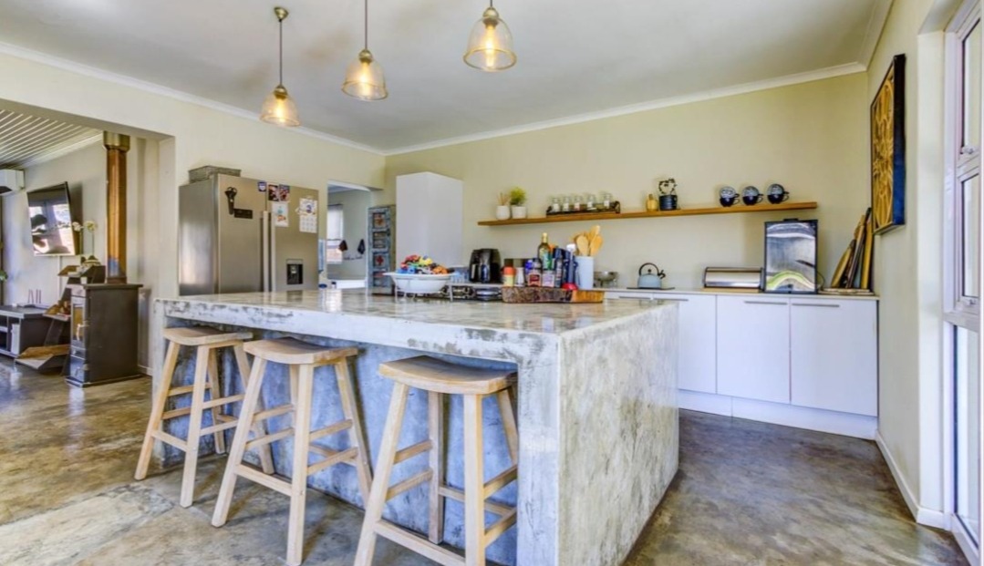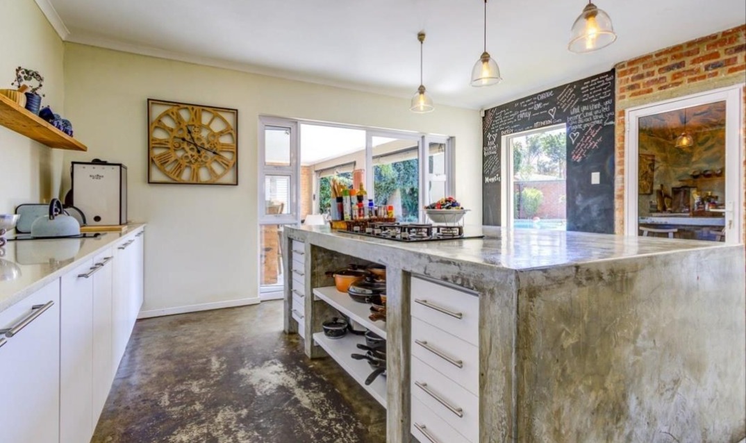 Get ready to discover this awesome home in Farrarmere, Benoni, designed for a relaxed and modern lifestyle. The heart of this place is definitely the super spacious, open-plan kitchen. It’s got a cool industrial vibe with a huge concrete-look island, perfect for whipping up meals or just hanging out. You’ll find sleek white cabinets, stainless steel appliances, an exposed brick accent wall, and even a fun chalkboard wall. Plus, a skylight and big sliding doors let in loads of sunshine, making it feel bright and airy.