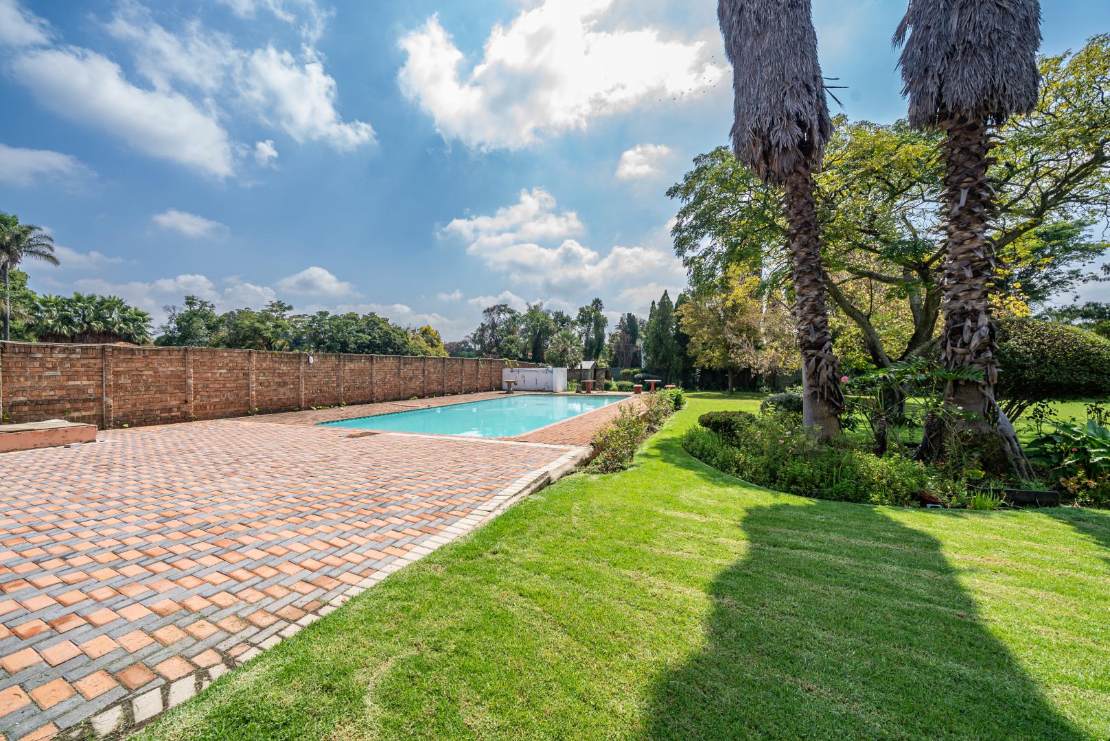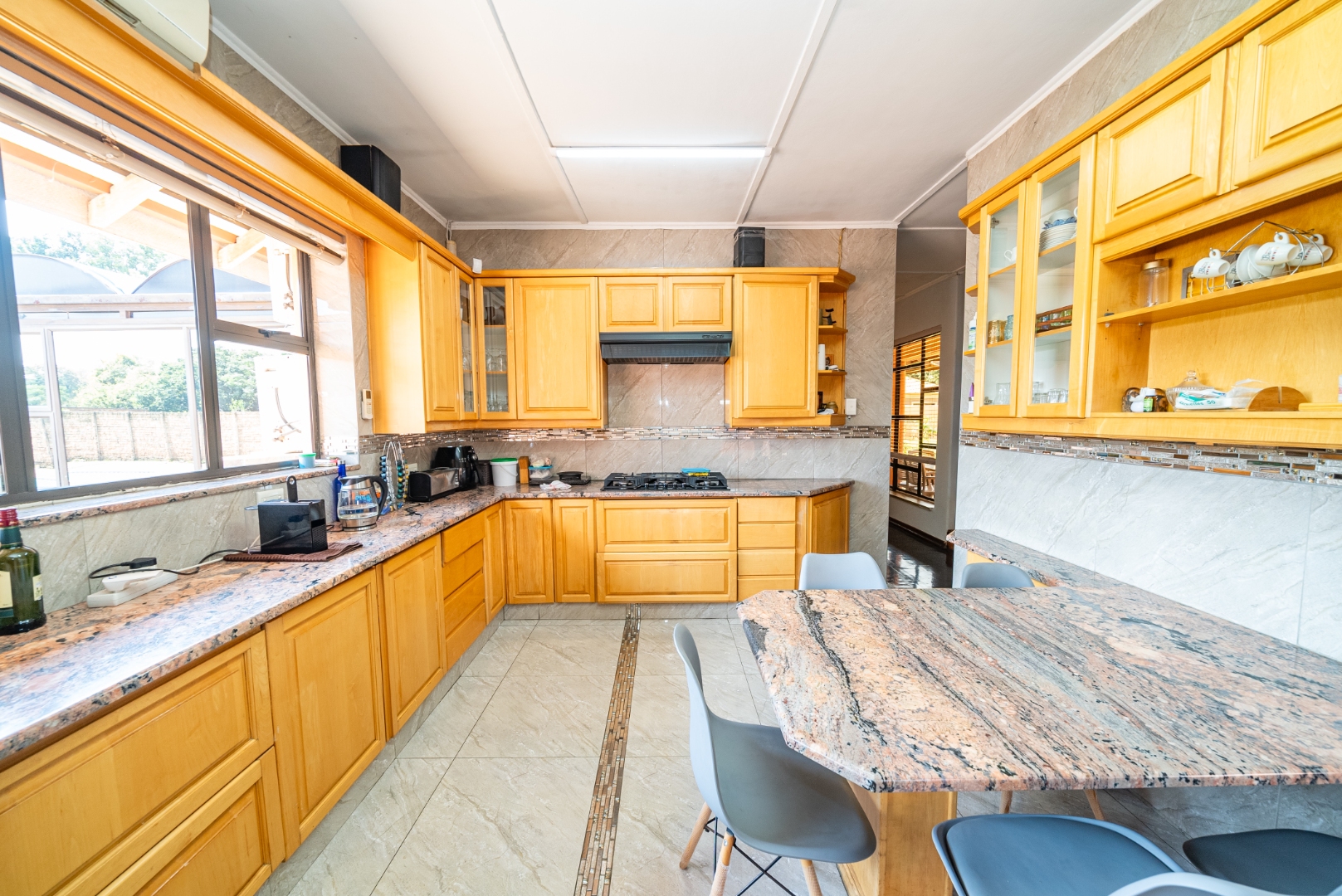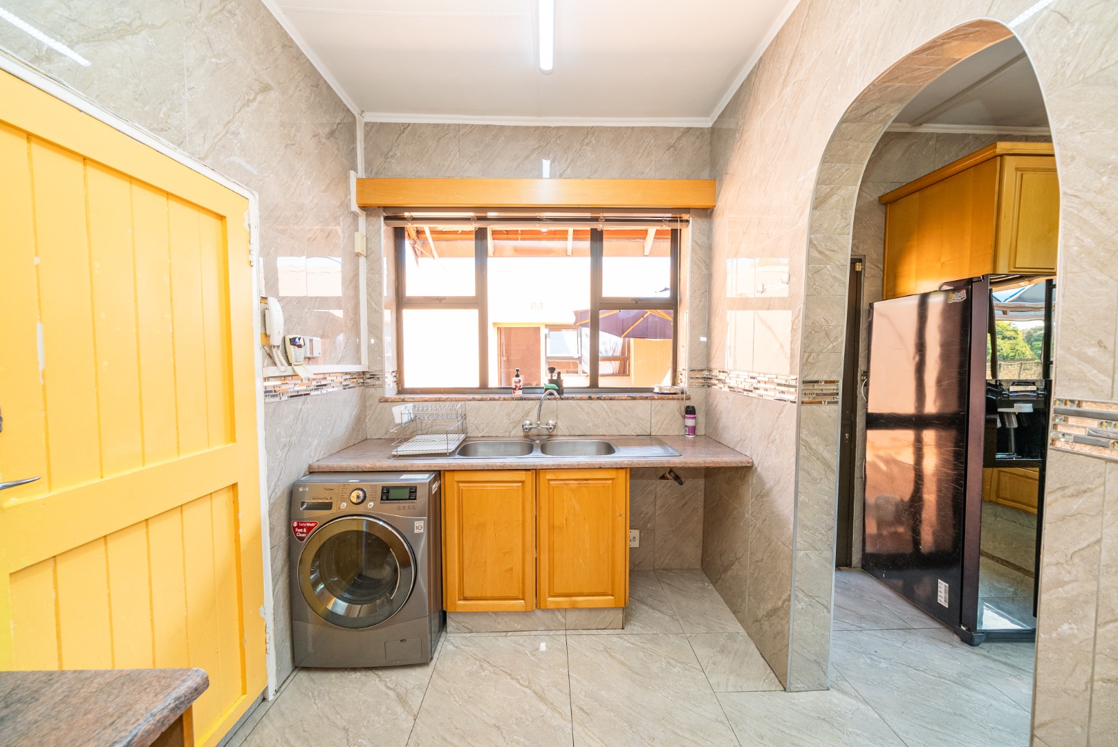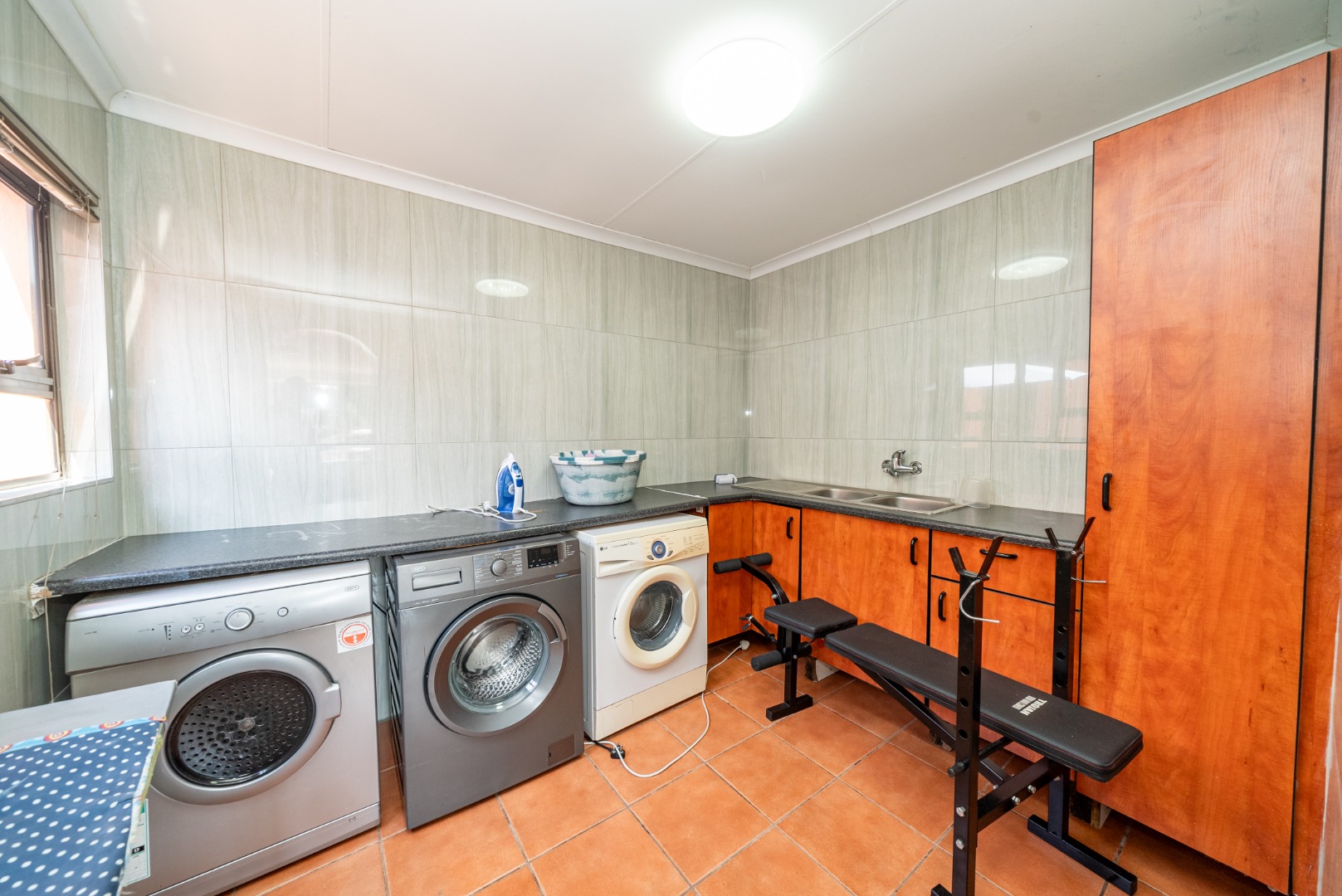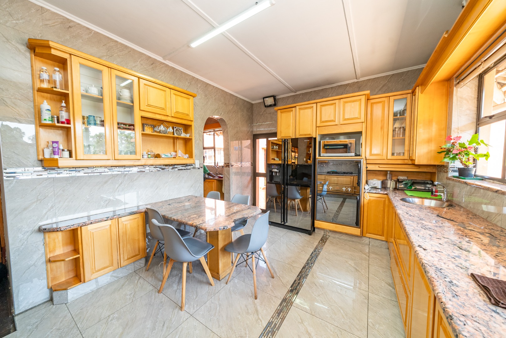 Accommodation includes three more comfortable bedrooms, complemented by 1.5 bathrooms, providing convenience for the entire household. Practical amenities are abundant, with staff quarters, a laundry room, and an impressive eight garages, offering extensive parking and storage solutions.
