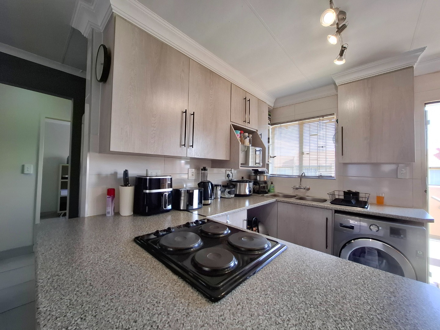 The modern kitchen is equipped with light wood-look cabinets, offering ample storage solutions. It boasts generous speckled laminate countertops, an integrated oven/hob on the island, and space for an integrated washing machine, catering to all your culinary needs.