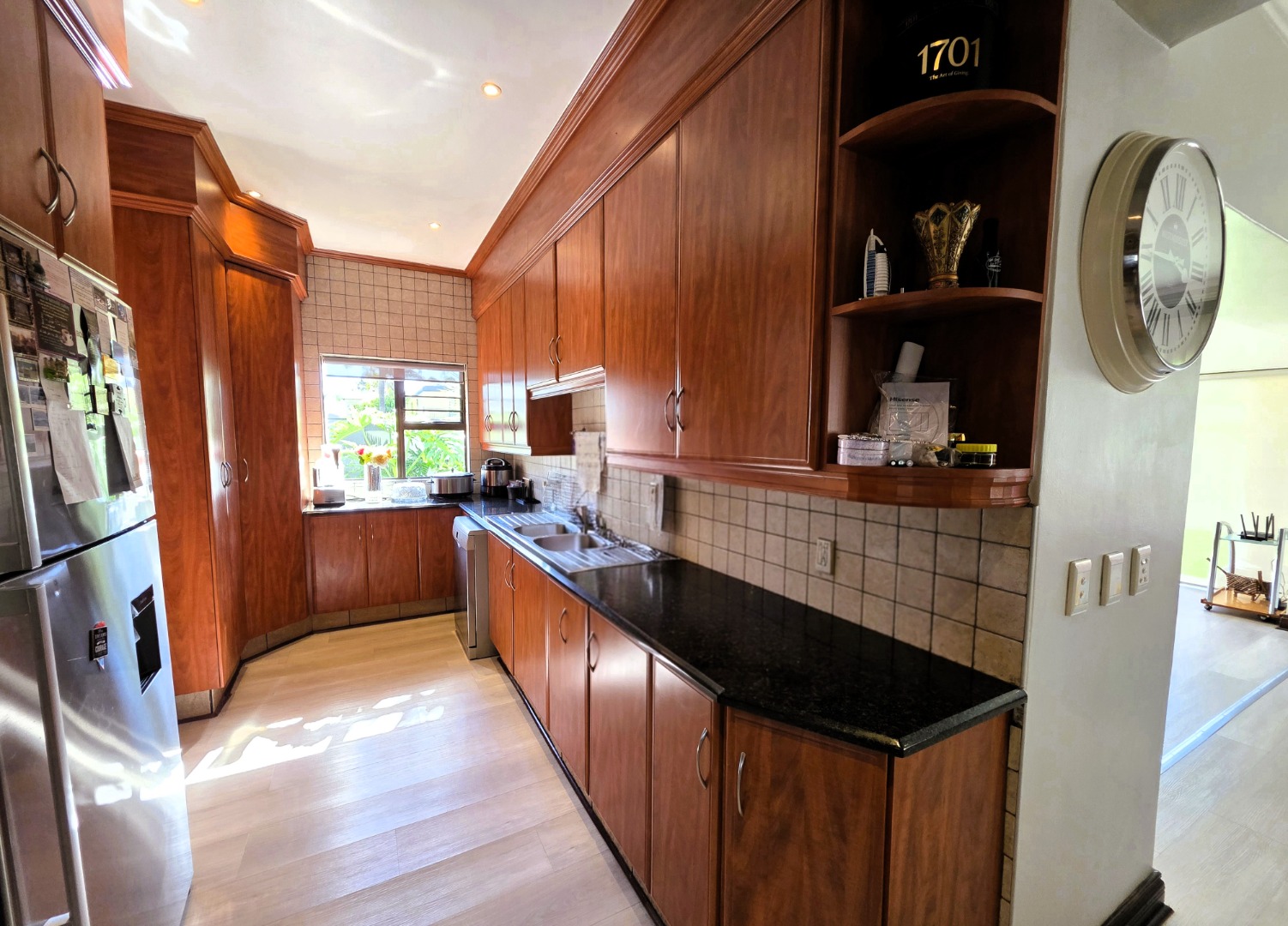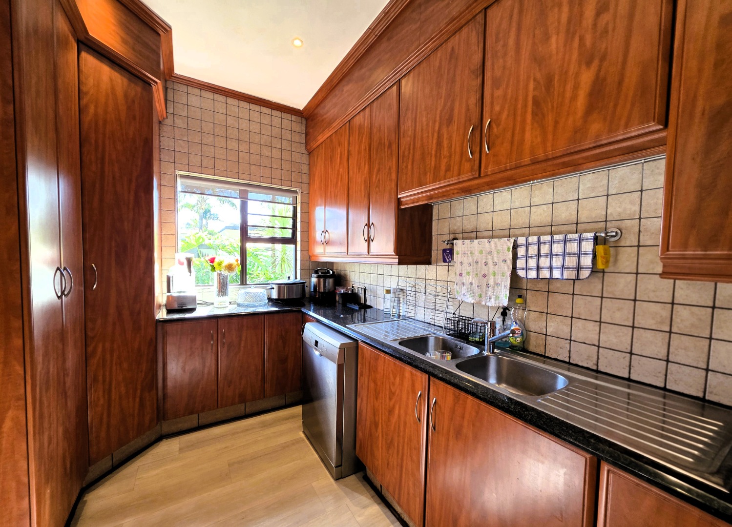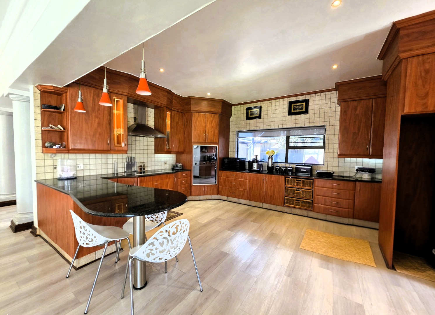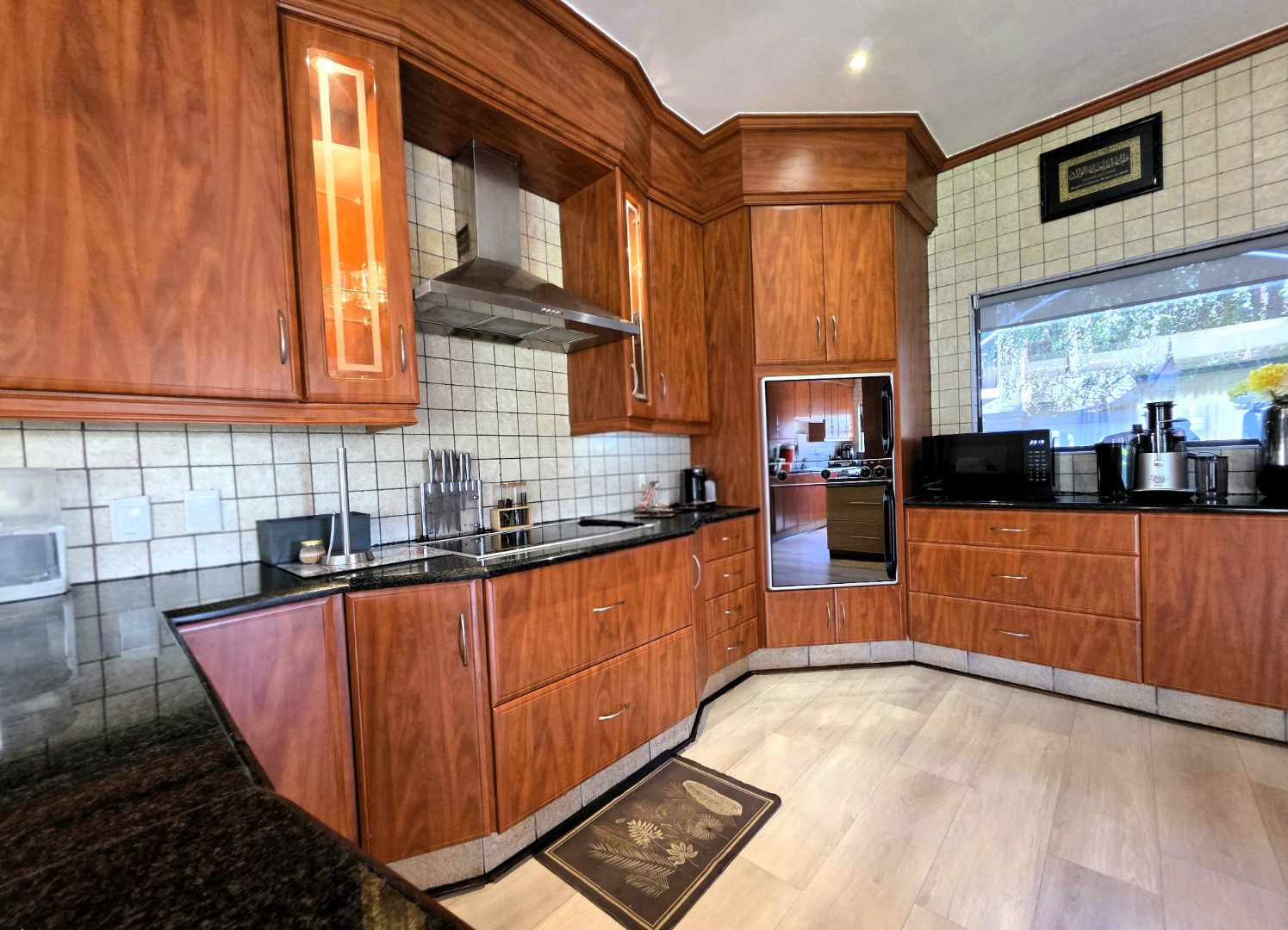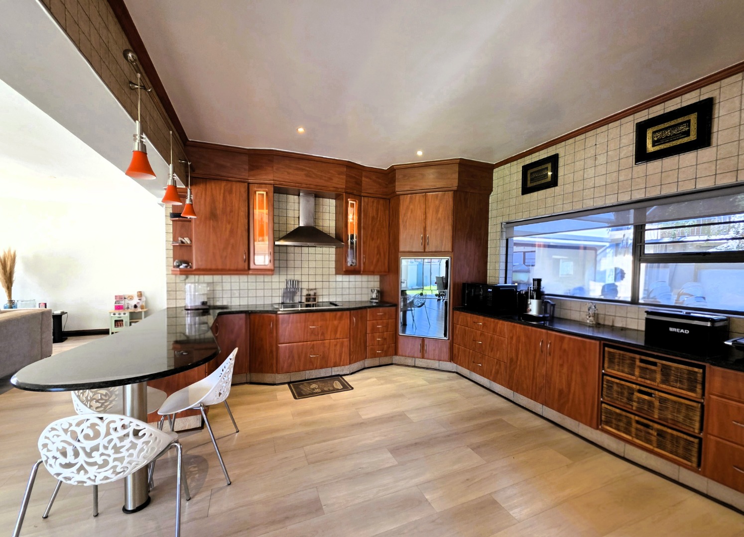 The well-appointed kitchen features granite countertops, a breakfast nook, ample wooden cabinetry, double eye-level ovens, an extractor fan, and a separate scullery for added convenience.
