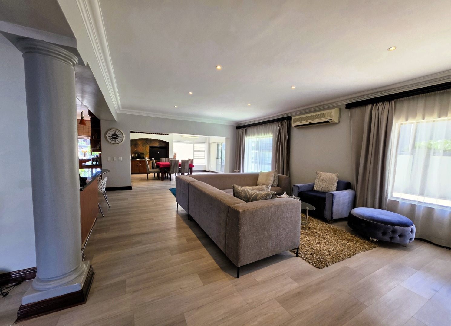 Recently modernized with brand-new wooden laminate flooring throughout, the property showcases stylish finishes and a contemporary open-plan layout. The ground floor comprises a spacious kitchen, a formal living area, and a dining room positioned within the enclosed entertainment patio, which opens onto the garden and pool area—creating the perfect setting for both everyday living and entertaining.