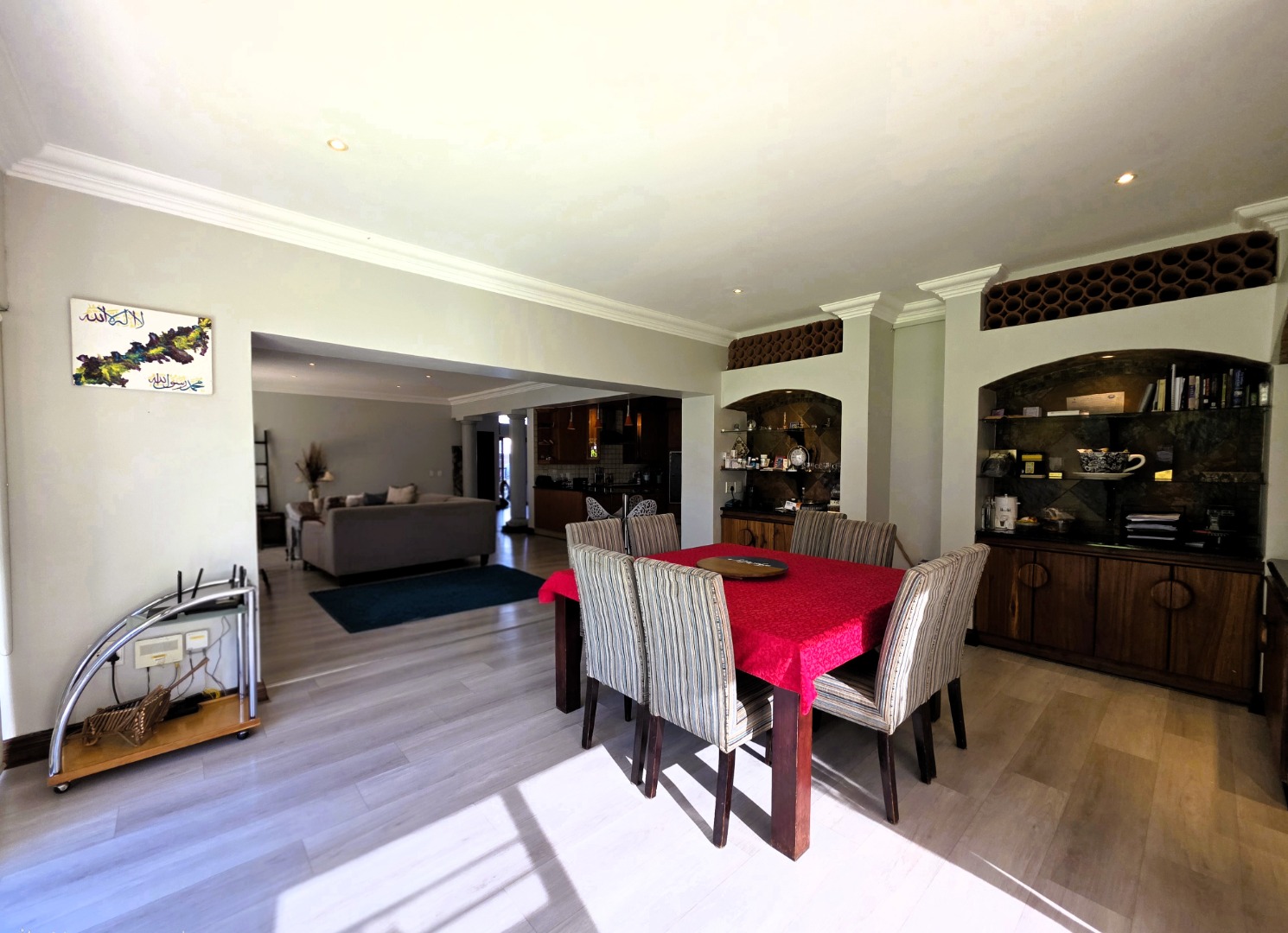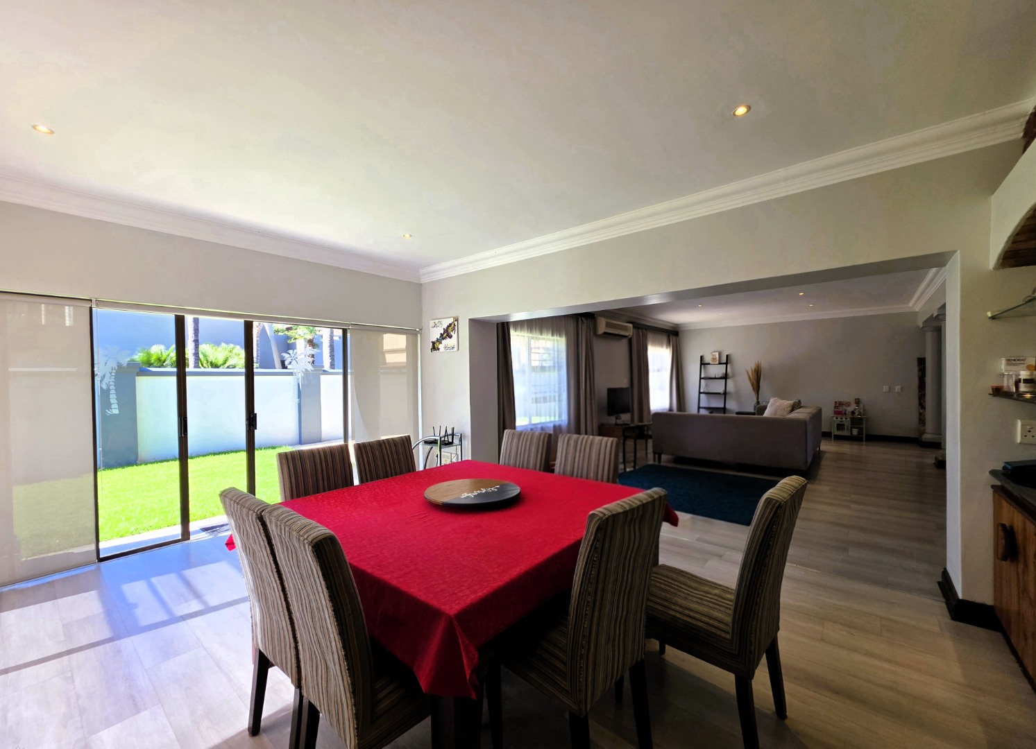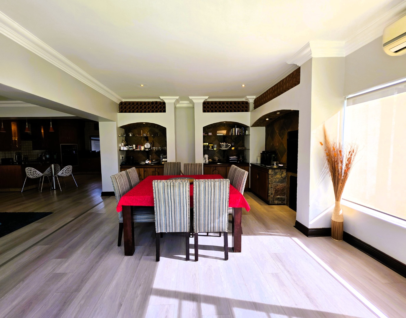 The dining and entertainment area includes a built-in braai, elegant display shelving, and a wine rack above, offering a warm and inviting space for hosting guests. Large aluminum-framed windows allow natural light to flood the living areas, enhancing the home’s bright and airy atmosphere.