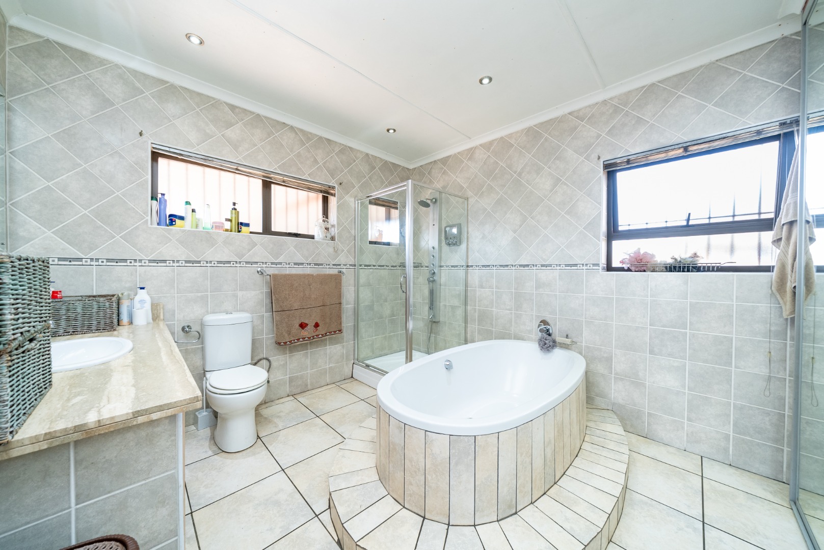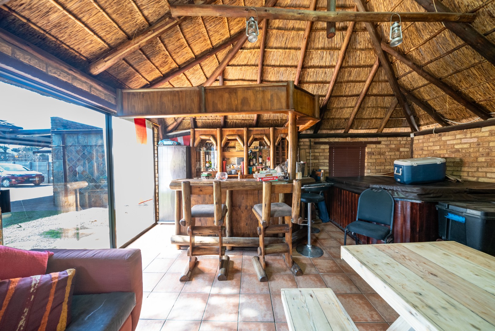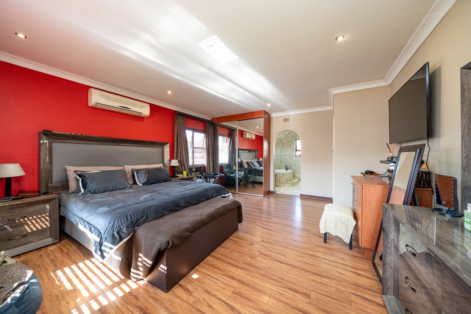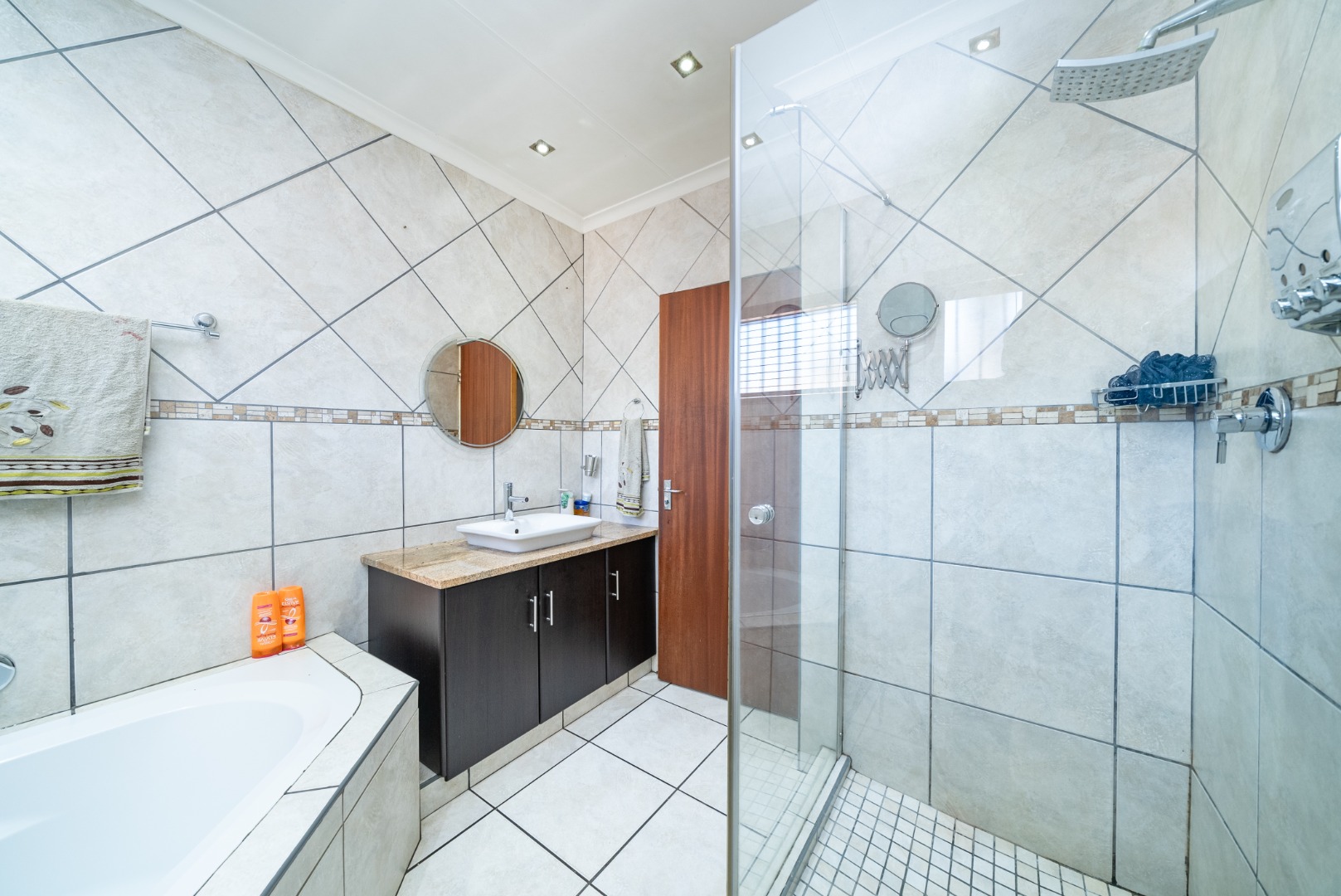 Outdoors, enjoy a landscaped garden surrounding a heated swimming pool, ideal for relaxed family living. The entertainment area includes a lapa with a built-in bar and jacuzzi, making it perfect for hosting guests.