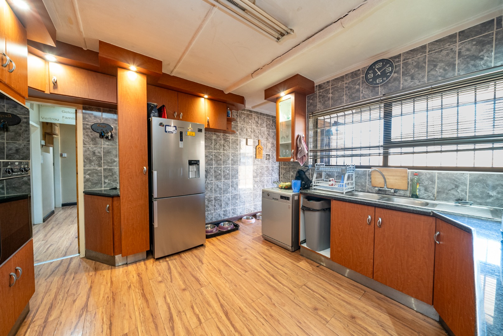 The home features four generously sized bedrooms, all fitted with ample built-in cupboards, and two full bathrooms, including a private en-suite to the main bedroom.