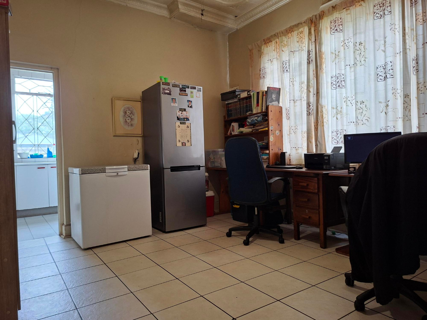 Inside, the functional layout encompasses a comfortable lounge and a dedicated dining room. The kitchen is equipped with an electric stove/oven, ample white cabinetry, and a convenient pantry. This space offers a solid foundation with potential for modern updates. Versatile additional rooms can easily adapt as a home office or media room, catering to various family needs.